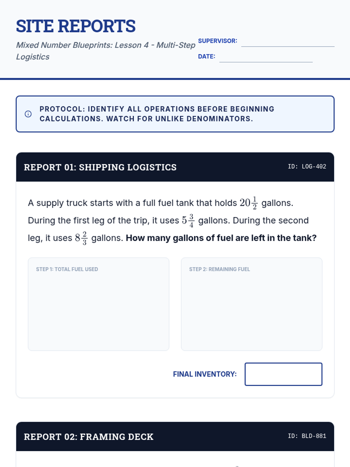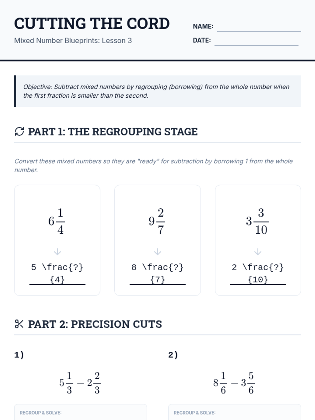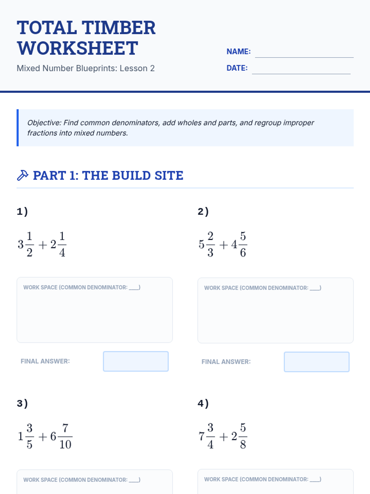 A comprehensive math sequence for 6th graders focusing on adding and subtracting mixed numbers with an emphasis on regrouping and real-world application through an architectural lens. Students progress from estimation to complex multi-step problems and a final tiny home design project.