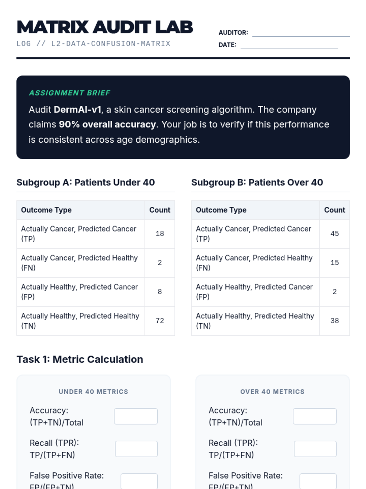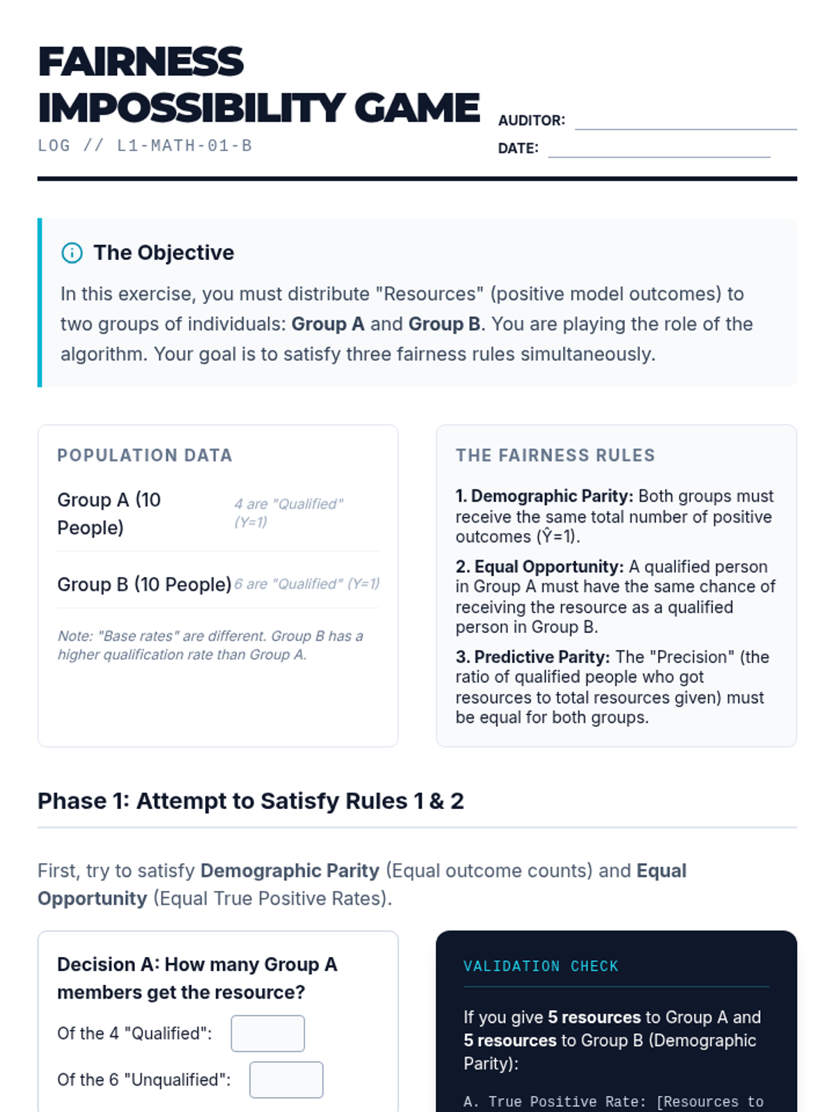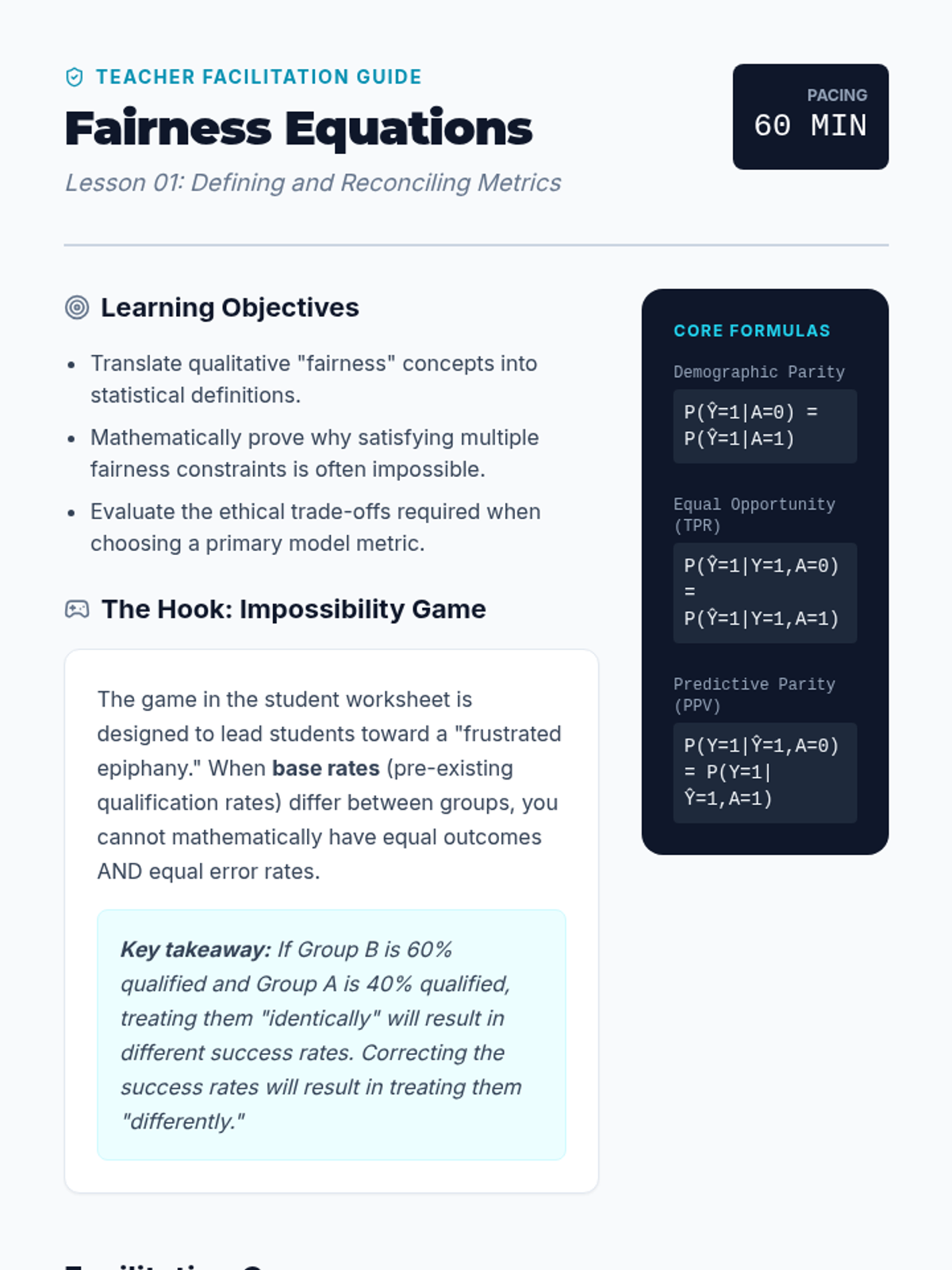 A technical workshop sequence for 12th-grade students to learn how to mathematically define, measure, and audit fairness in machine learning models using industry-standard metrics and tools.