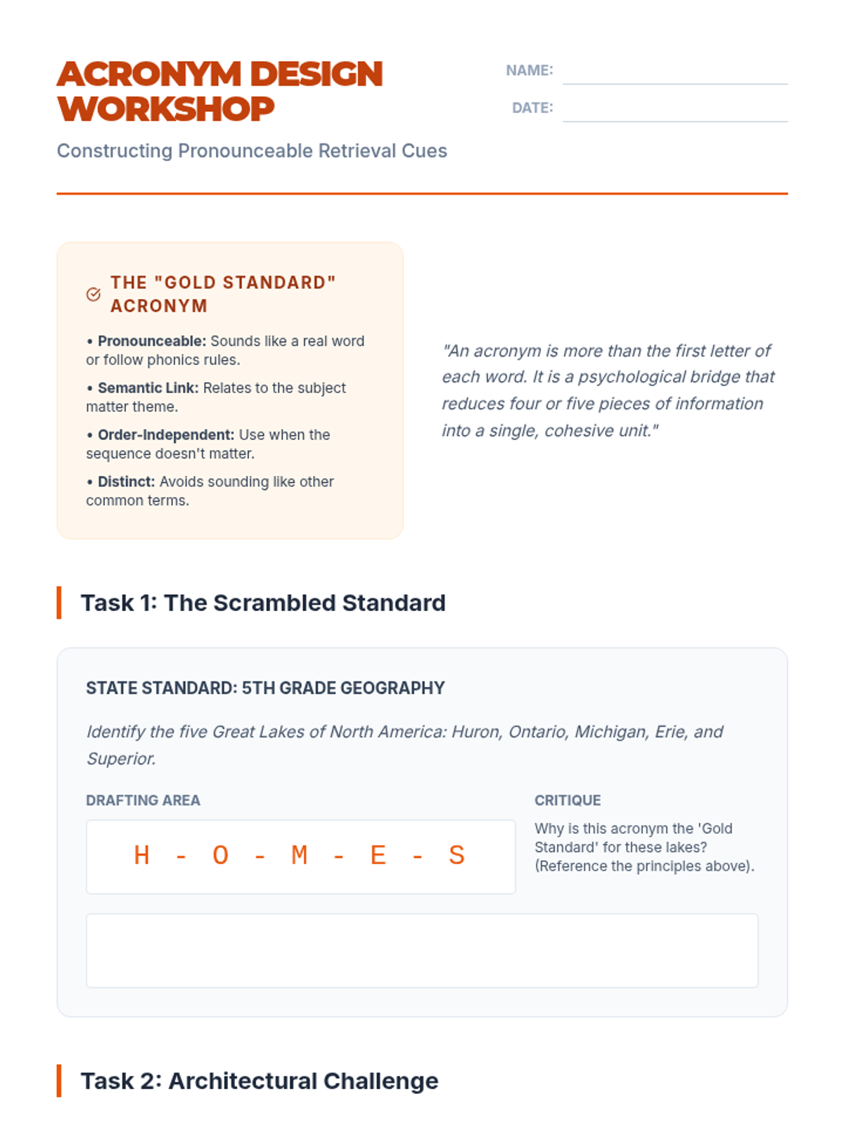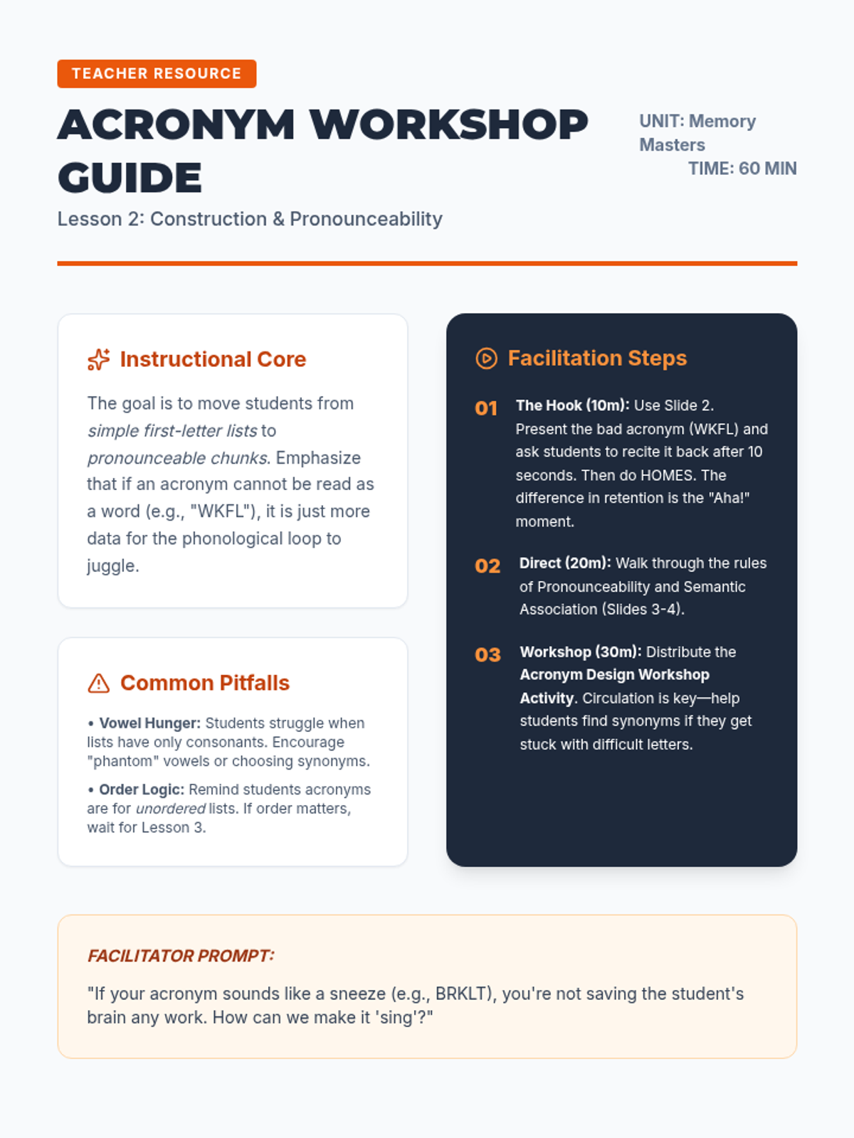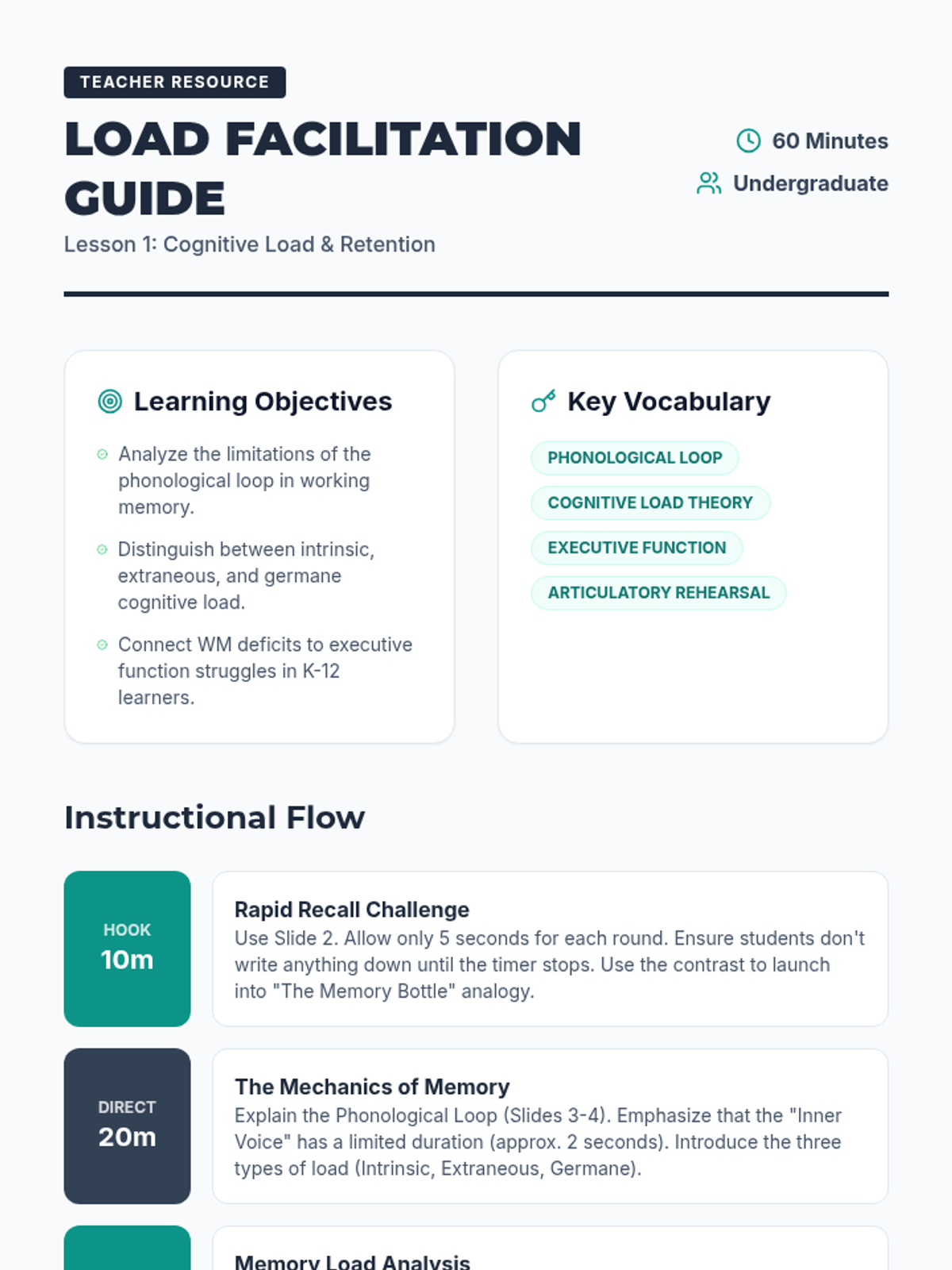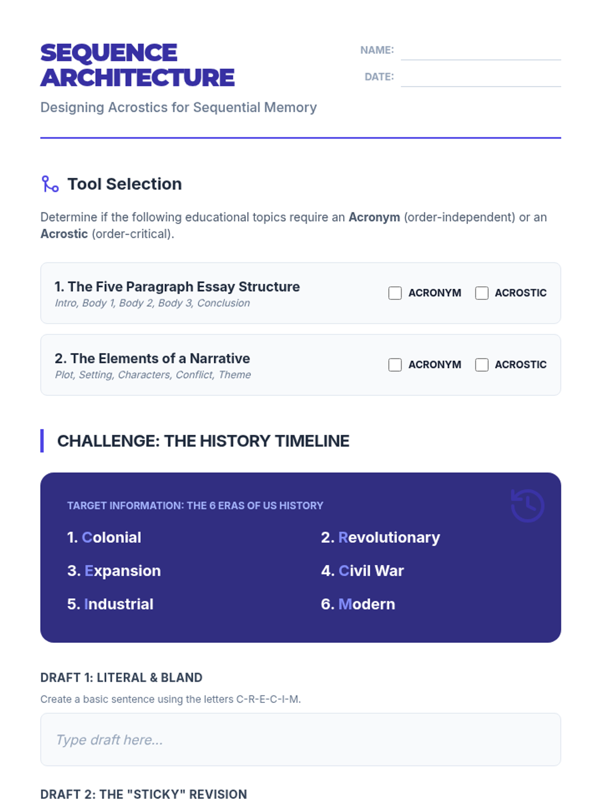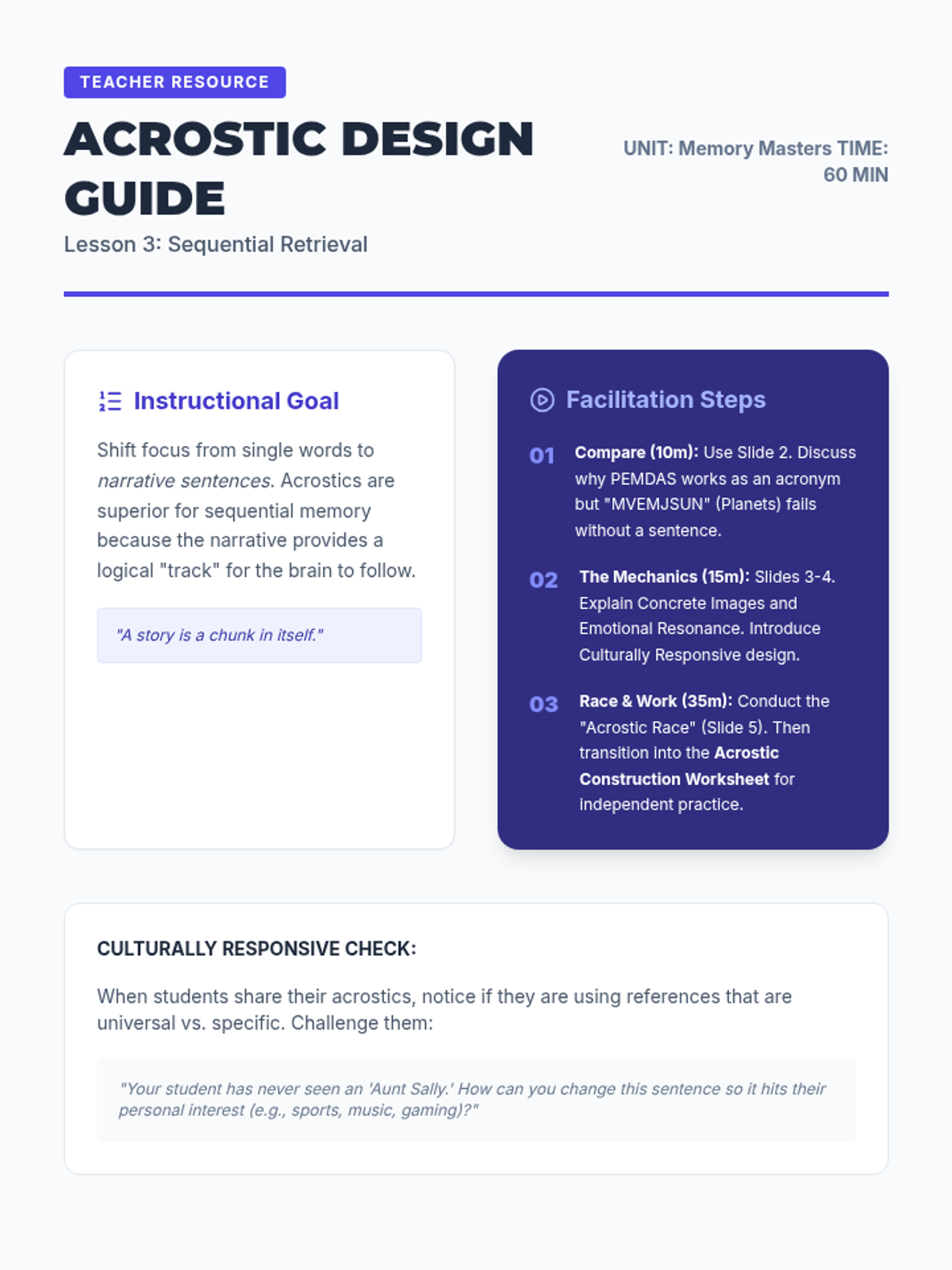 This sequence explores the cognitive science of linguistic mnemonics, focusing on working memory, cognitive load theory, and the design of acronyms, acrostics, and rhythmic strategies for K-12 education. Undergraduate students will move from theoretical understanding to practical application, culminating in the creation and testing of instructional memory aids.