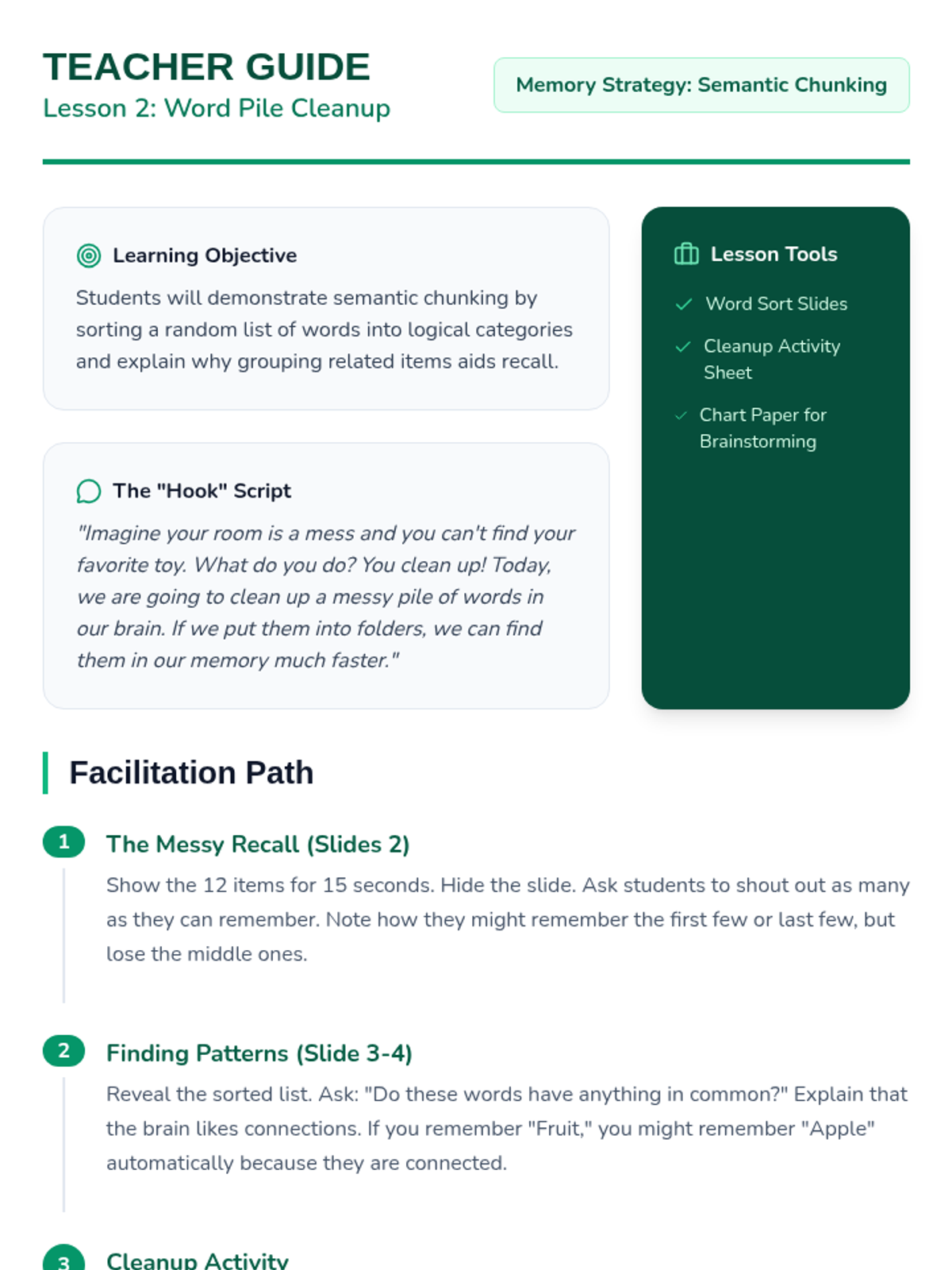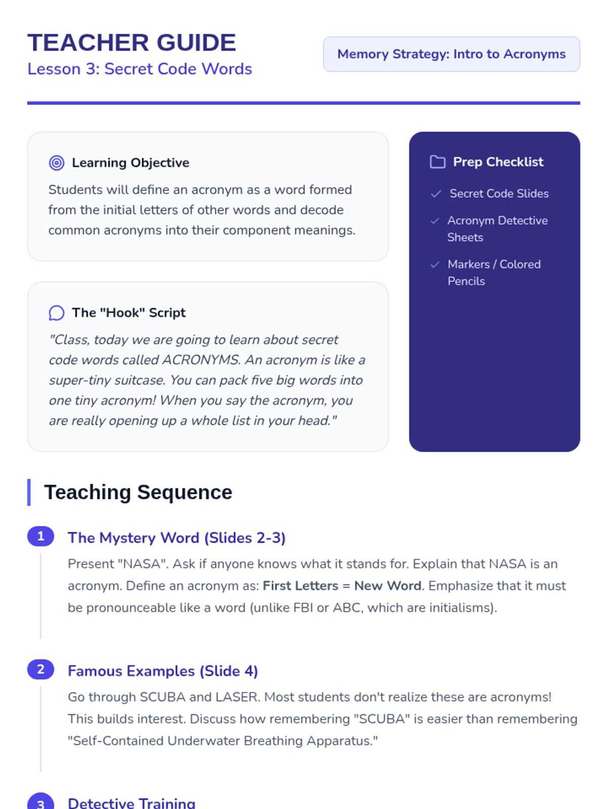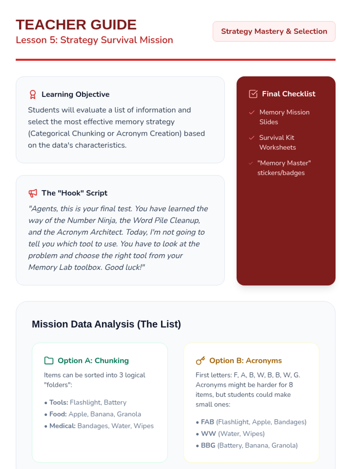 This sequence teaches 3rd-grade students cognitive strategies for memory support. Students learn to chunk numerical and semantic information and progress to creating and using acronyms to facilitate data retrieval and reduce cognitive load.
