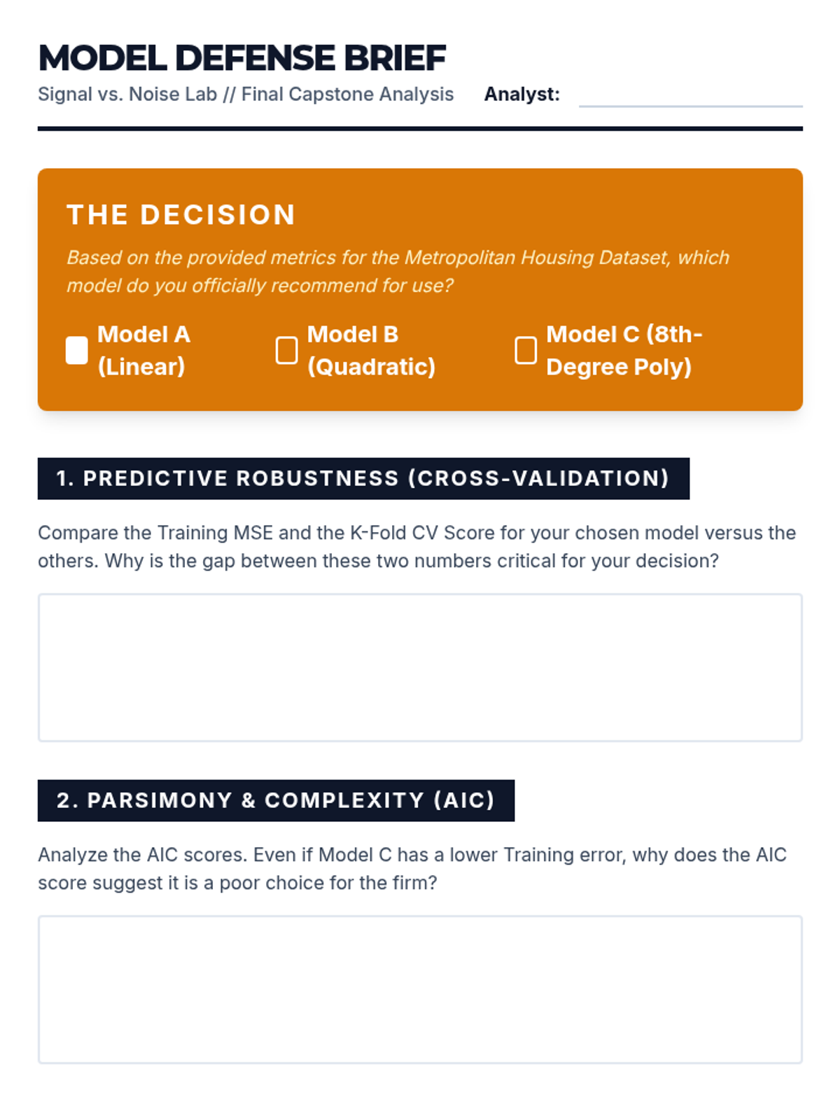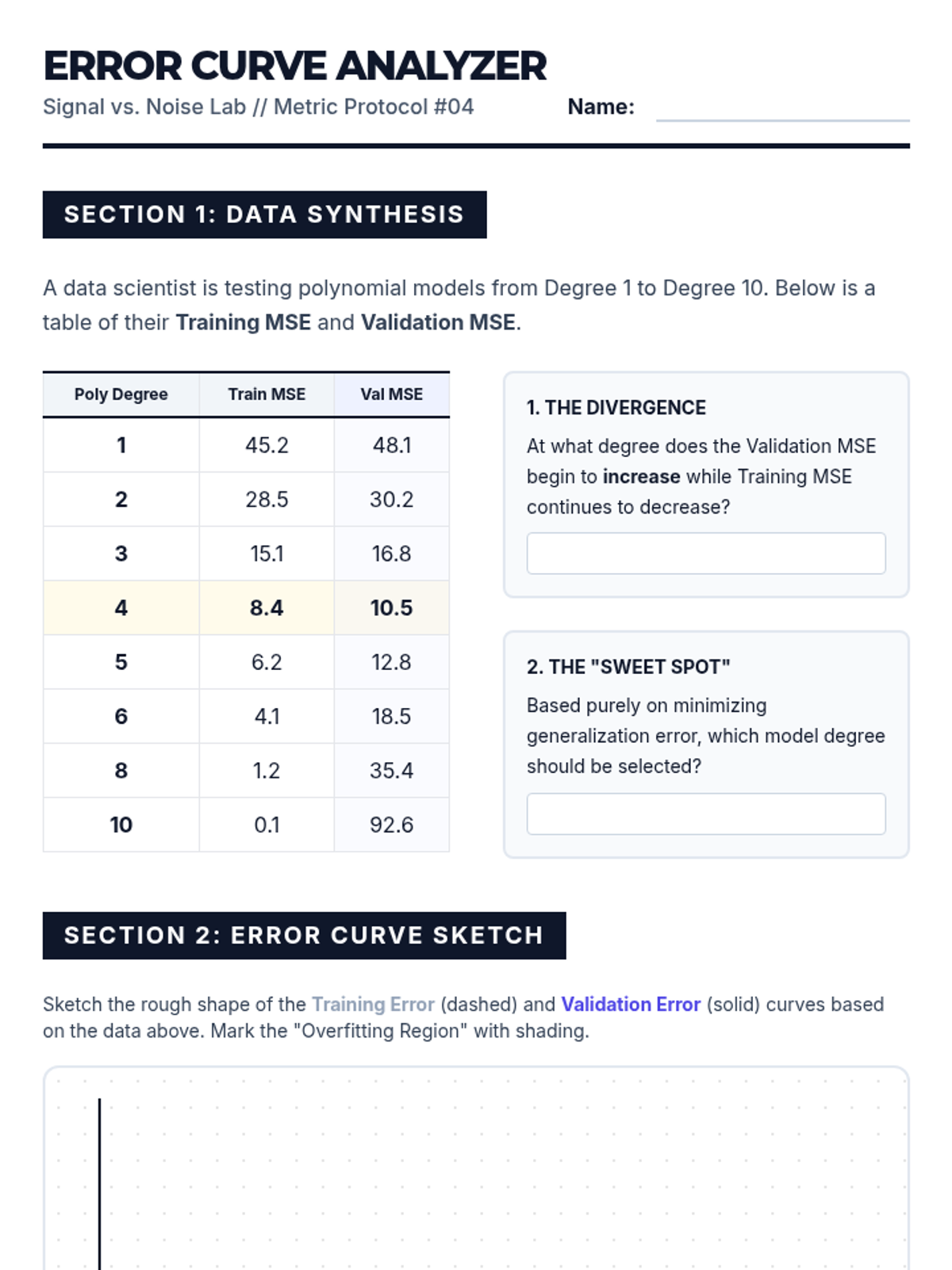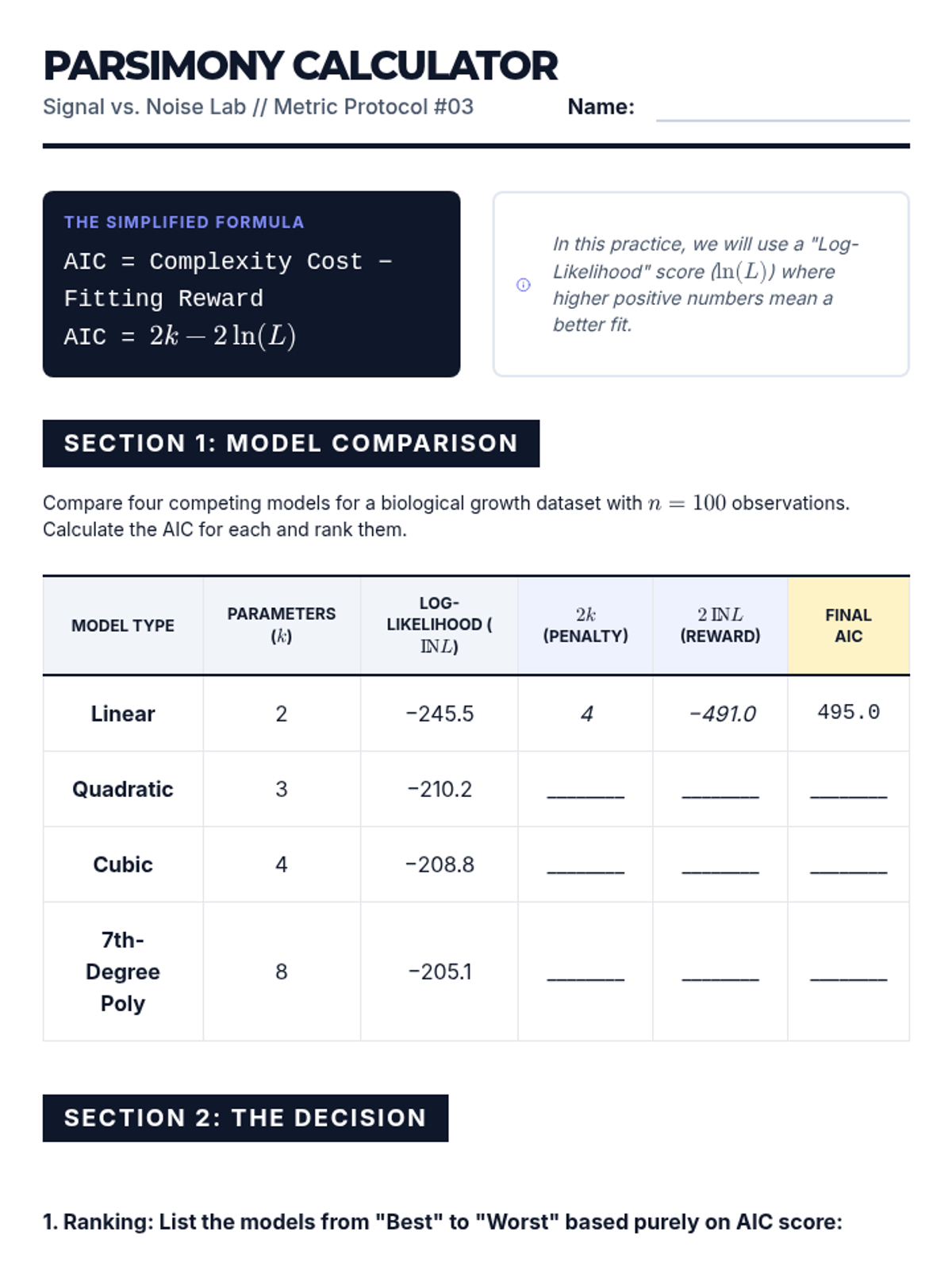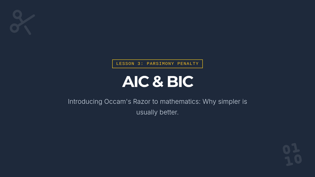 An advanced 11th-grade sequence on model selection, covering overfitting, cross-validation, AIC/BIC, and the bias-variance trade-off to distinguish signal from noise in data modeling.