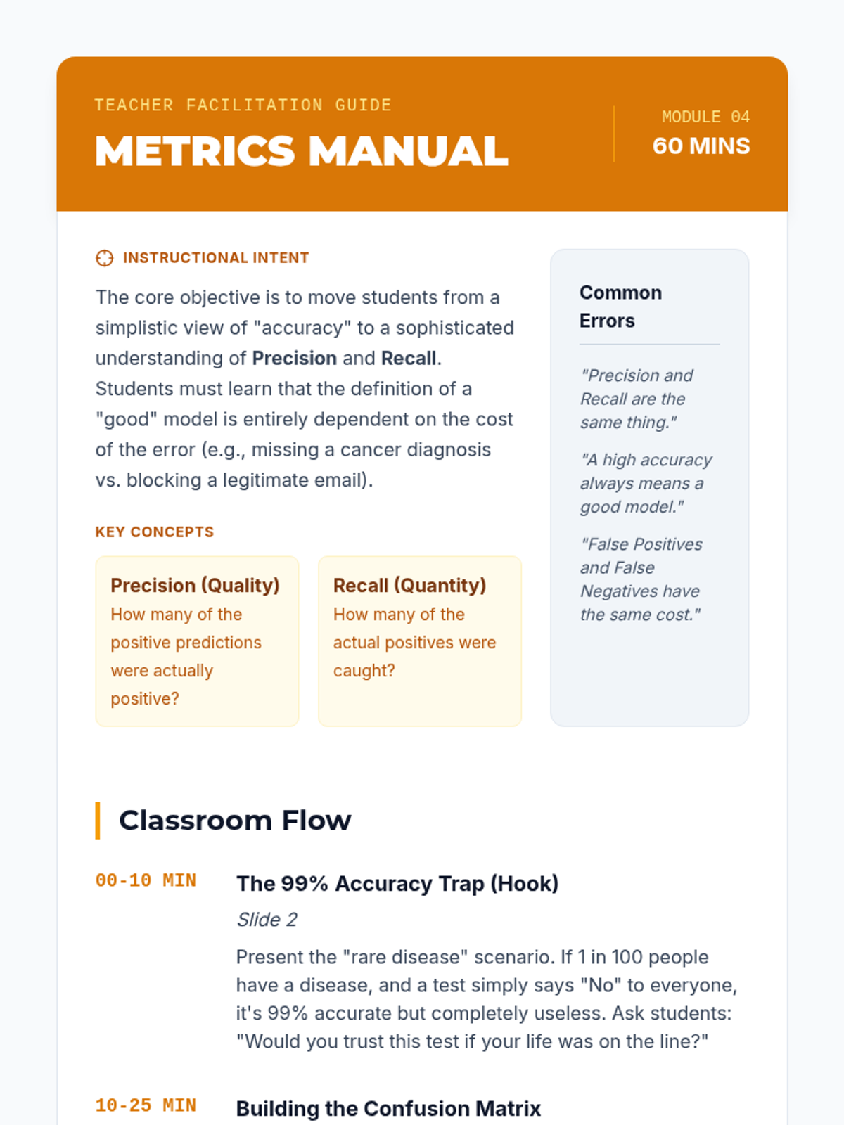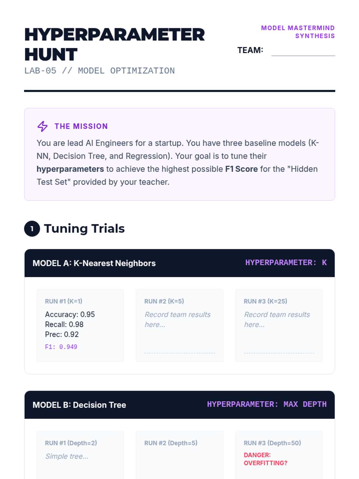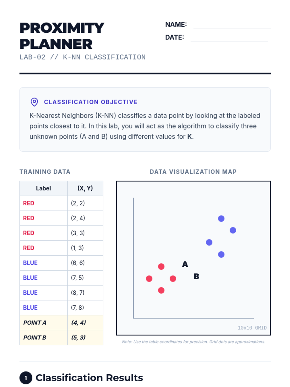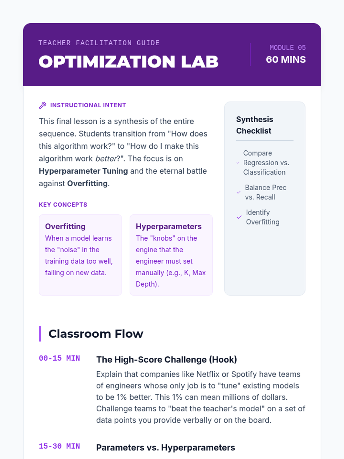 This sequence introduces 11th-grade students to supervised learning, covering regression, classification (K-NN and Decision Trees), and model evaluation metrics like precision and recall. Students move from conceptual math to practical optimization strategies used in modern AI engineering.