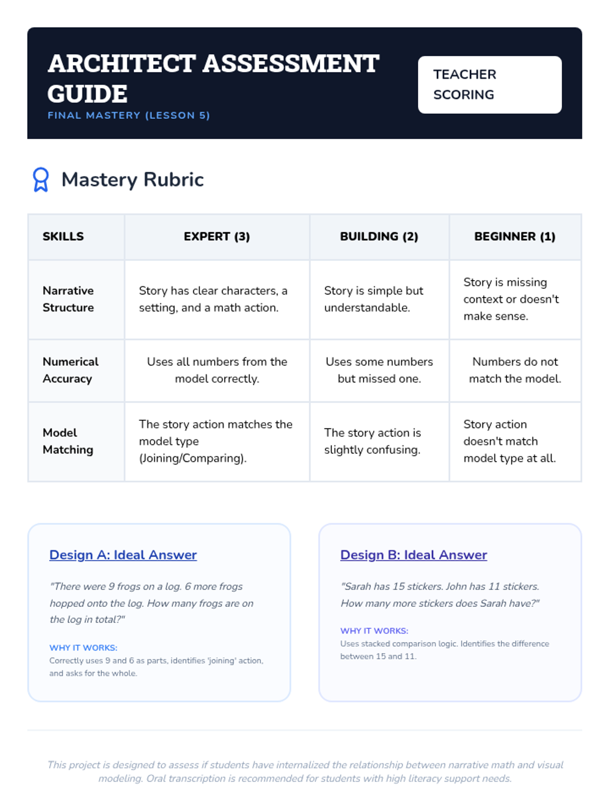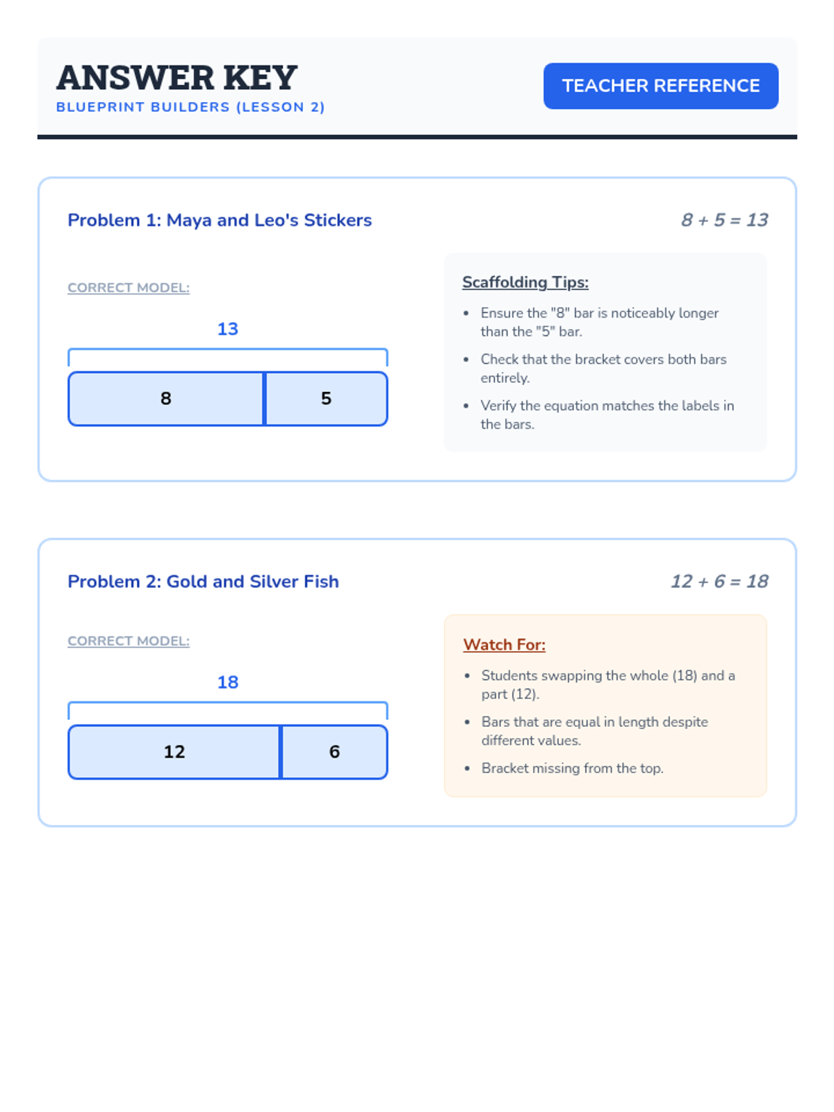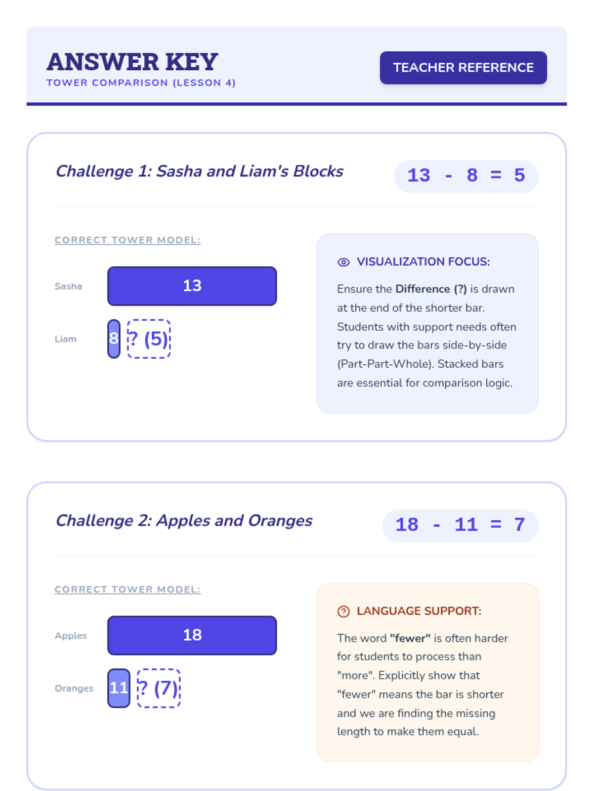 A specialized 5-lesson sequence for 2nd-grade academic support focused on the Concrete-Representational-Abstract (CRA) framework. Students progress from physical manipulatives to drawing bar models (tape diagrams) for addition, subtraction, and comparison word problems.