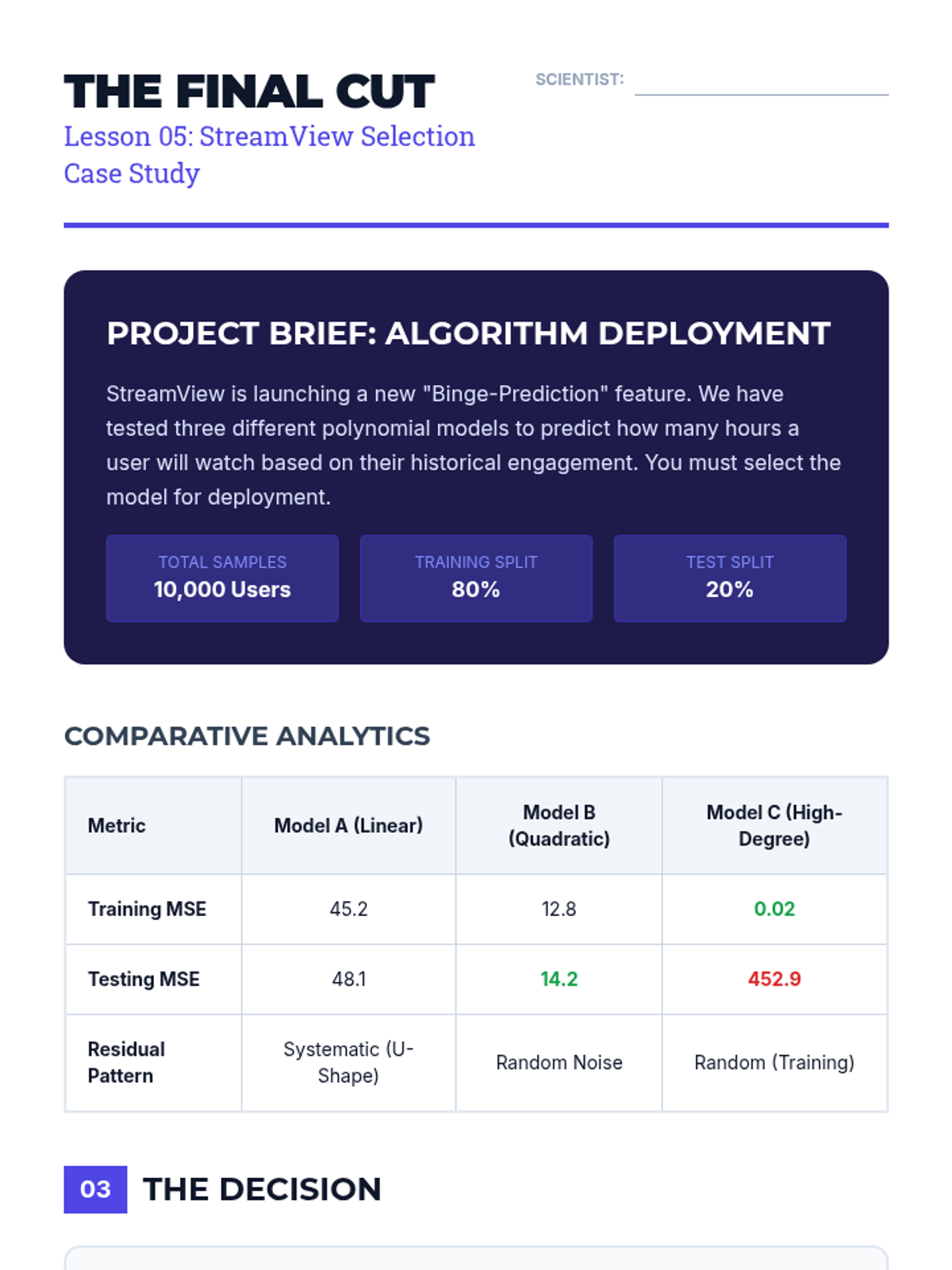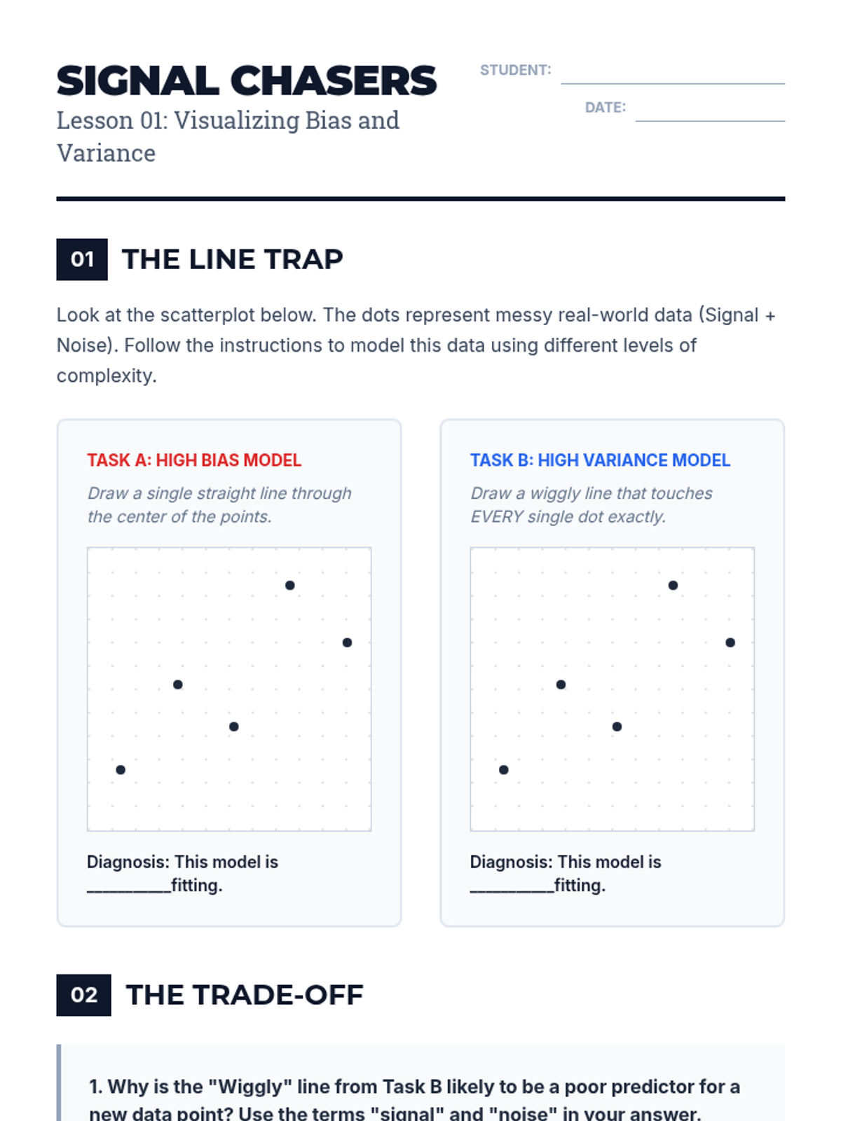 A comprehensive unit for 11th-grade students exploring the tension between model simplicity and complexity. Students learn to diagnose underfitting (high bias) and overfitting (high variance) through visualization, data partitioning, and error analysis.