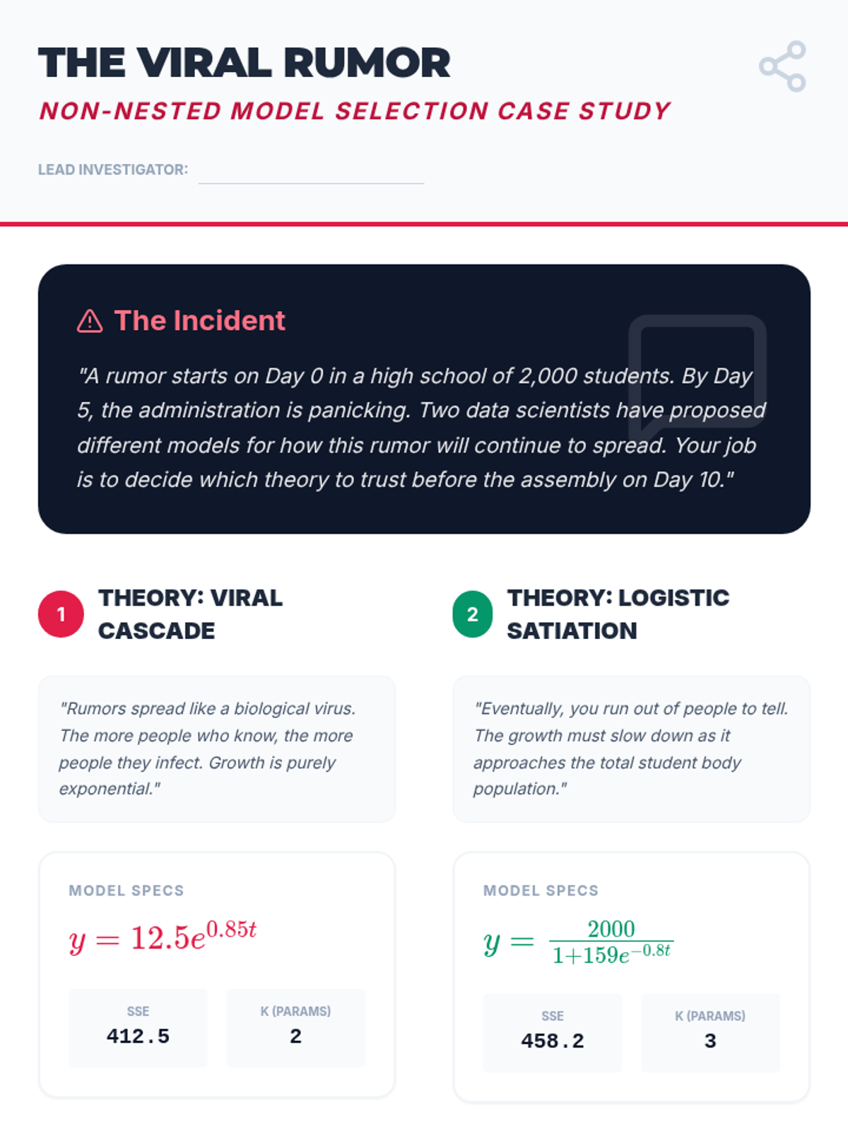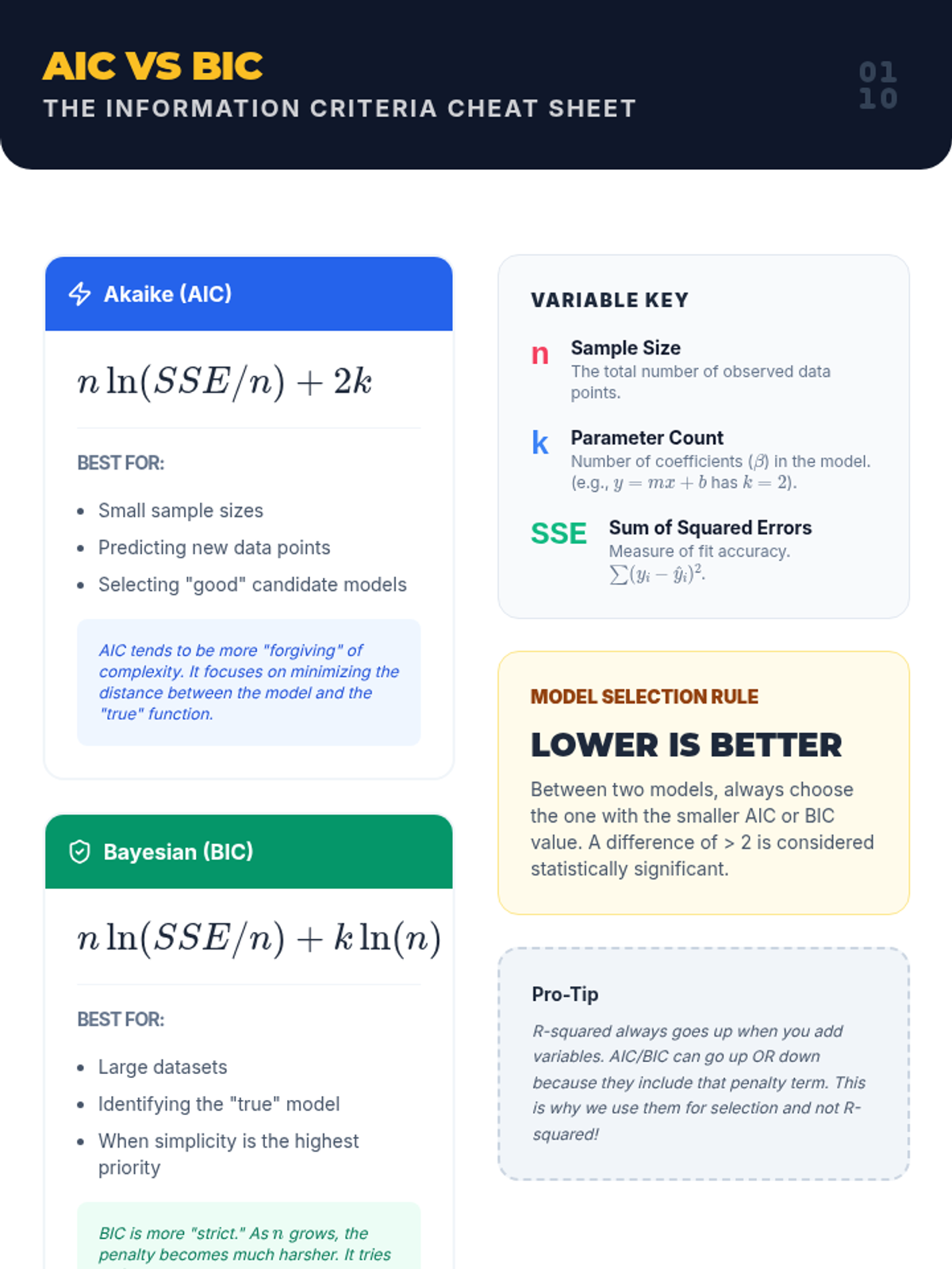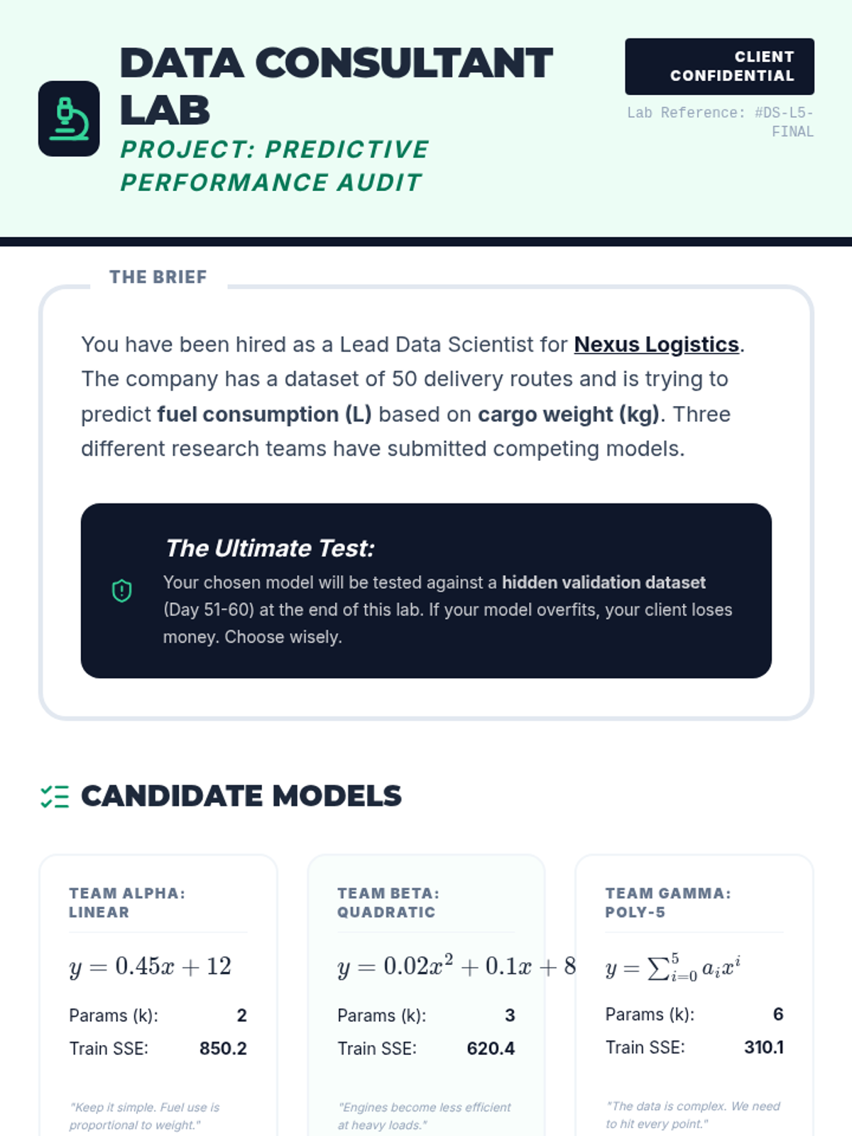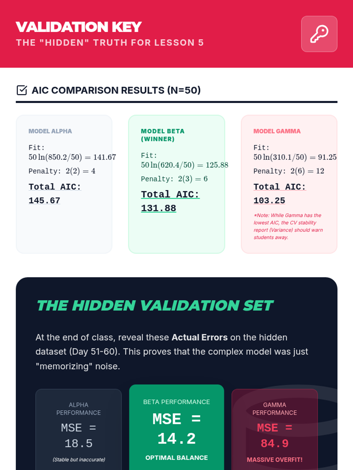 An advanced 12th-grade mathematics sequence focusing on model evaluation and selection. Students explore the bias-variance trade-off, information criteria (AIC/BIC), and cross-validation to select optimal predictive models.
