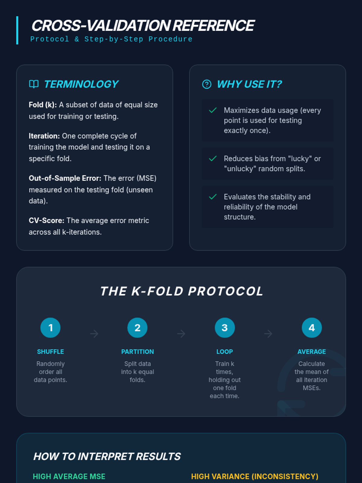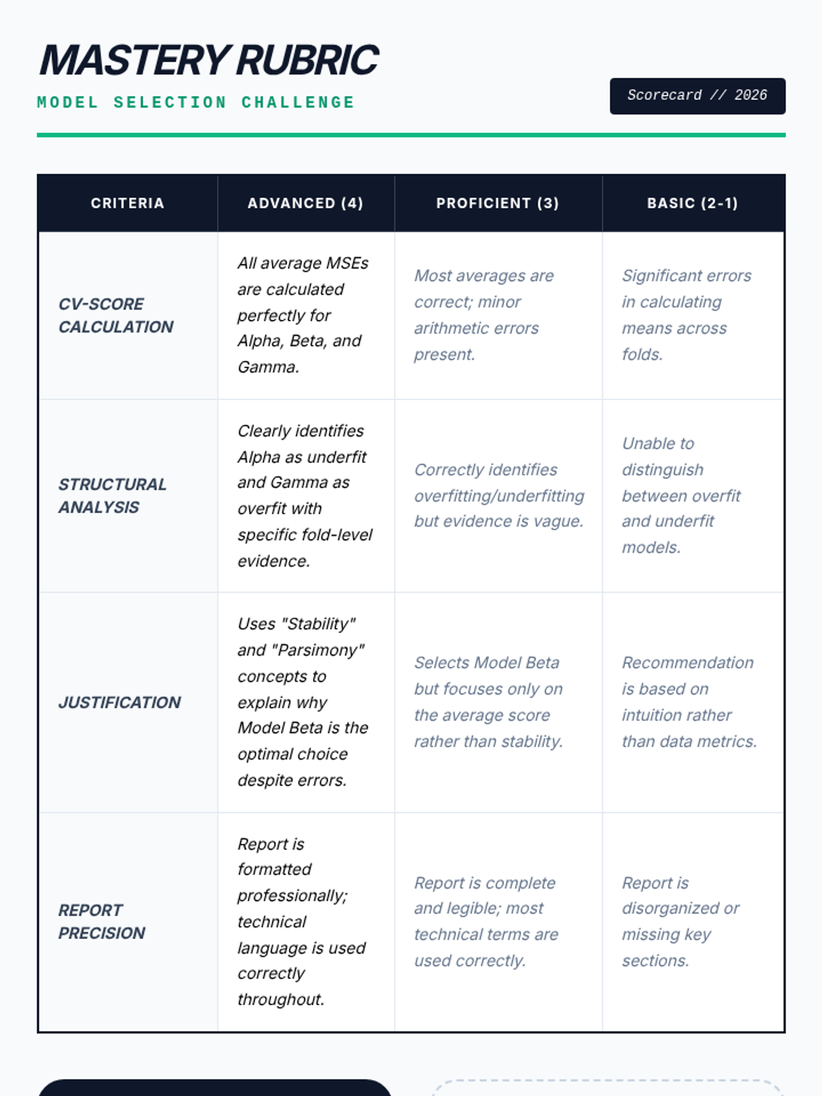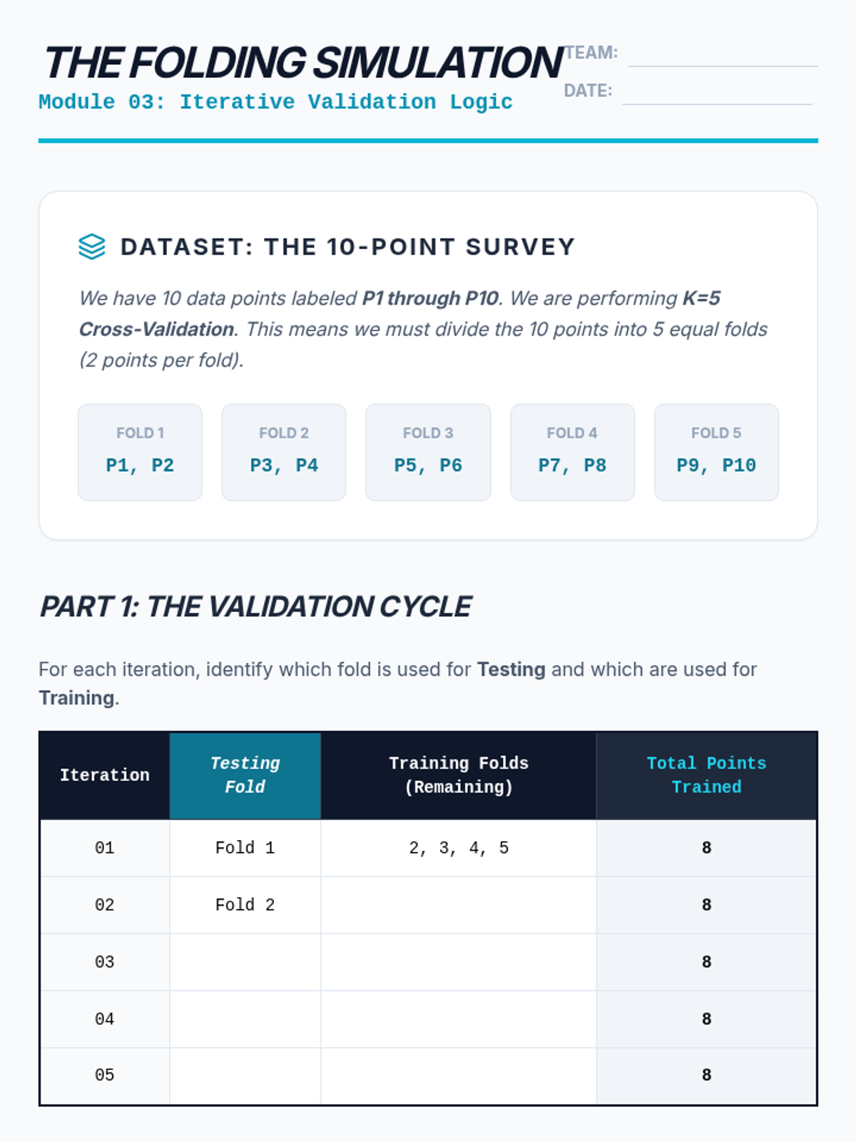 A technical workshop sequence for 11th-grade students focusing on cross-validation techniques, including train-test splits, MSE calculation, and K-Fold validation to assess and select robust mathematical models.