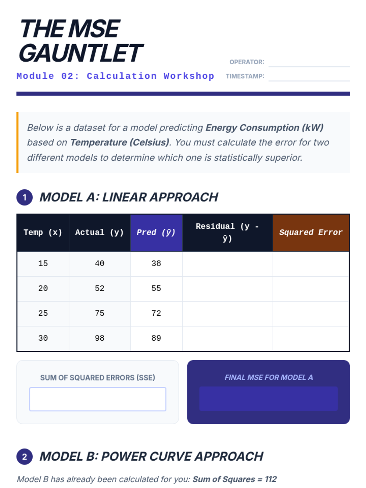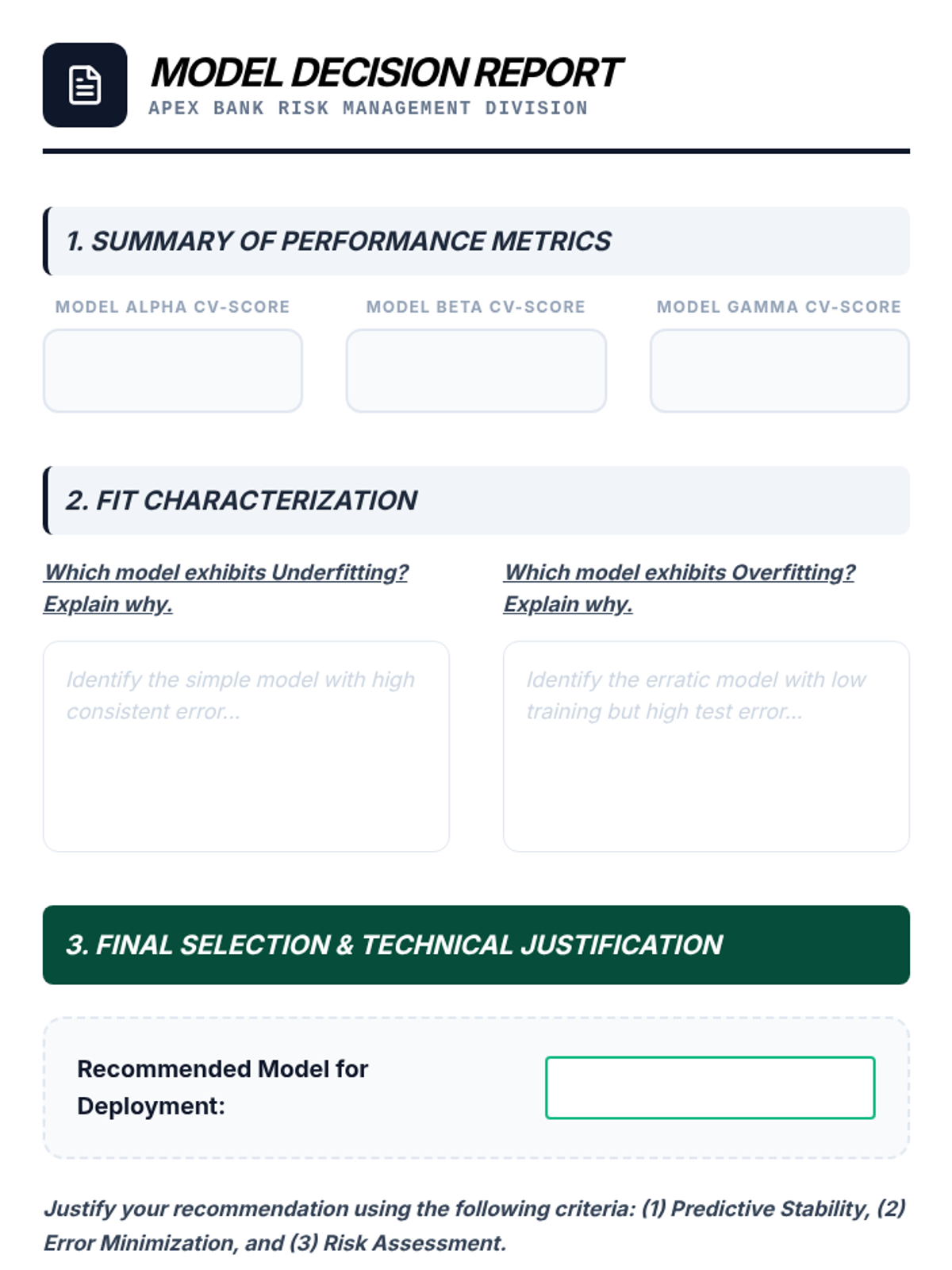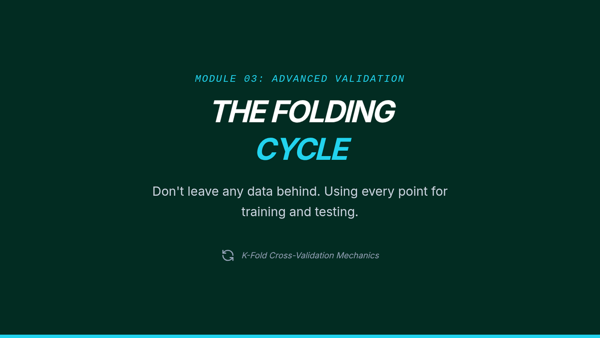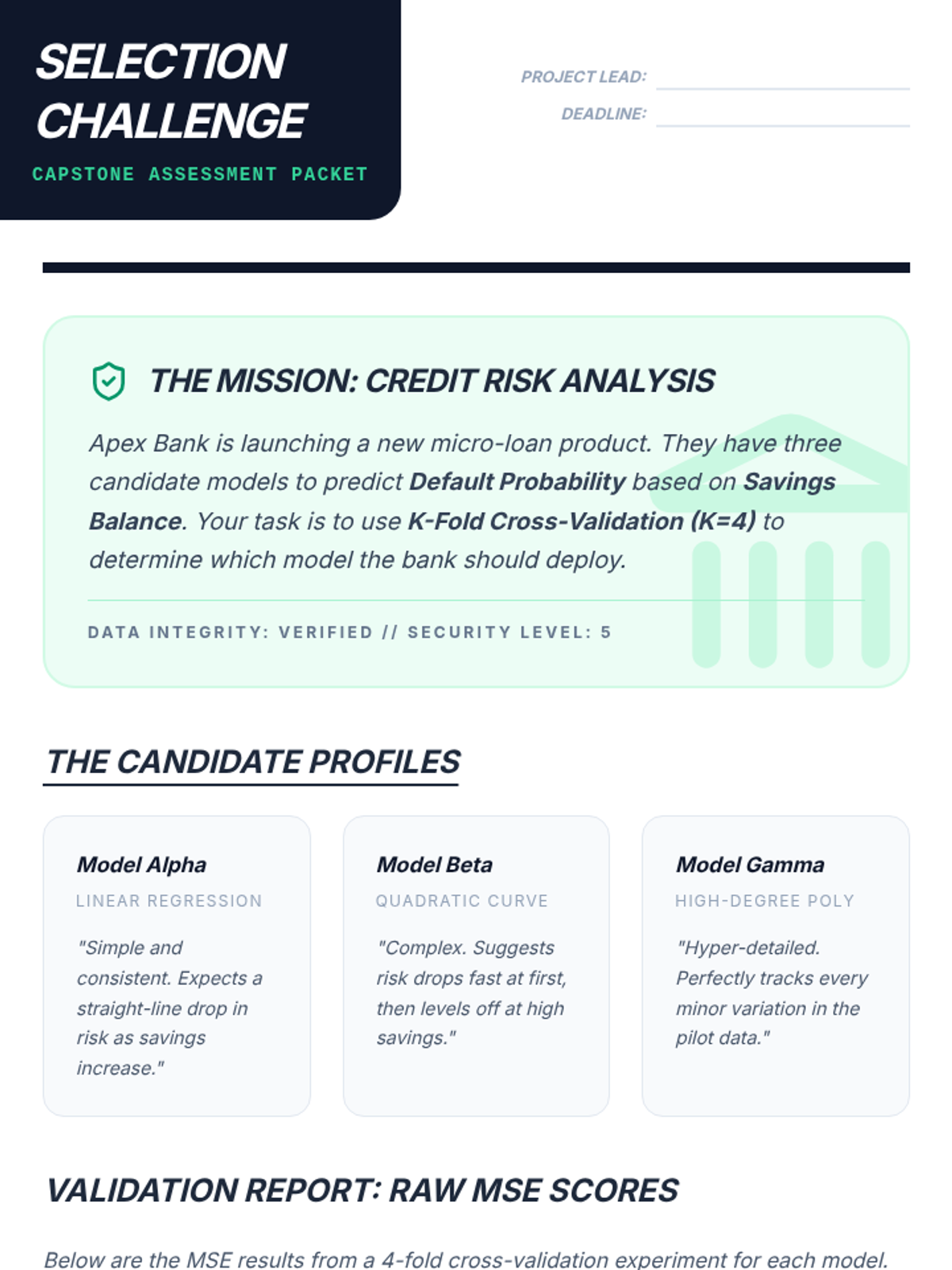 A technical workshop sequence for 11th-grade students focusing on cross-validation techniques, including train-test splits, MSE calculation, and K-Fold validation to assess and select robust mathematical models.