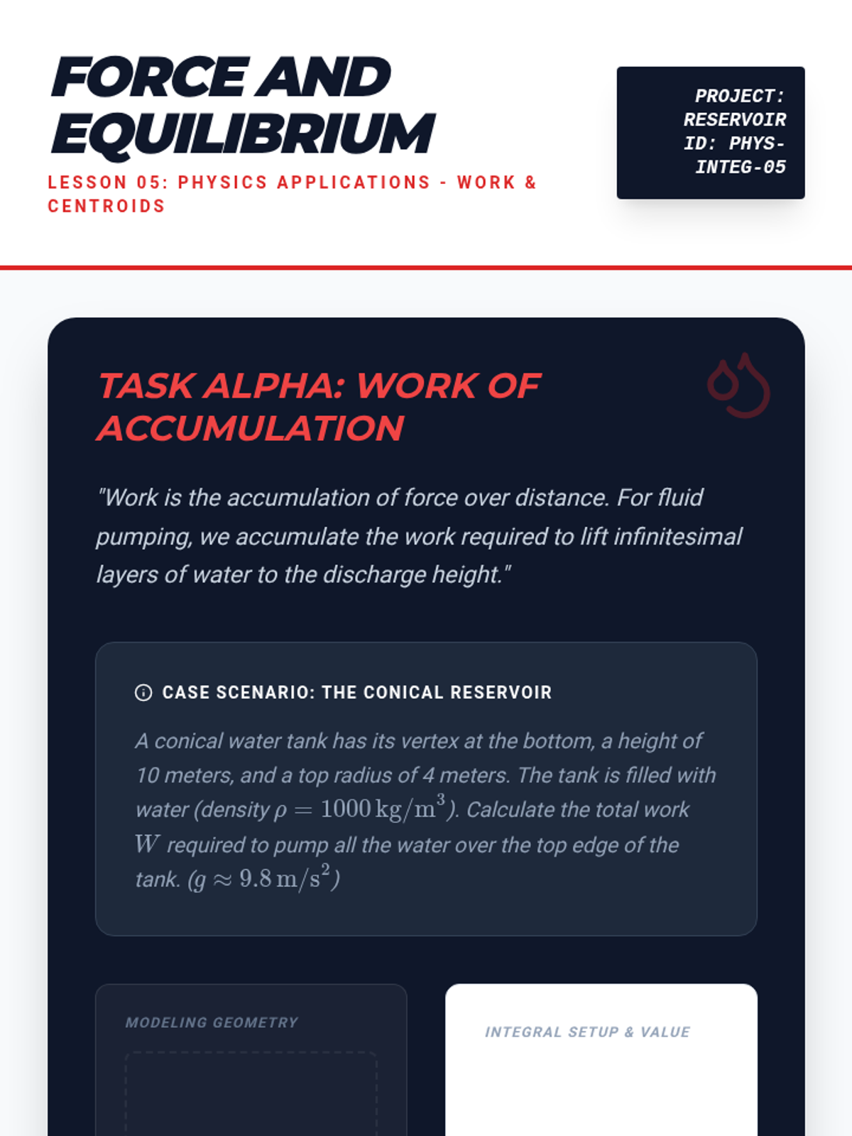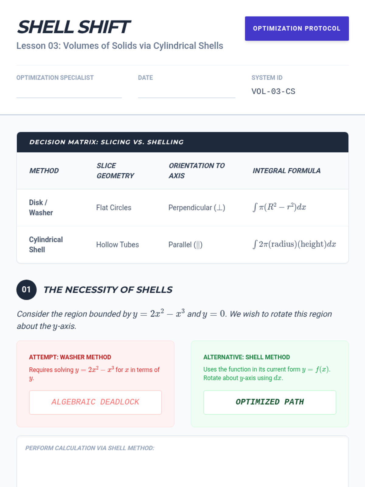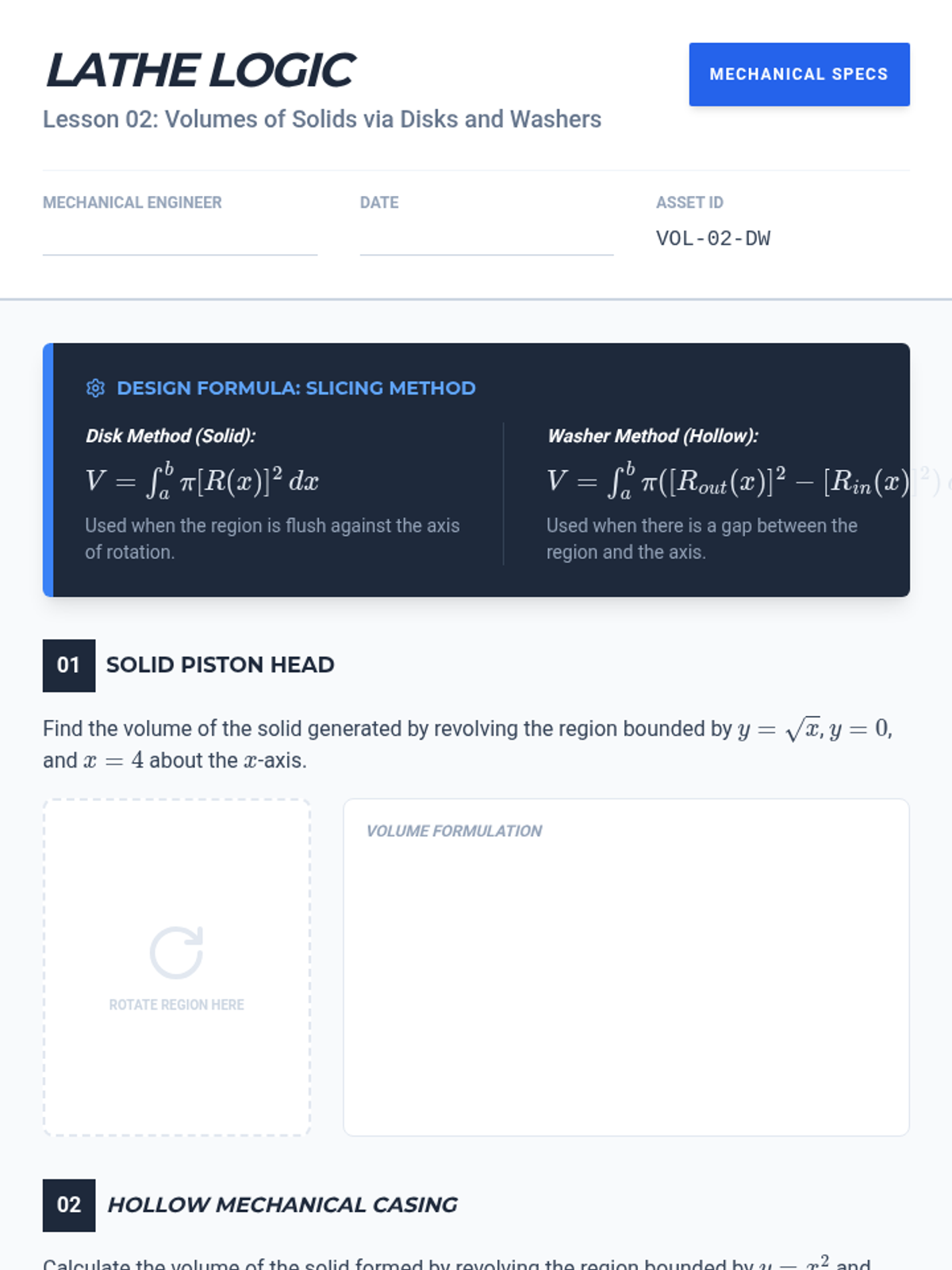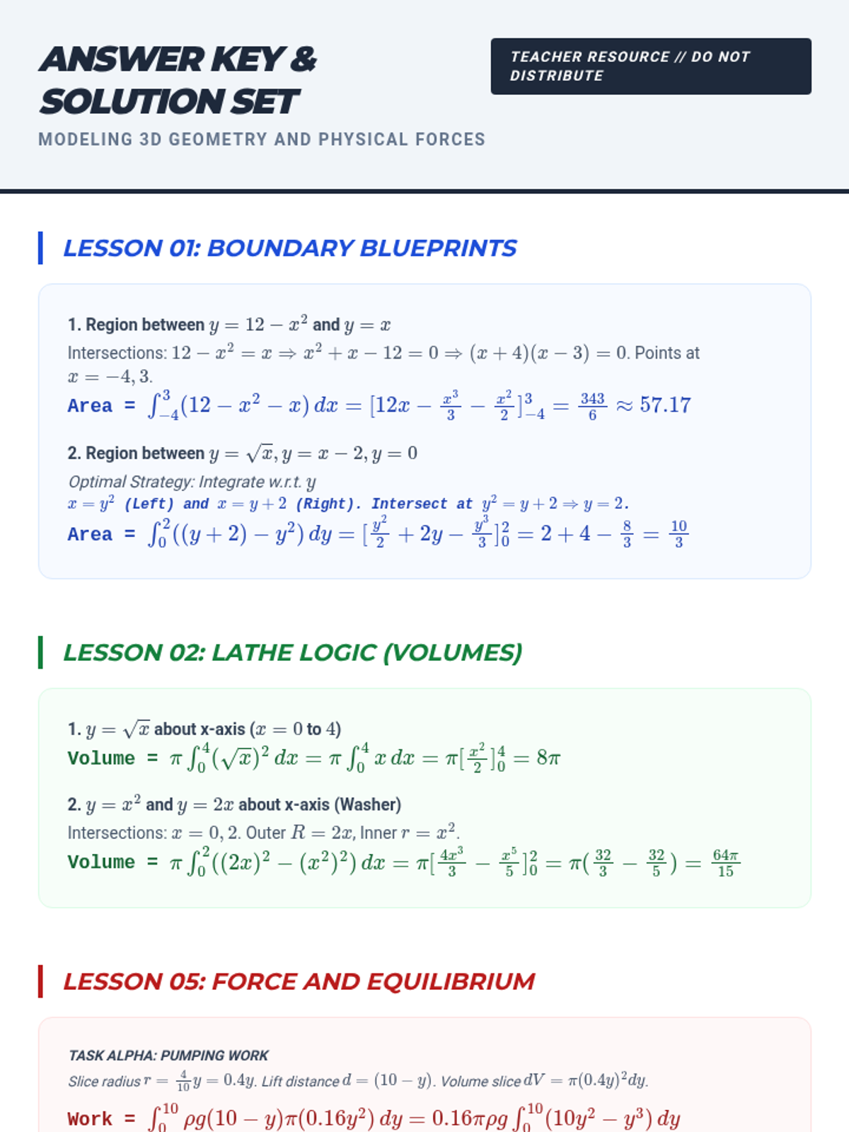 A comprehensive sequence for undergraduate students exploring the geometric and physical applications of definite integrals, from area and volume to work and centroids. The curriculum emphasizes spatial visualization and strategic selection of integration methods.