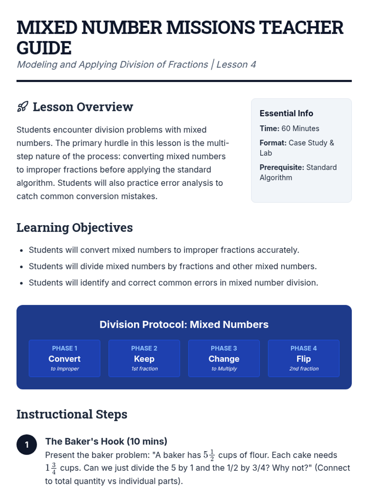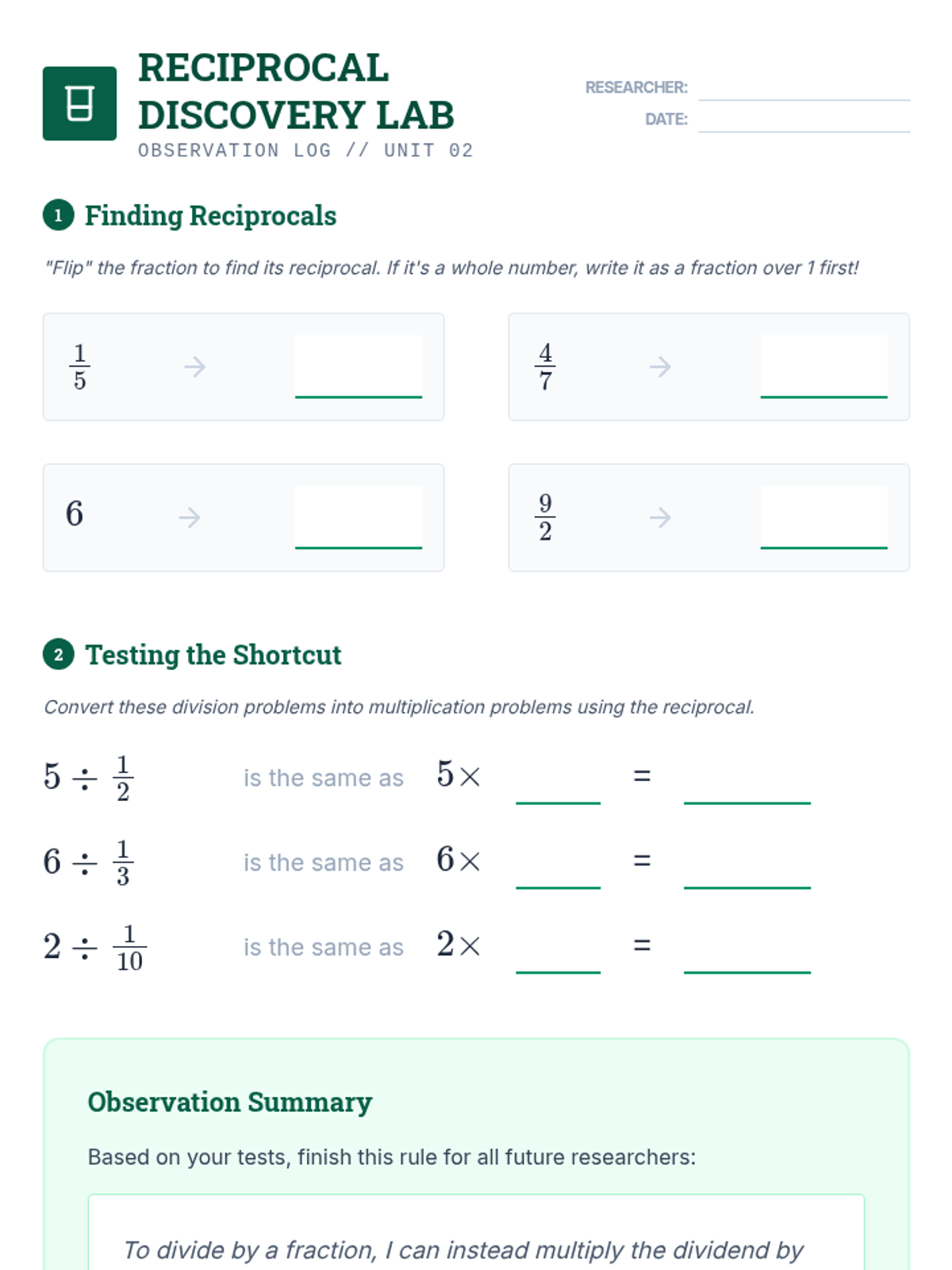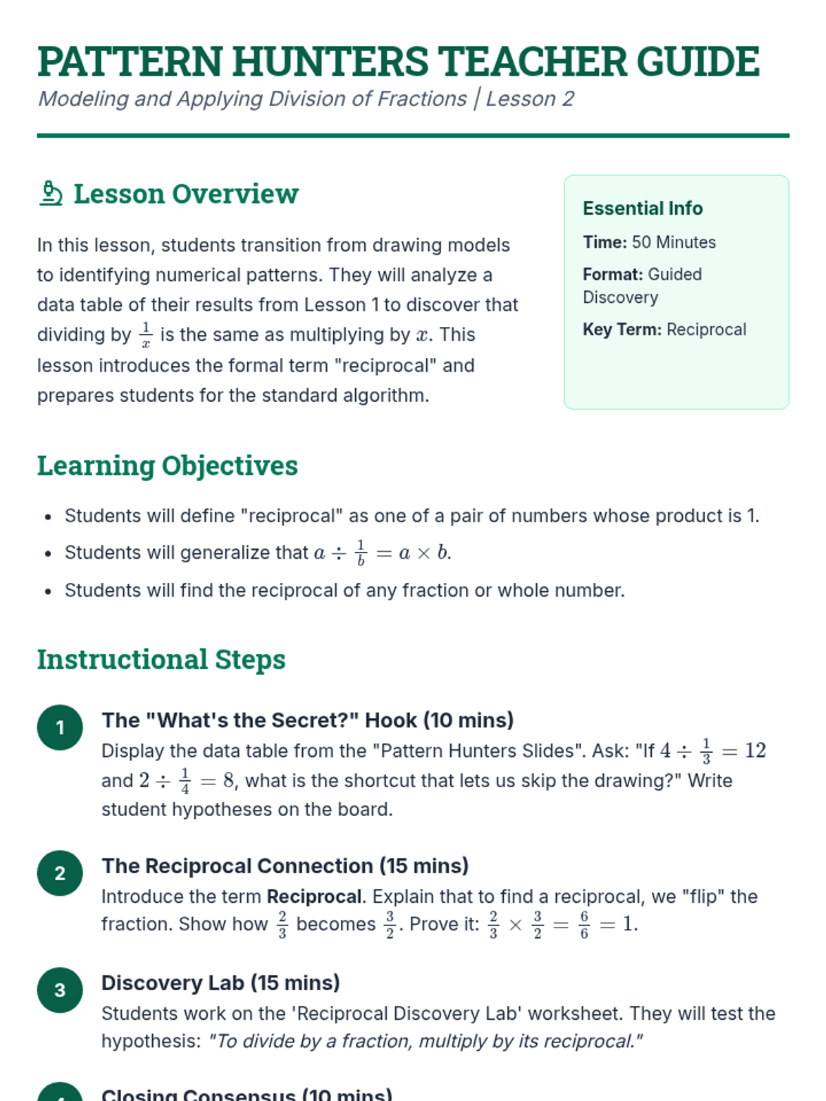 A comprehensive 6th-grade sequence on fraction division, moving from visual modeling with tape diagrams to the standard algorithm and real-world application with mixed numbers. Students discover reciprocals and patterns to build a deep conceptual understanding of the 'invert and multiply' rule.
