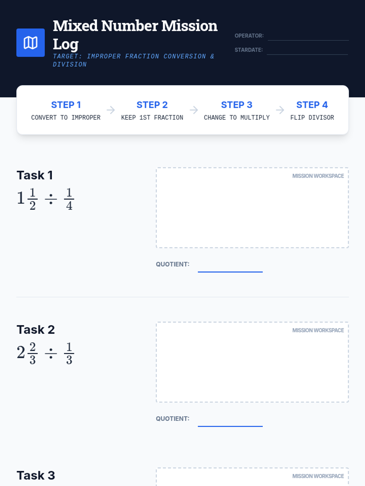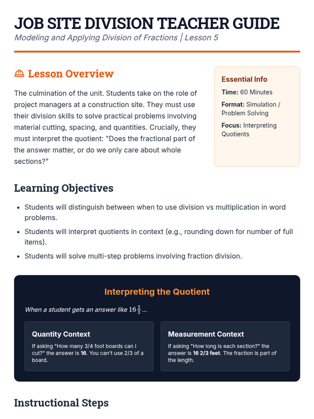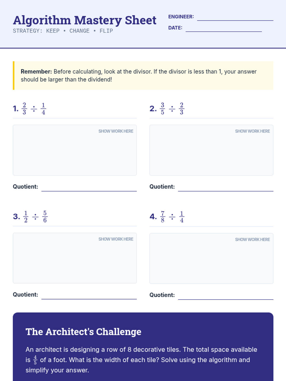 A comprehensive 6th-grade sequence on fraction division, moving from visual modeling with tape diagrams to the standard algorithm and real-world application with mixed numbers. Students discover reciprocals and patterns to build a deep conceptual understanding of the 'invert and multiply' rule.