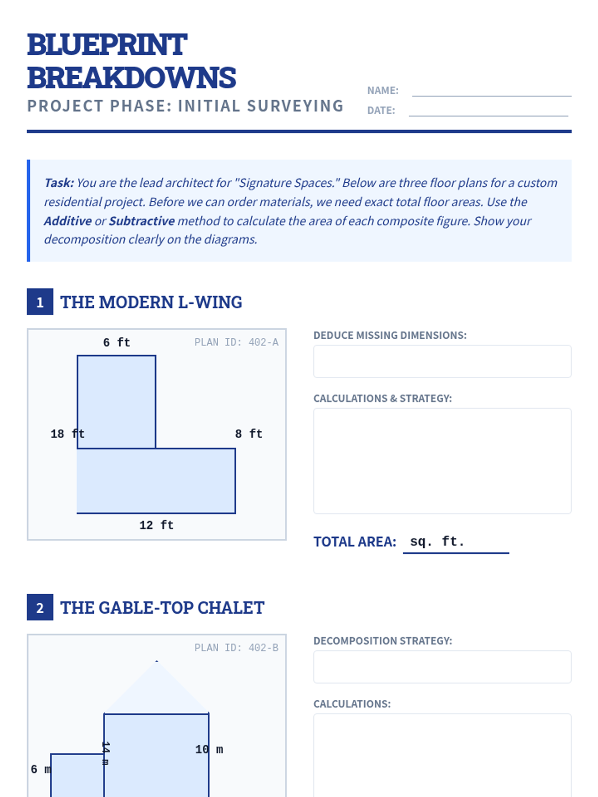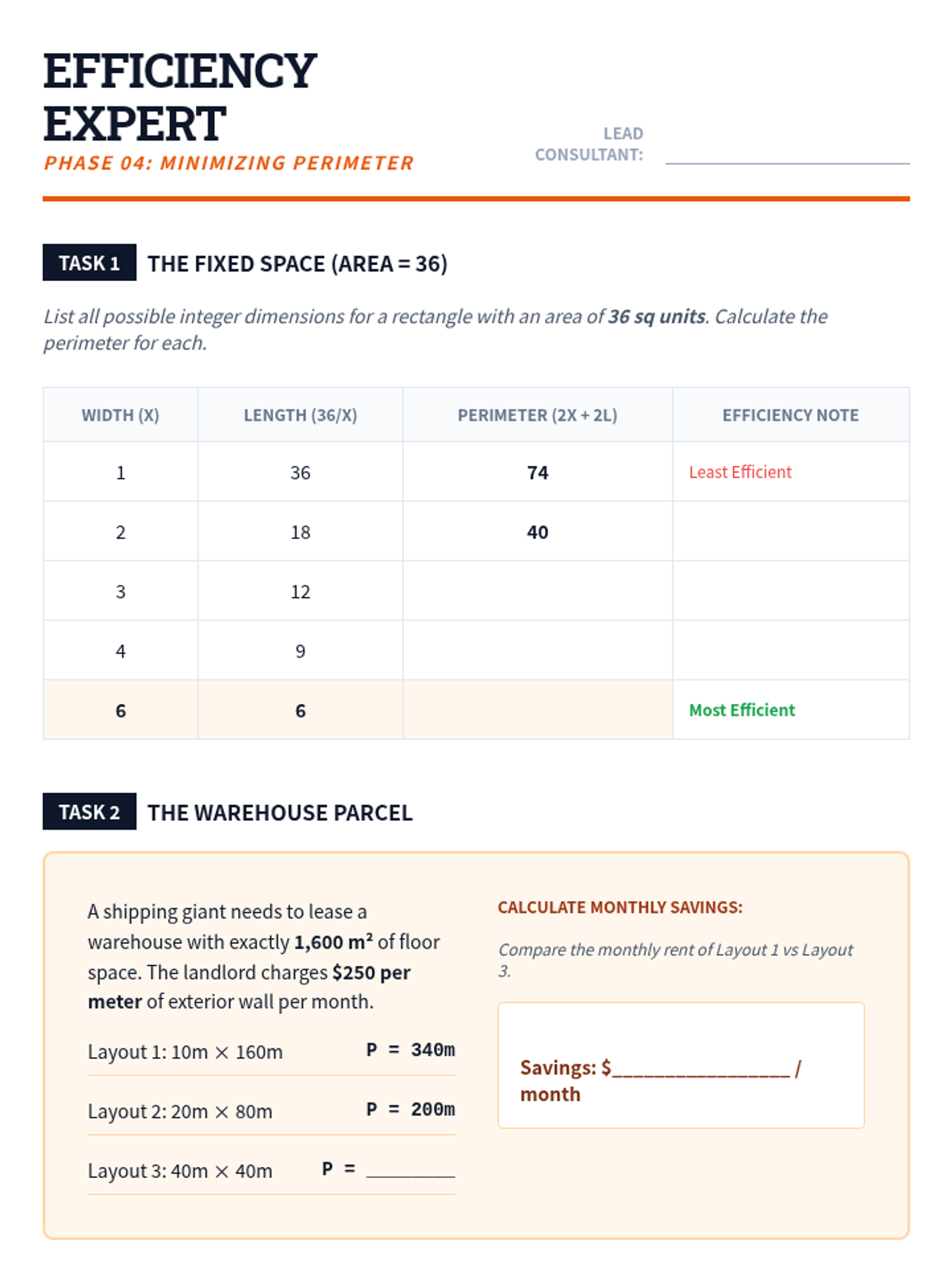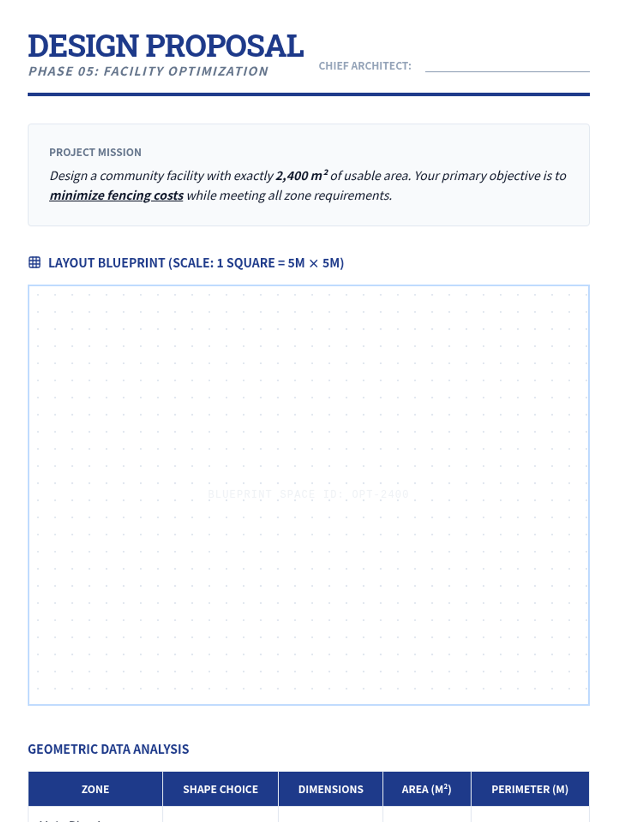A project-based unit where 10th-grade students explore the relationship between area and perimeter through the lens of architectural design and economic optimization. Students progress from calculating composite areas to using algebraic modeling to maximize space and minimize costs.
