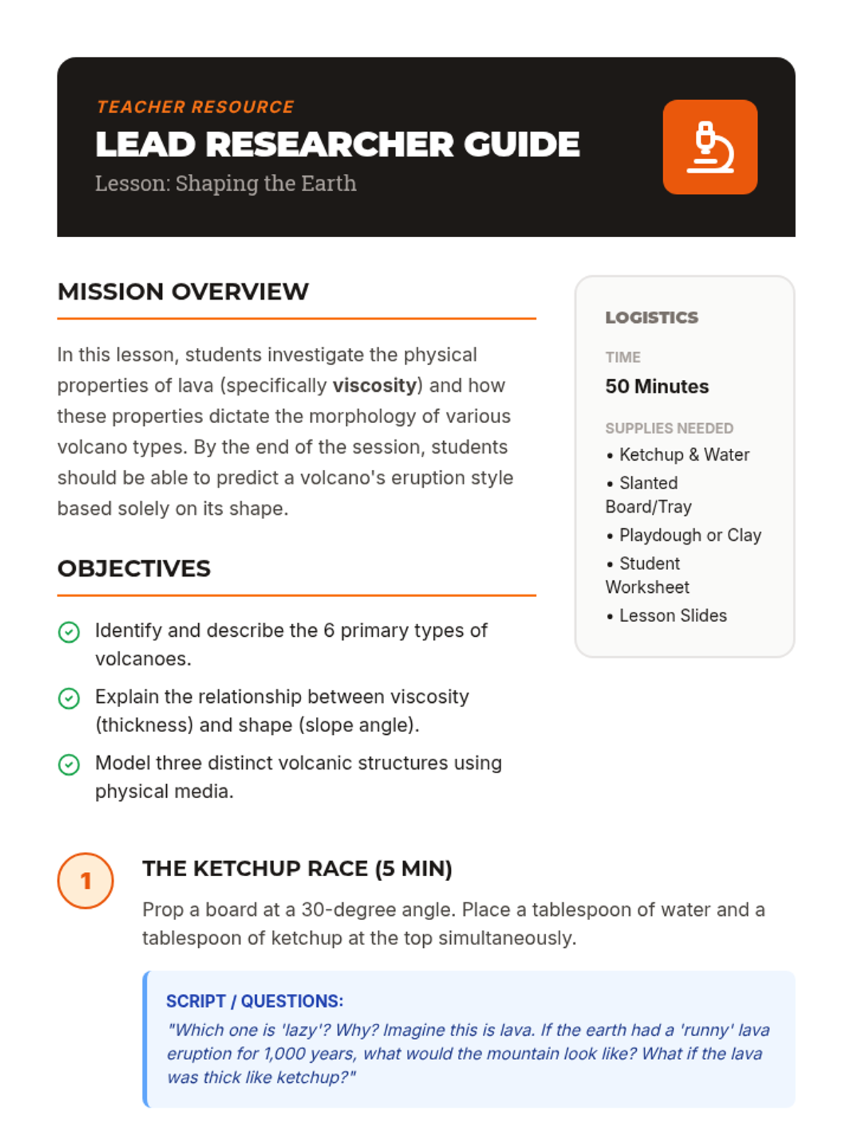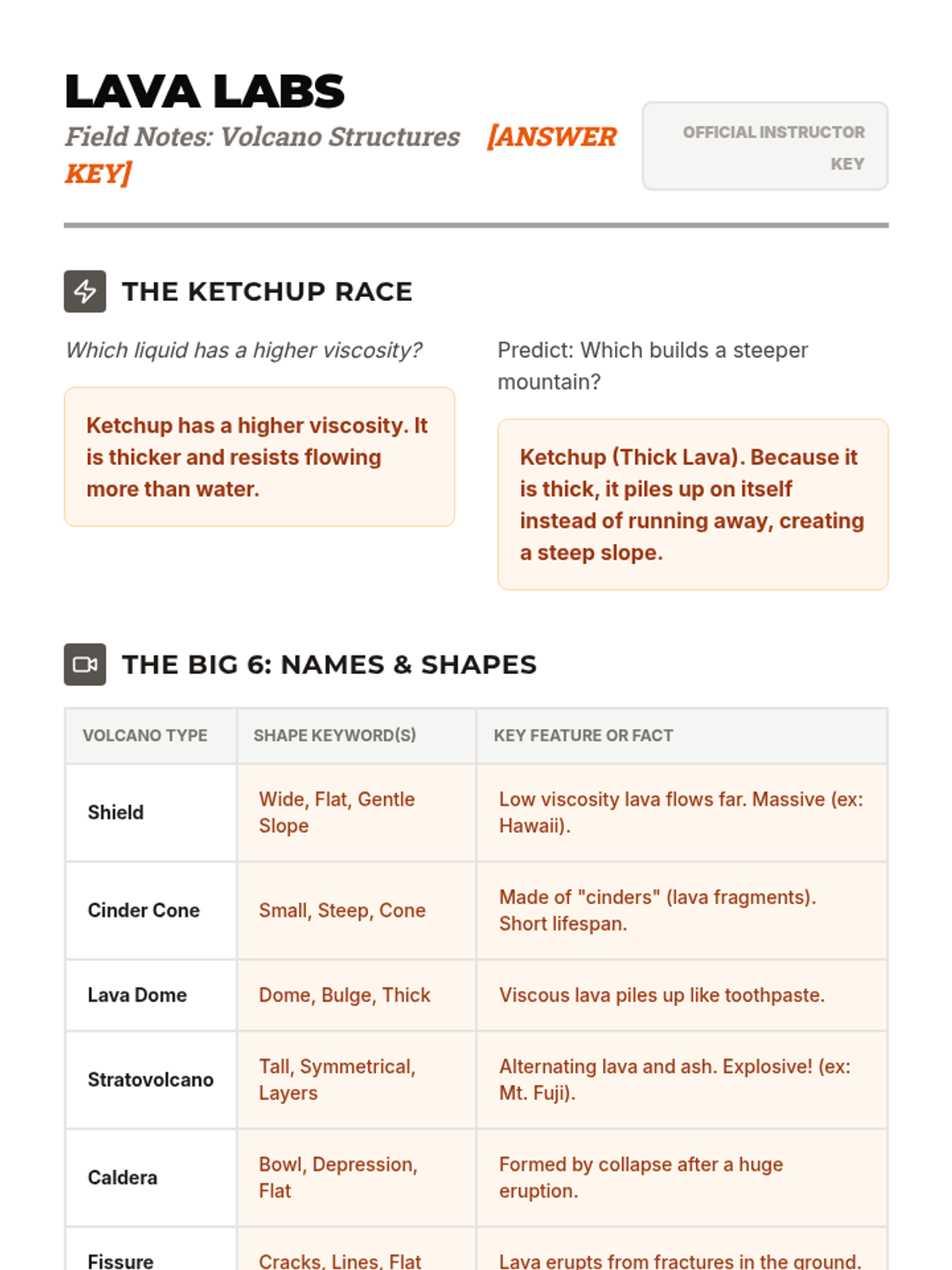A comprehensive science lesson for 4th-6th graders exploring the six types of volcanoes and the relationship between lava viscosity and volcano shape. The sequence includes a hands-on 'Ketchup Race' demonstration, video analysis, and a sculpting activity.