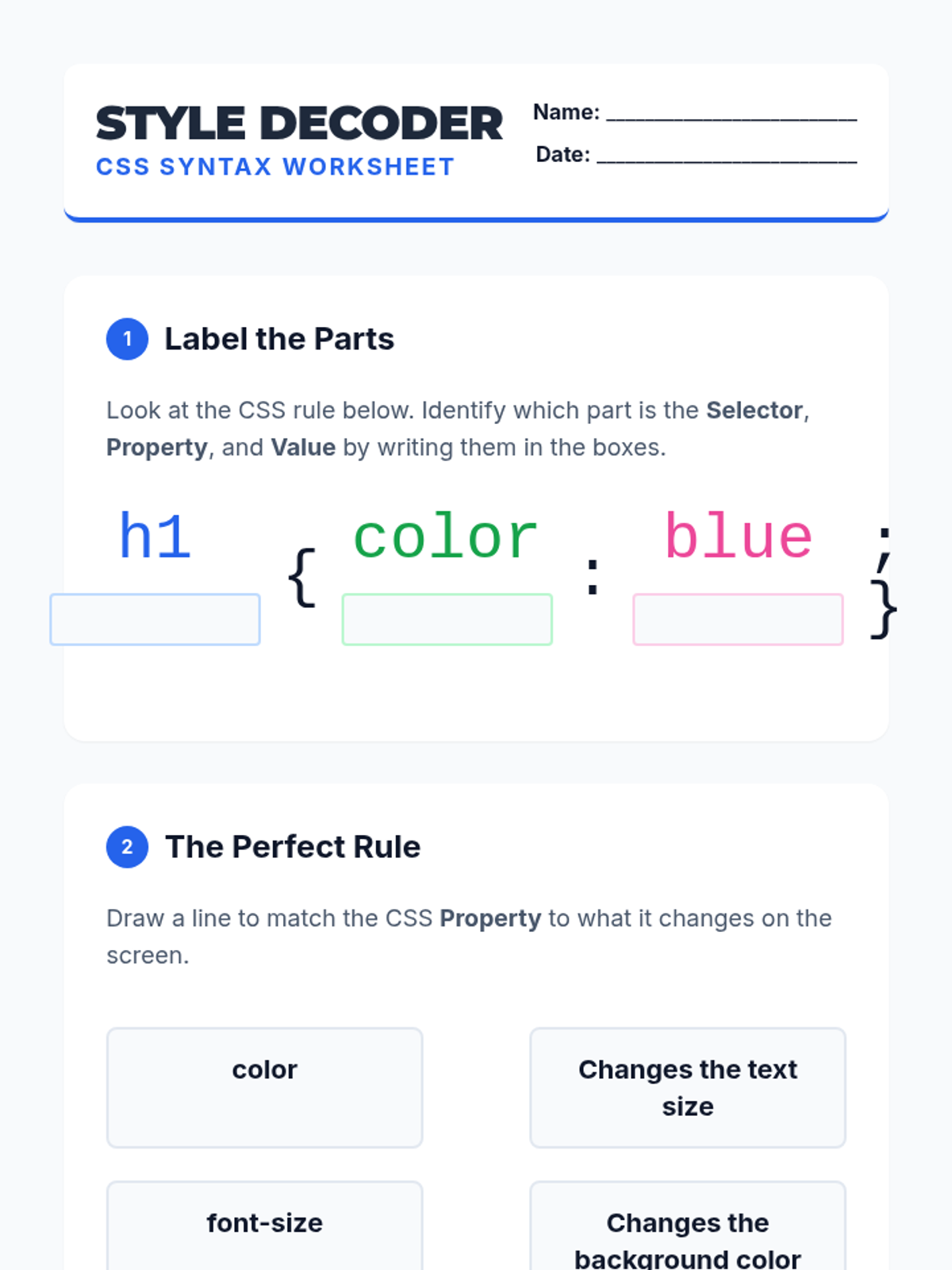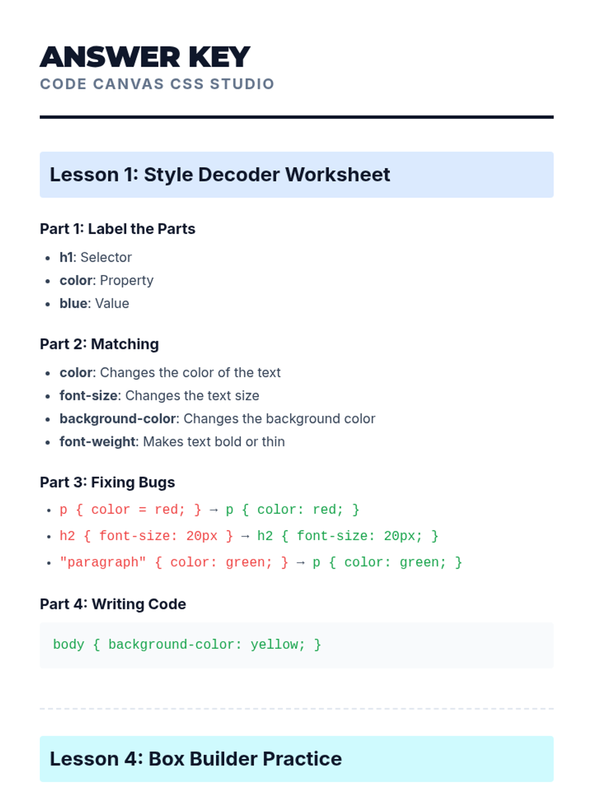 Students transition from basic HTML to CSS, learning how to style web pages with colors, fonts, and layouts. The sequence covers CSS syntax, color theory, typography, and the box model, culminating in a personal profile design project.