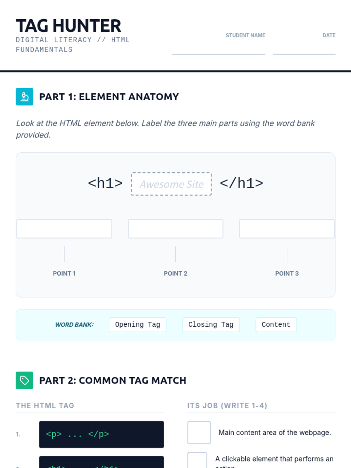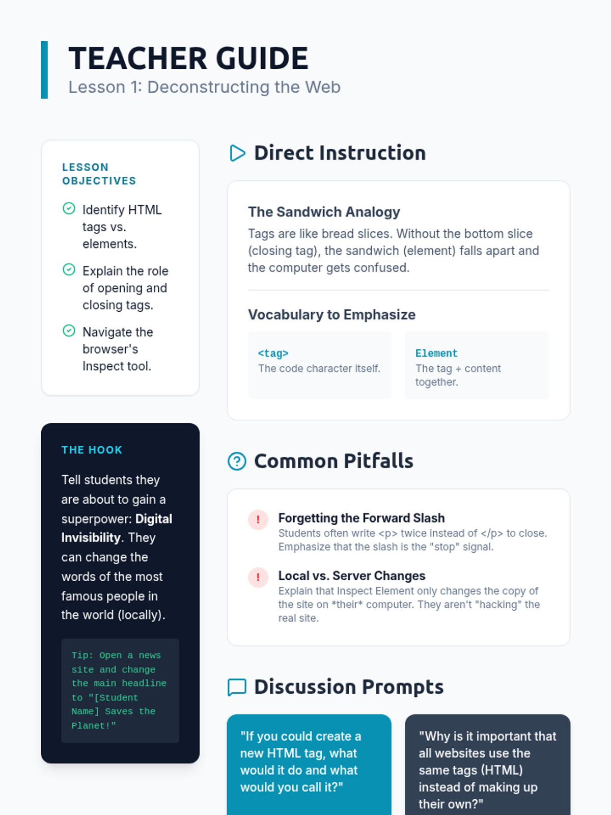 This foundational sequence introduces 6th-grade students to HTML, the language of the web. Students move from deconstructing existing sites using developer tools to building their own structurally sound, semantic web pages with headings, lists, images, and hyperlinks.