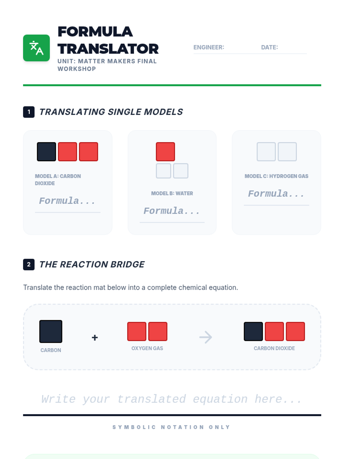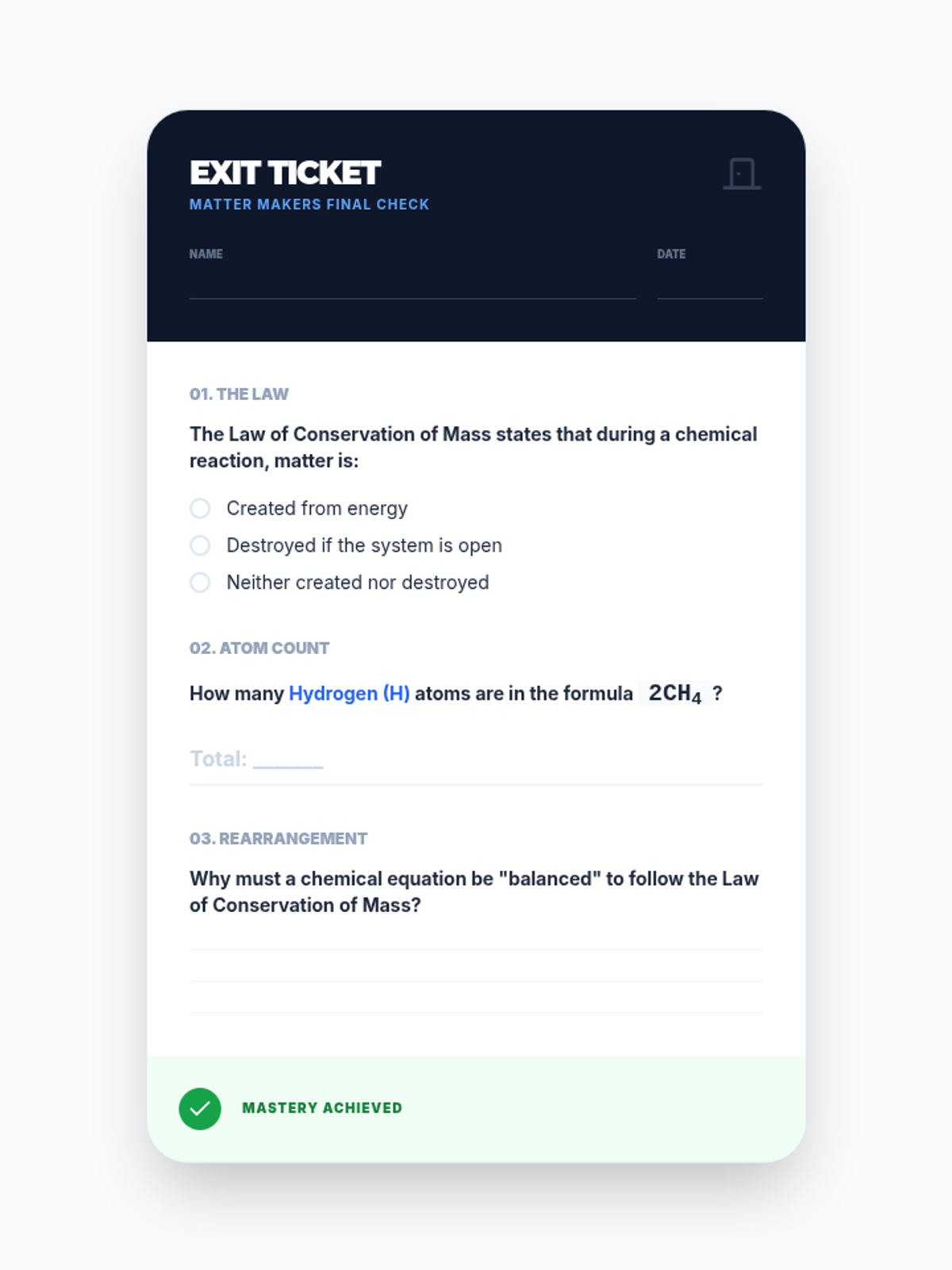 A hands-on chemistry unit for 6th grade focused on the Law of Conservation of Mass. Students use physical manipulatives to model molecules and simulate chemical reactions to understand why equations must be balanced.