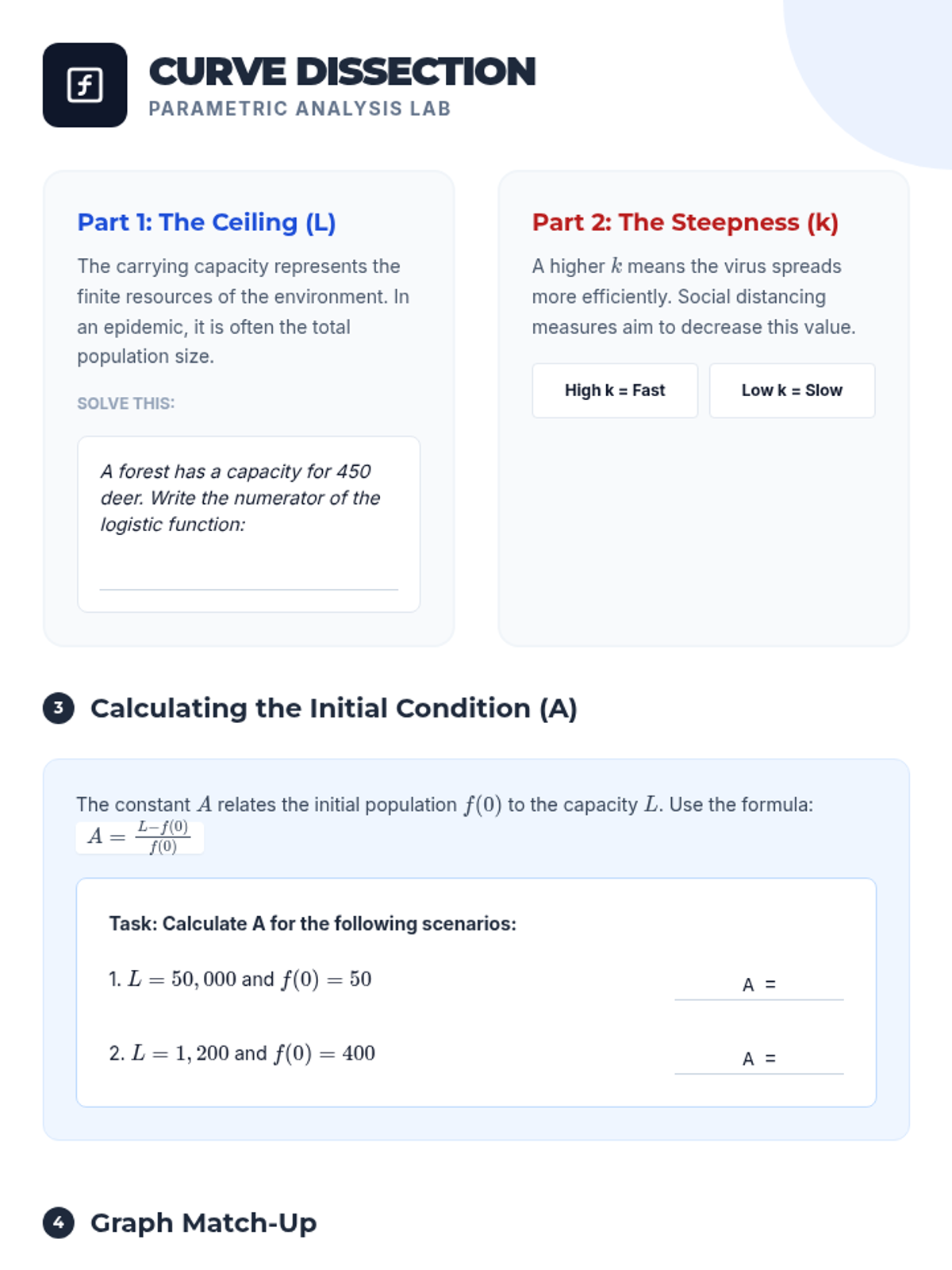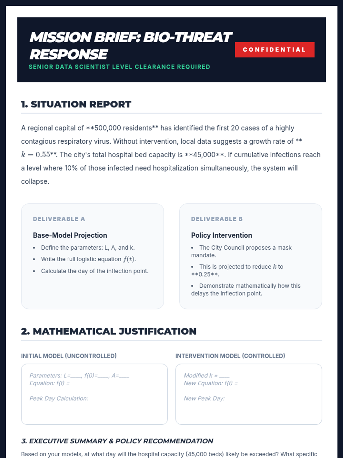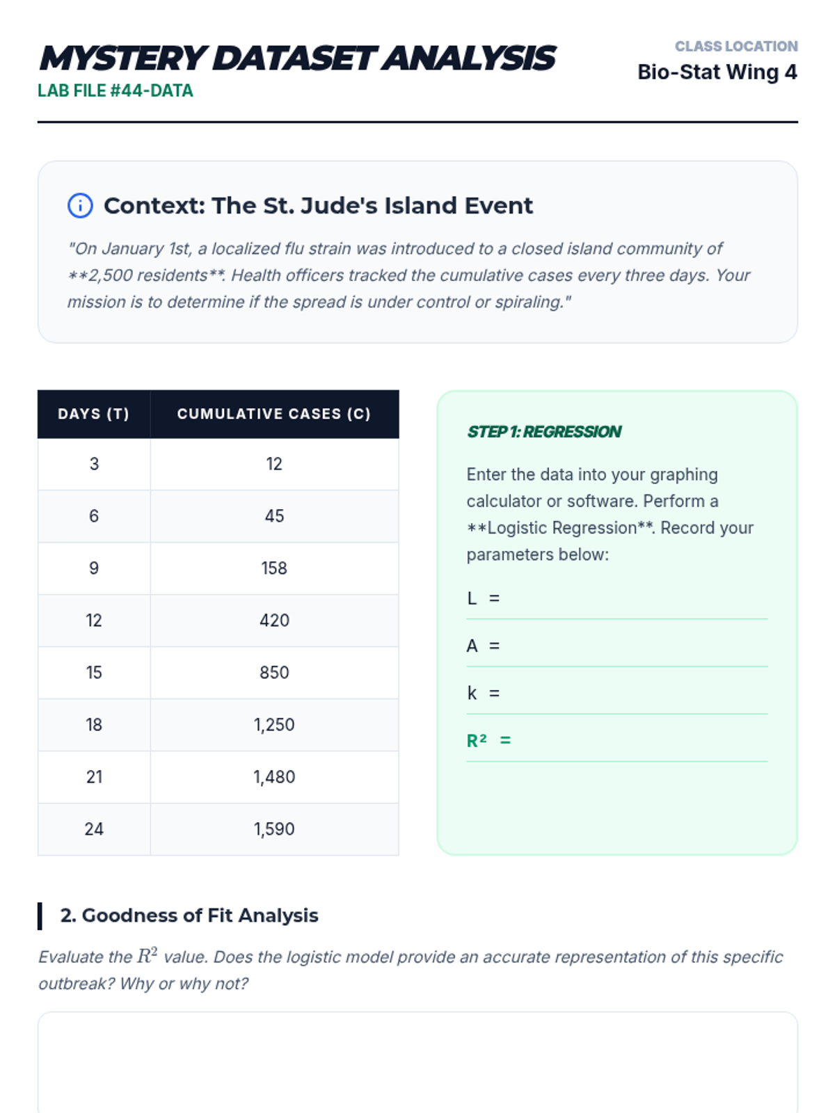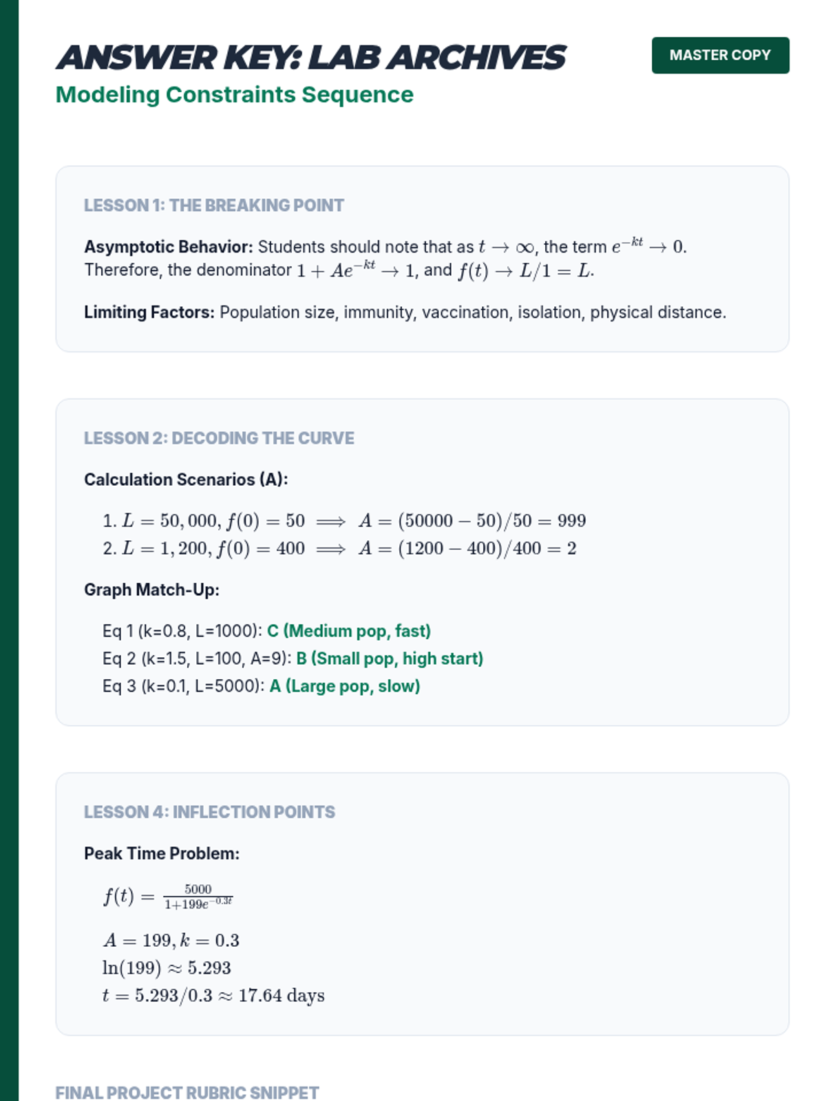 A high-level mathematics sequence for 12th-grade students exploring the transition from exponential growth to logistic models in the context of epidemiology. Students will analyze parameters, perform regression on real-world data, and use mathematical modeling to inform policy decisions.