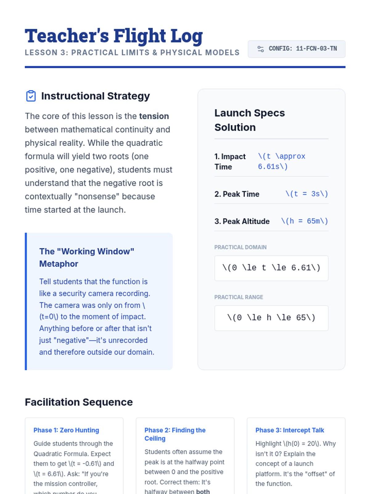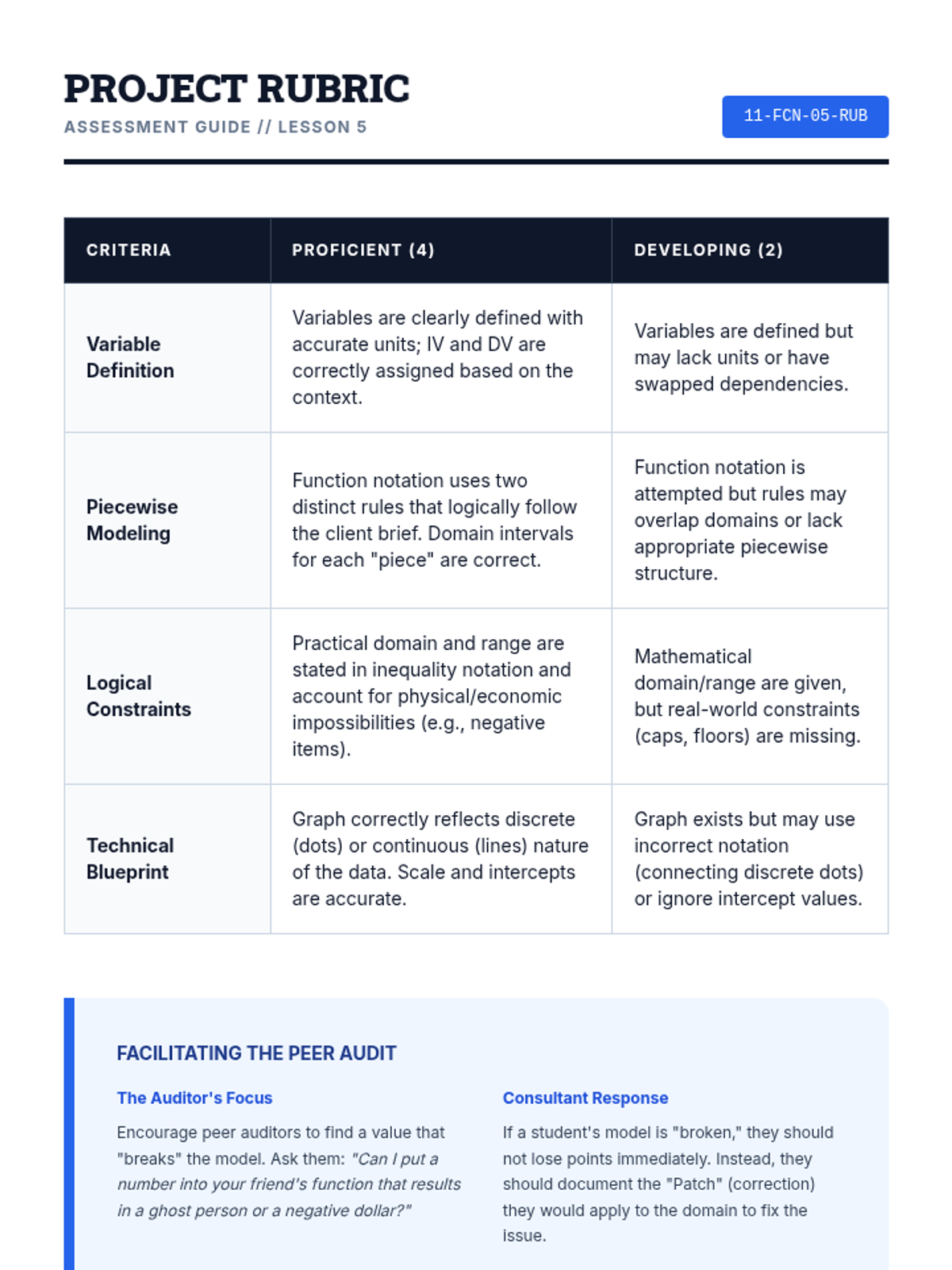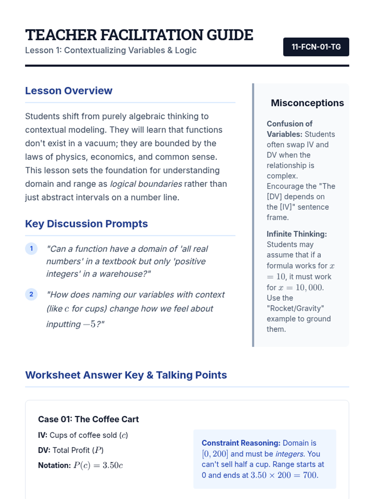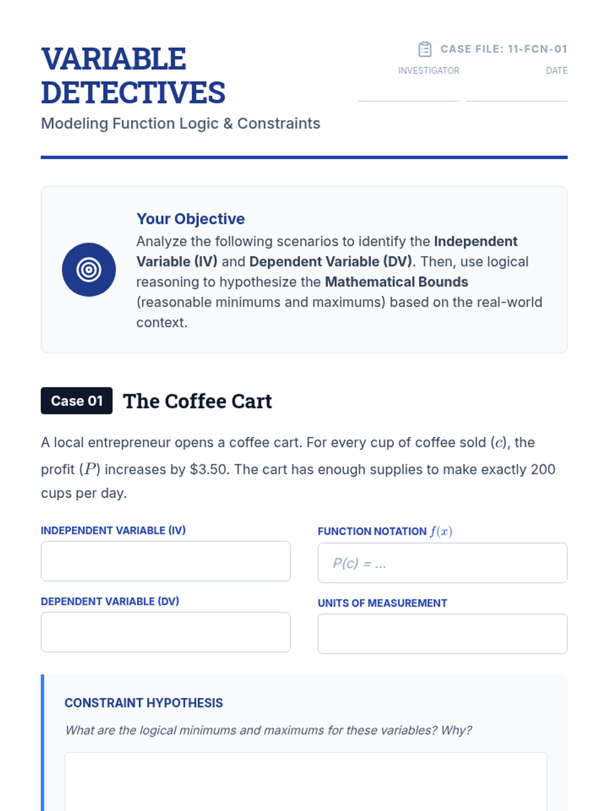 This 11th-grade sequence explores how real-world contexts impose logical constraints on mathematical functions, specifically affecting domain and range. Students progress from identifying variables to modeling discrete vs. continuous data, handling physical limits in physics-based models, and constructing piecewise functions for economic scenarios.