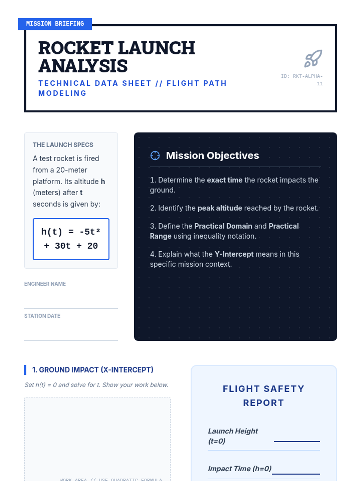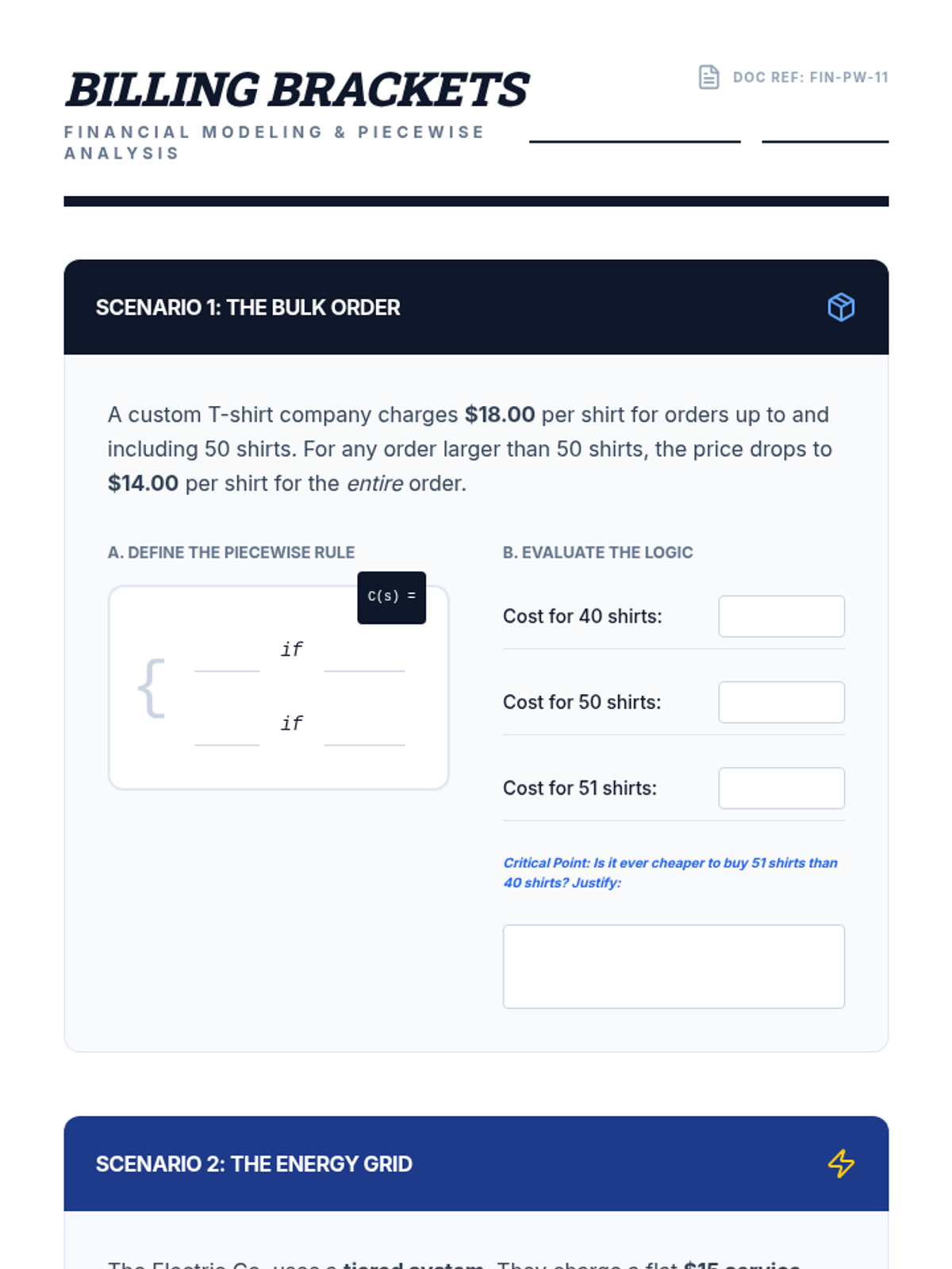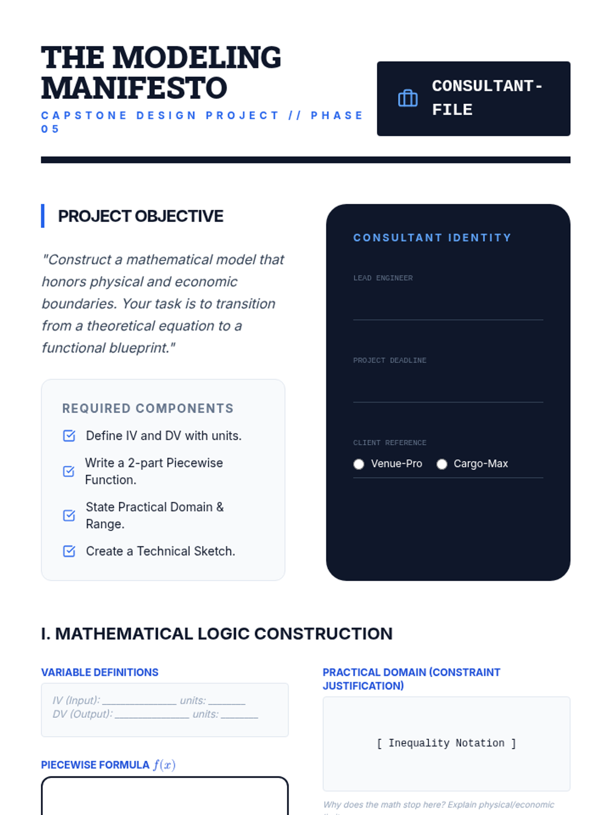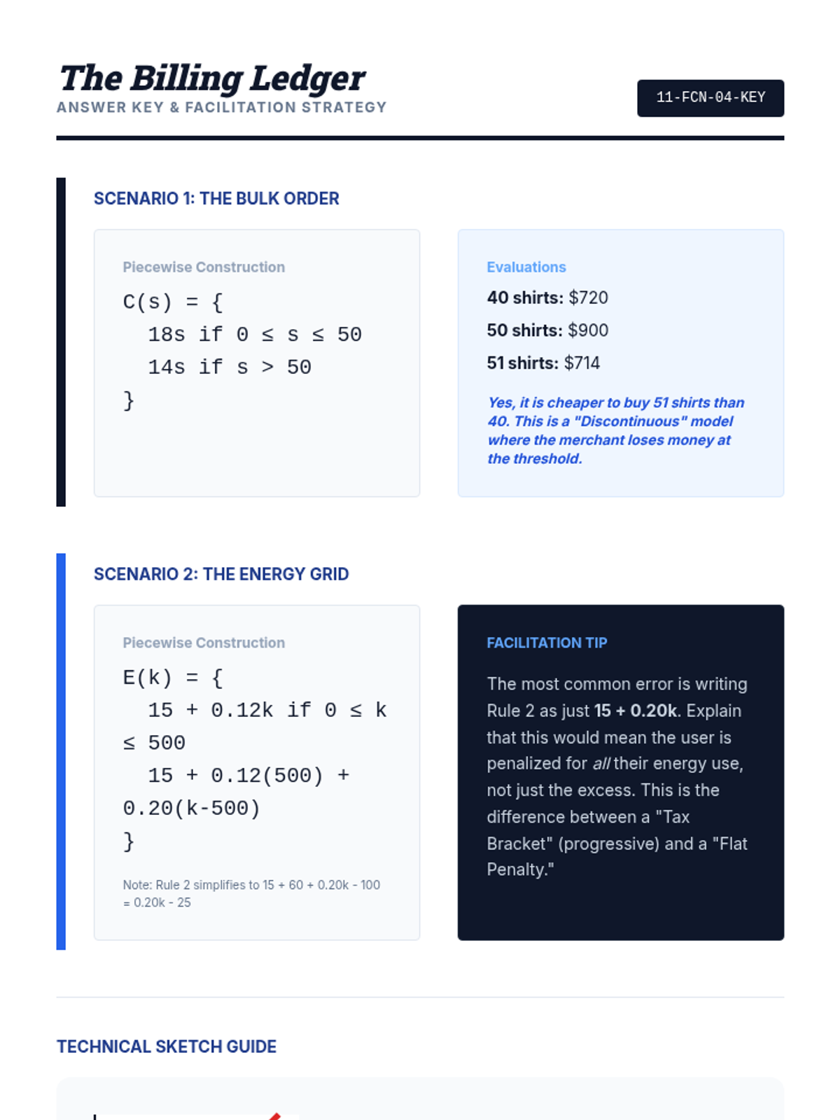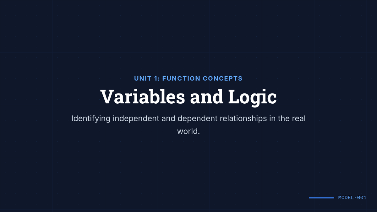 This 11th-grade sequence explores how real-world contexts impose logical constraints on mathematical functions, specifically affecting domain and range. Students progress from identifying variables to modeling discrete vs. continuous data, handling physical limits in physics-based models, and constructing piecewise functions for economic scenarios.