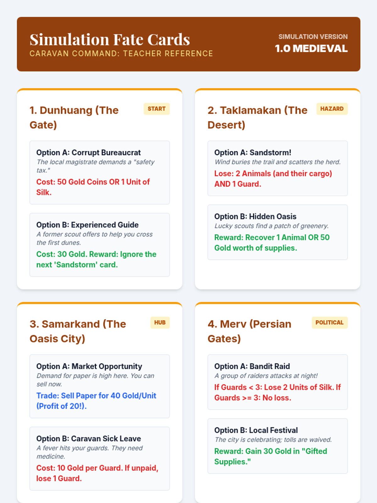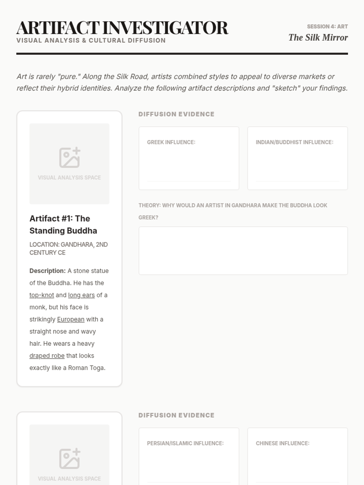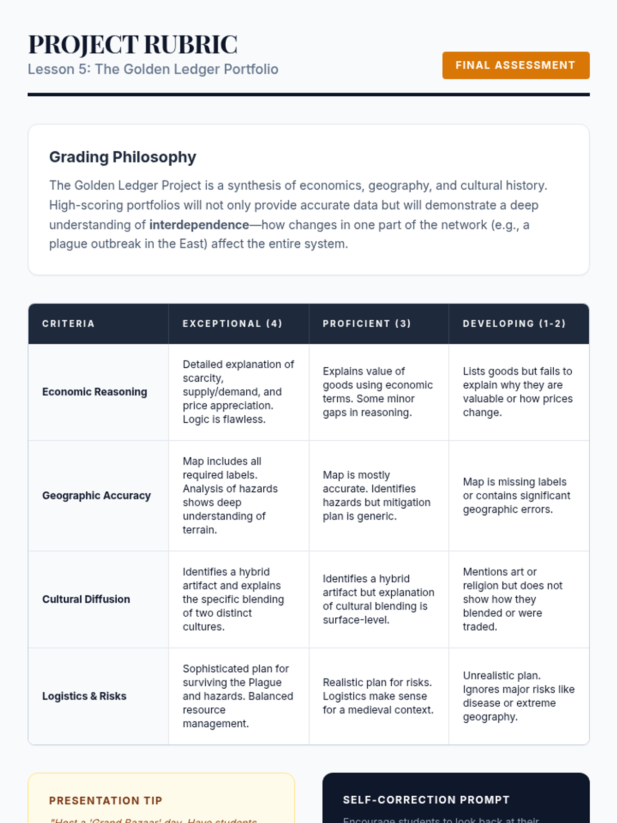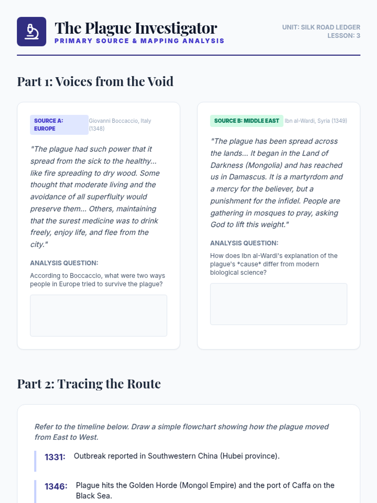 A comprehensive 9th-grade unit exploring the economic mechanics, logistics, and cultural consequences of the Silk Road trade networks. Students investigate supply and demand, simulate caravan travel, map the spread of the Black Death, and analyze artistic diffusion.