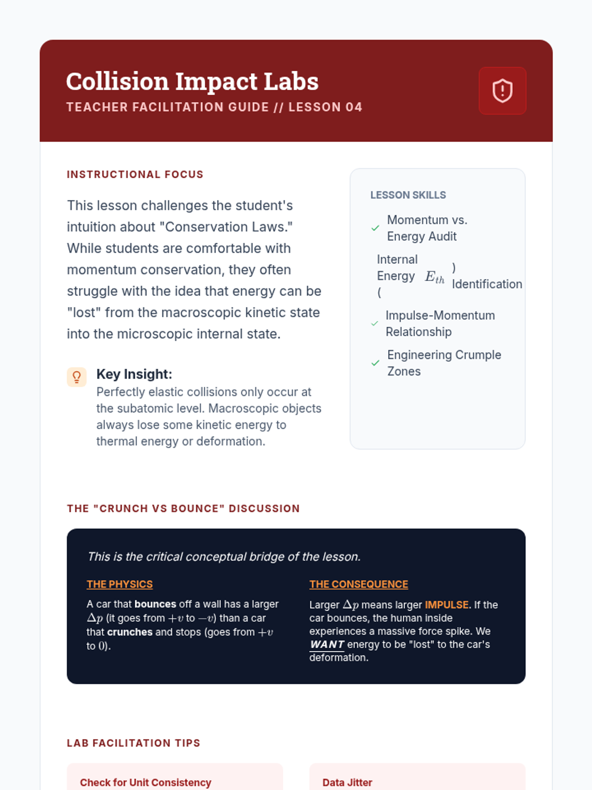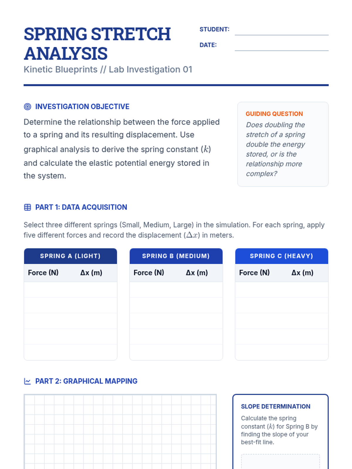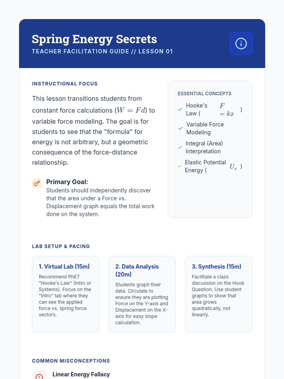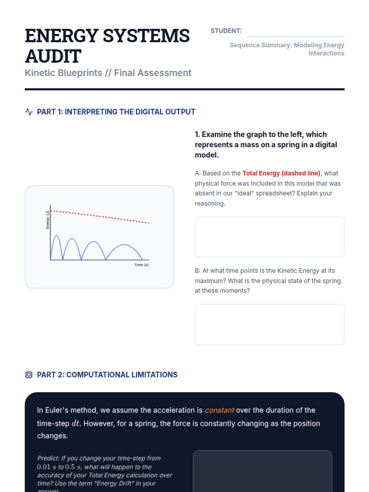 This advanced 12th-grade physics sequence explores energy interactions using simulations, graphical analysis, and computational modeling. Students move from Hooke's Law to complex non-linear systems, bungee jumping dynamics, and collision analysis, focusing on how variable forces perform work and how energy is conserved in multi-stage events.
