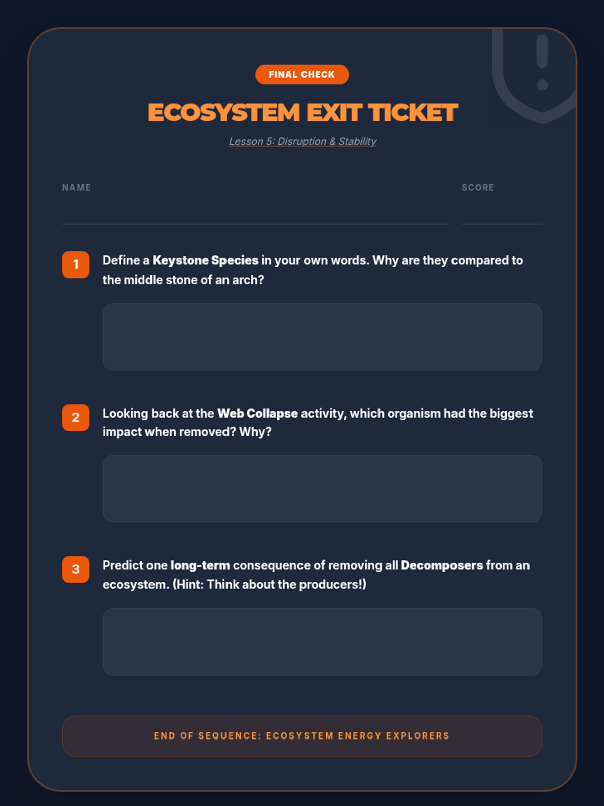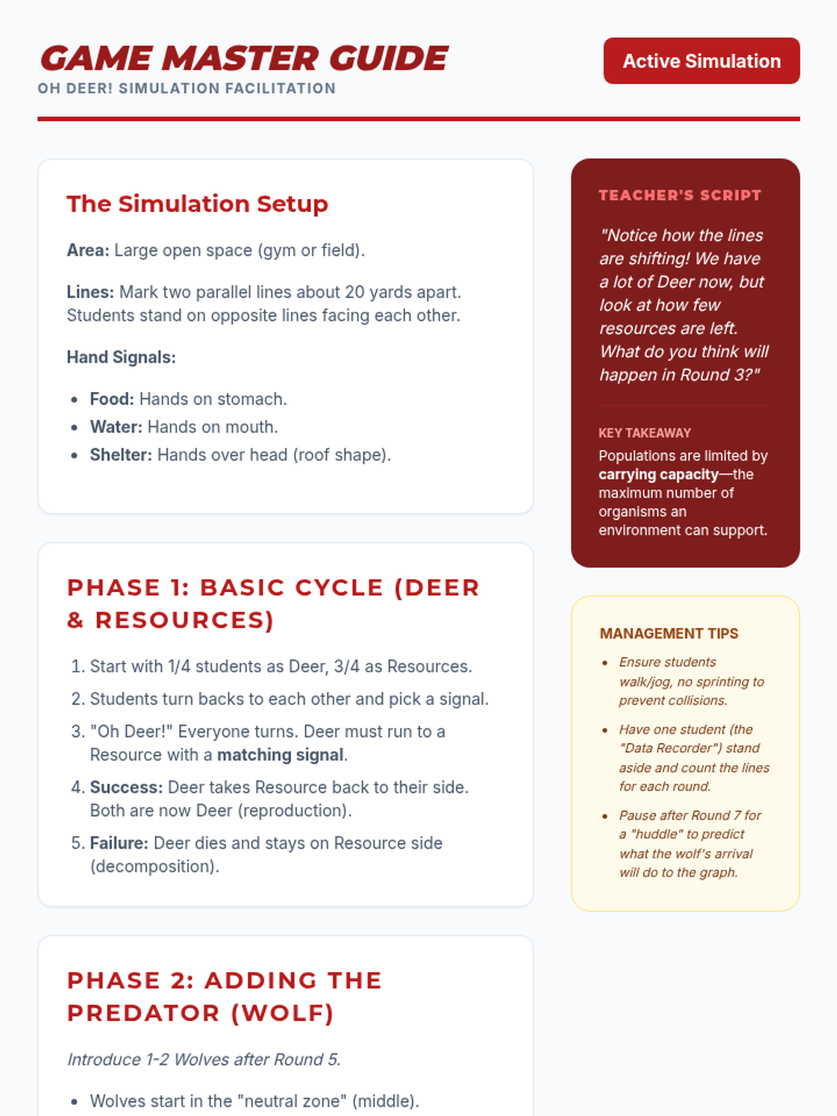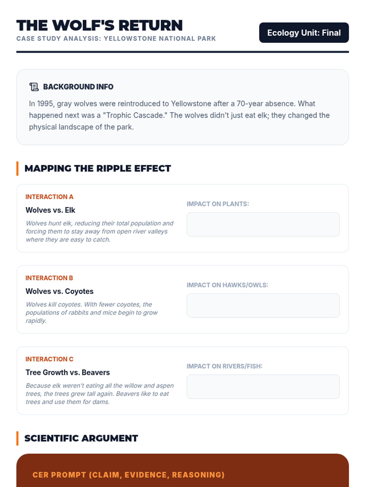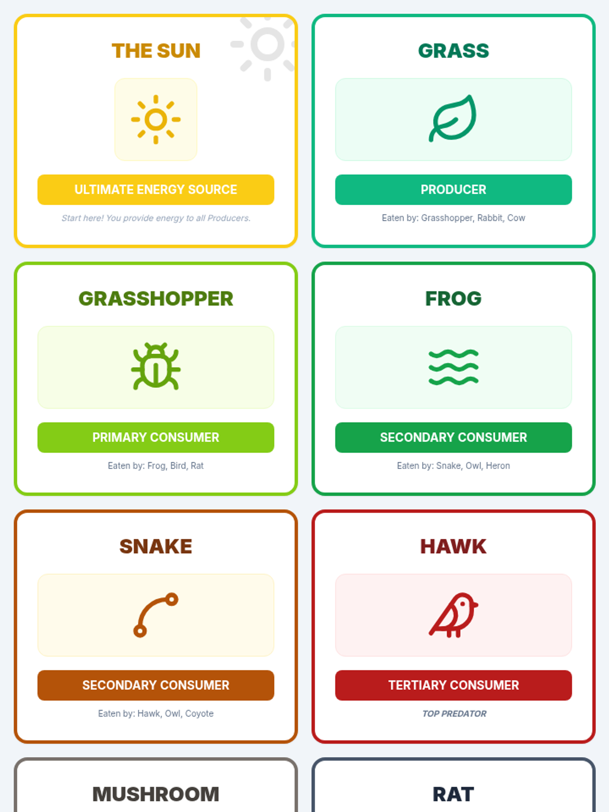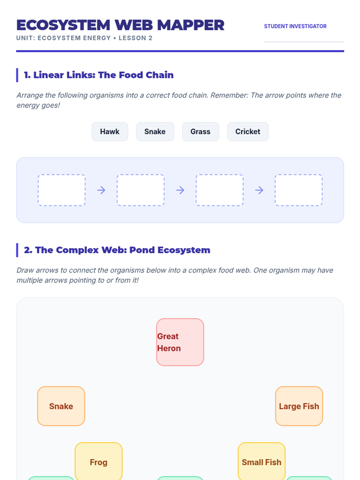 A game-based sequence exploring energy flow in ecosystems, trophic levels, food webs, and the impact of keystone species through simulations and modeling.