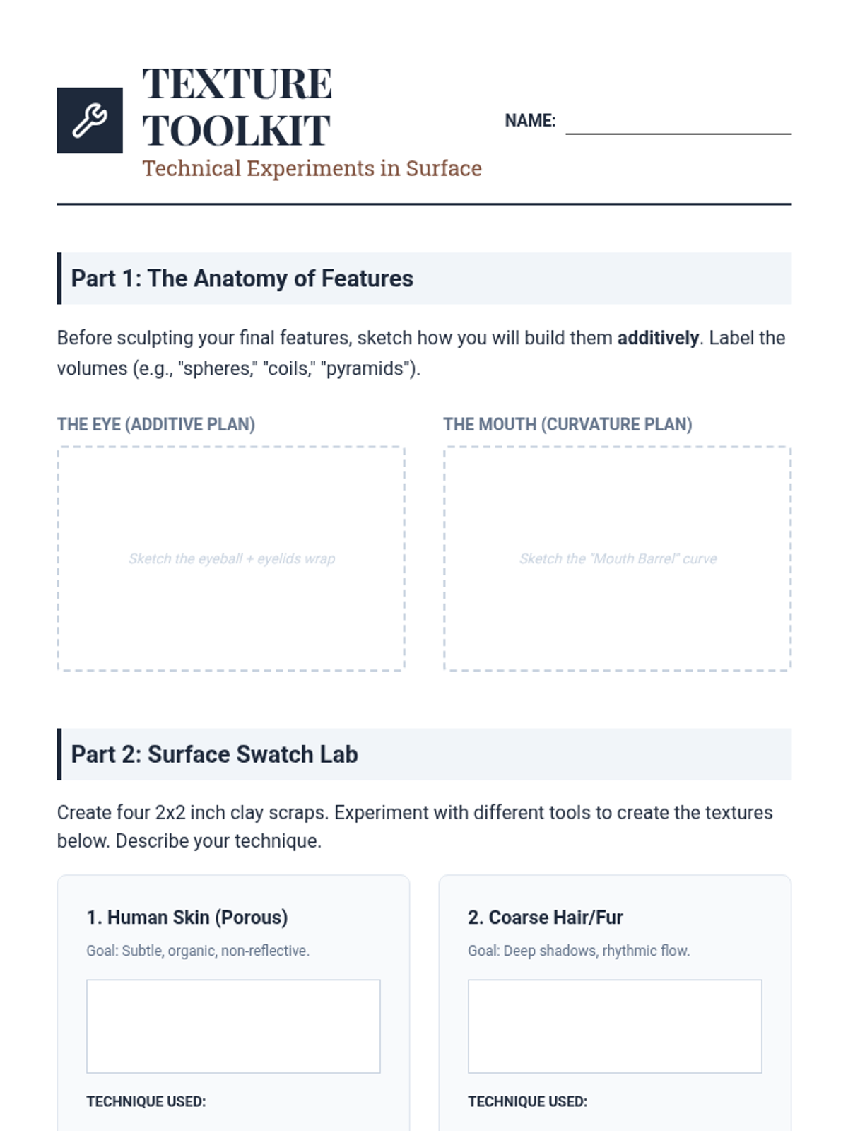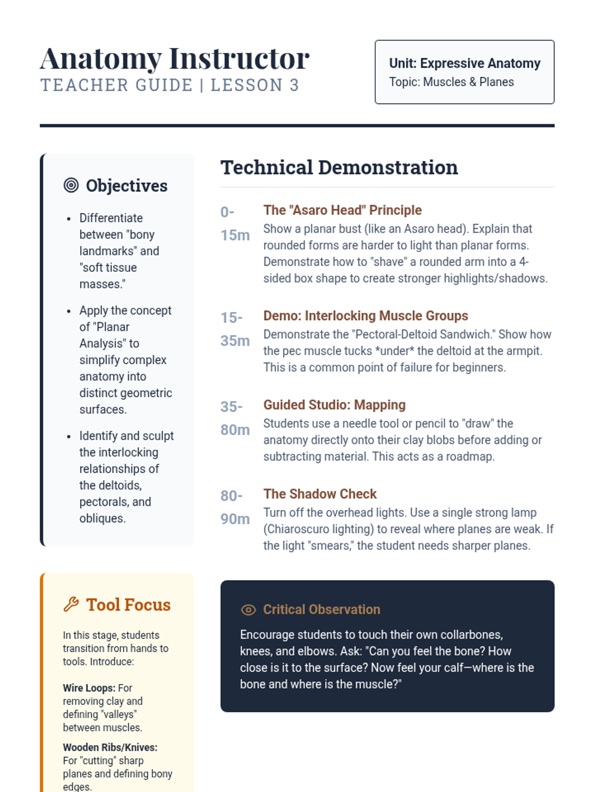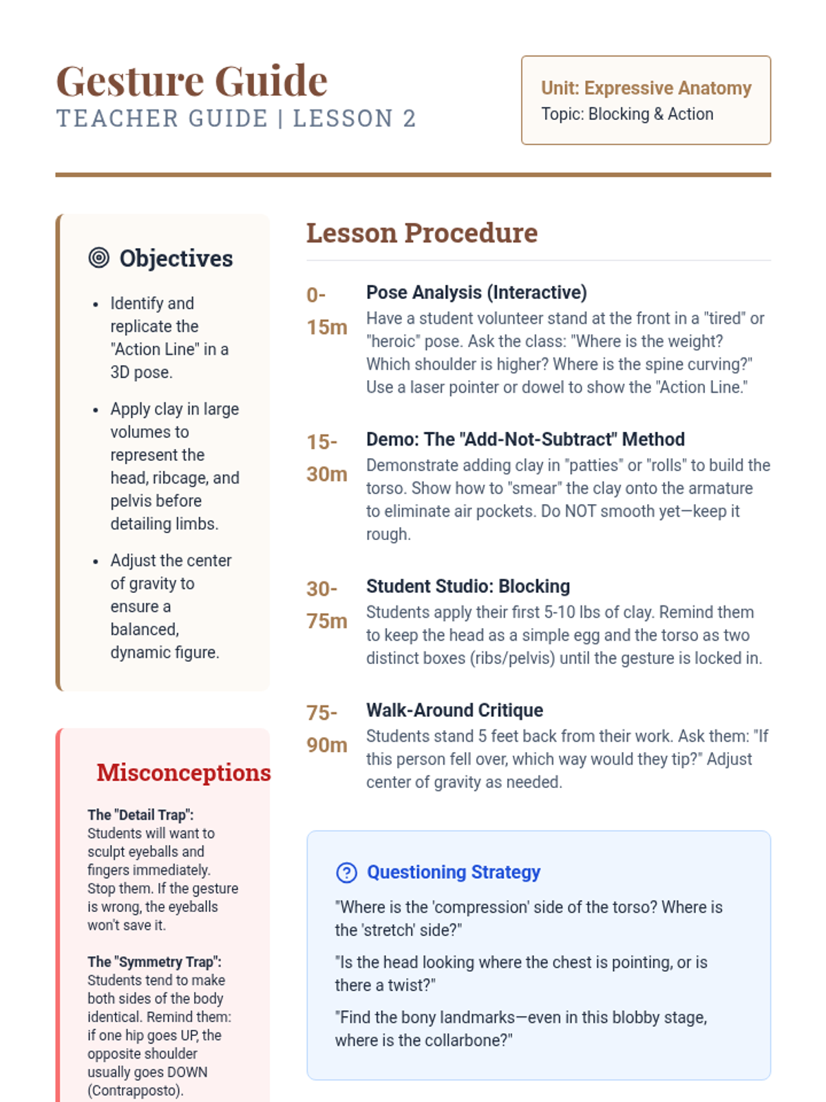 A comprehensive 10th-grade sculpture unit focusing on additive clay modeling techniques to create expressive anatomical studies. Students progress from skeletal armature construction to gestural massing, muscular definition, and technical preparation for kiln firing.