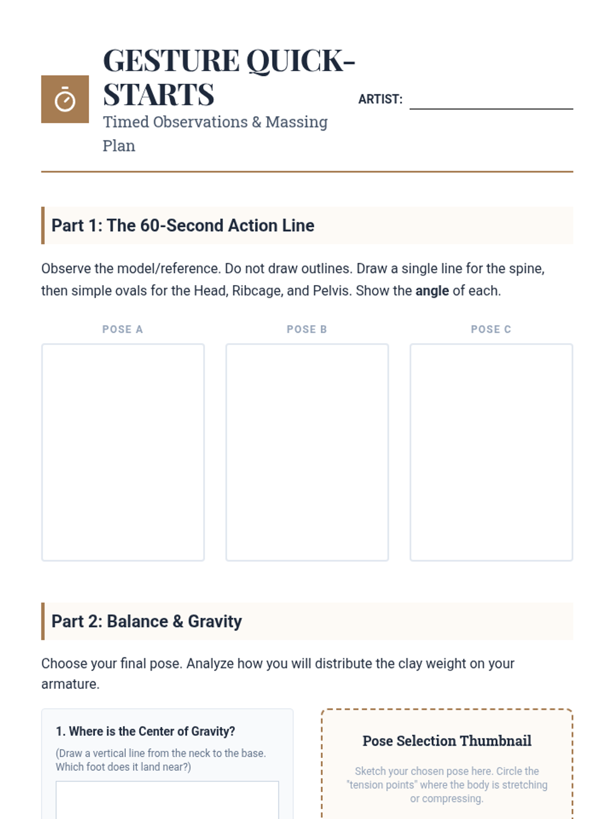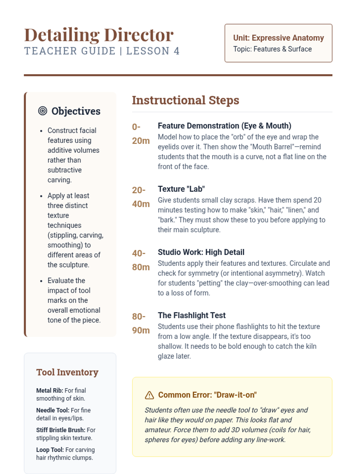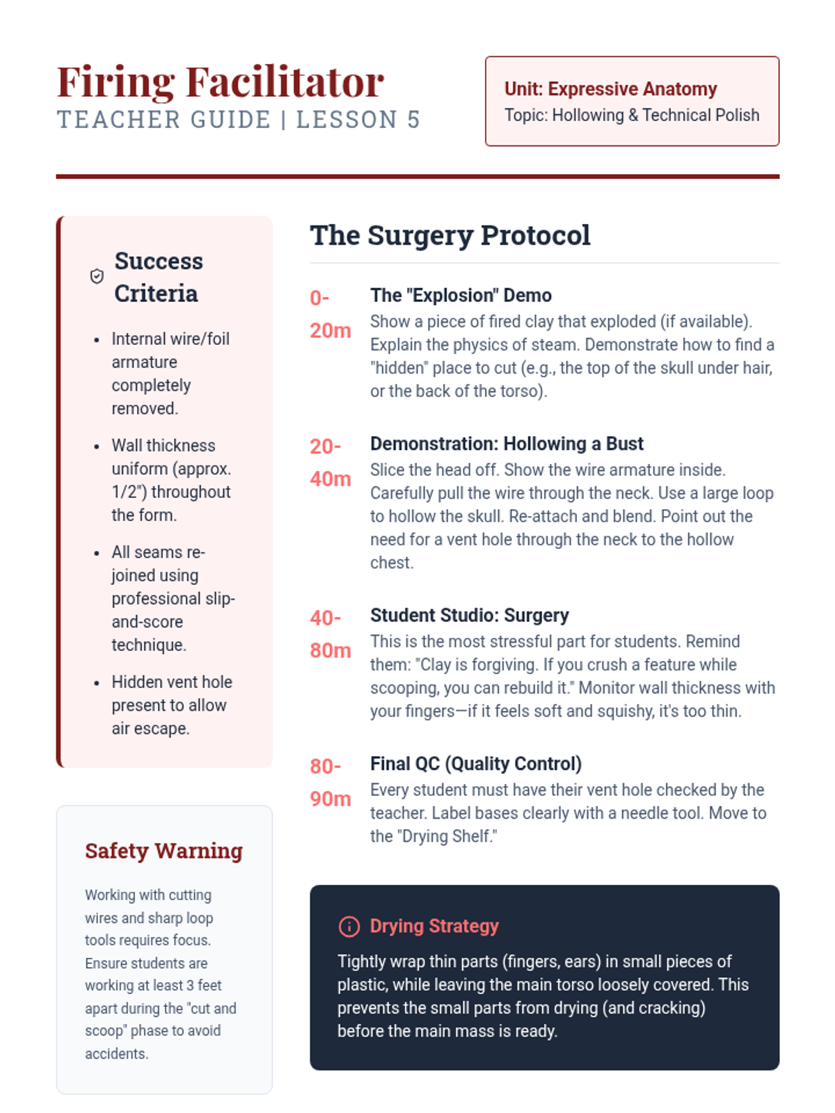 A comprehensive 10th-grade sculpture unit focusing on additive clay modeling techniques to create expressive anatomical studies. Students progress from skeletal armature construction to gestural massing, muscular definition, and technical preparation for kiln firing.