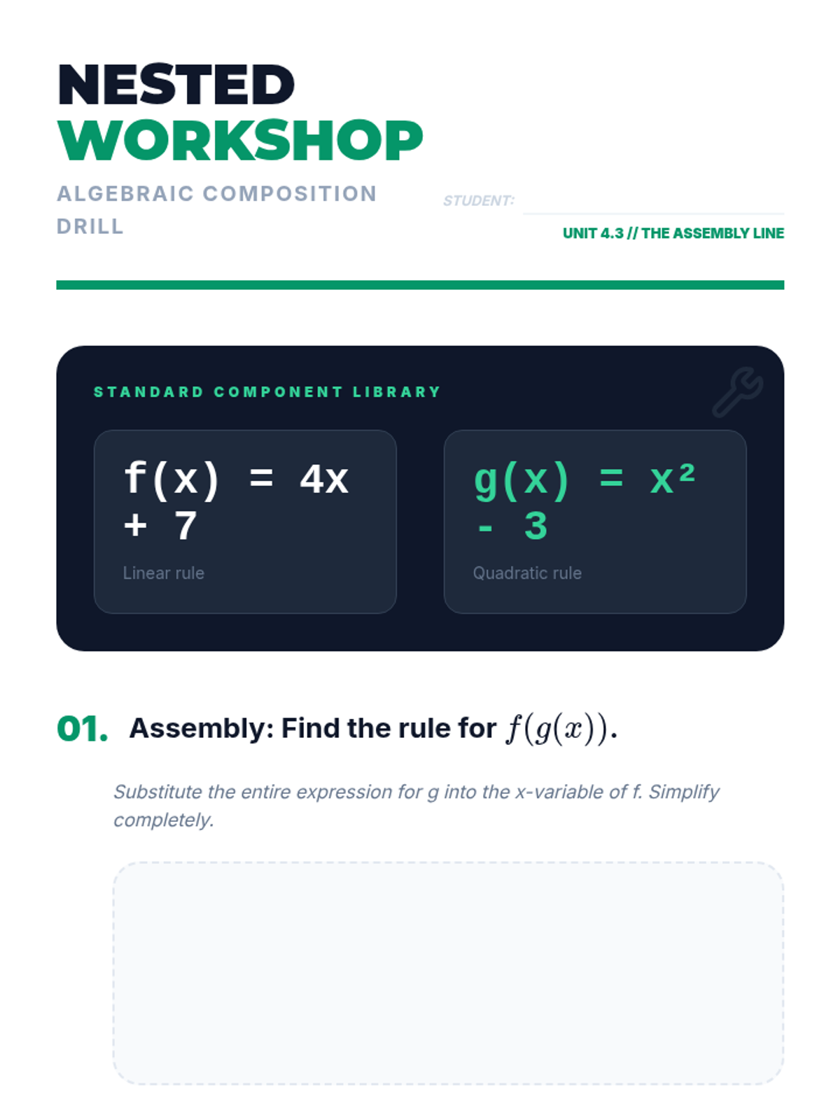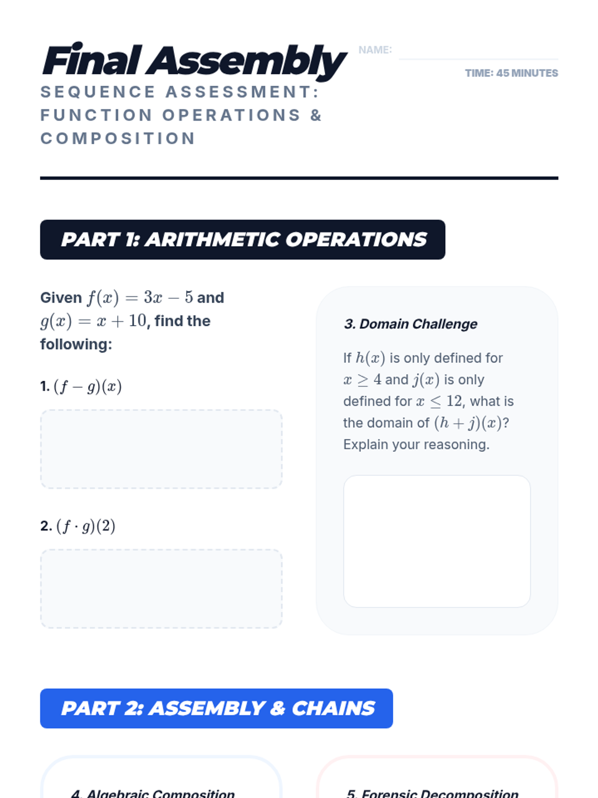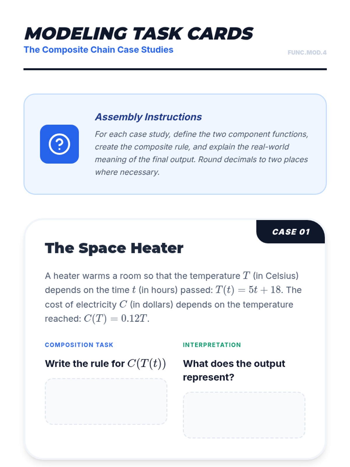 This sequence explores how functions can be treated as mathematical objects that can be added, subtracted, multiplied, and composed. Students move from basic arithmetic operations on business models to the abstract concept of function composition and decomposition, applying these skills to real-world scenarios like profit modeling and geometric expansion.