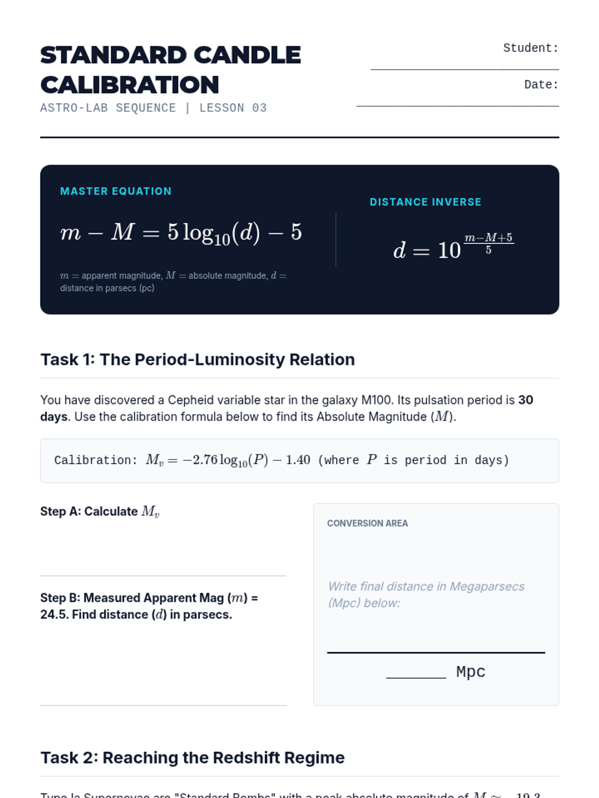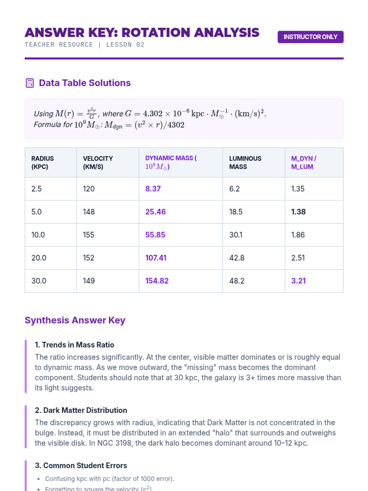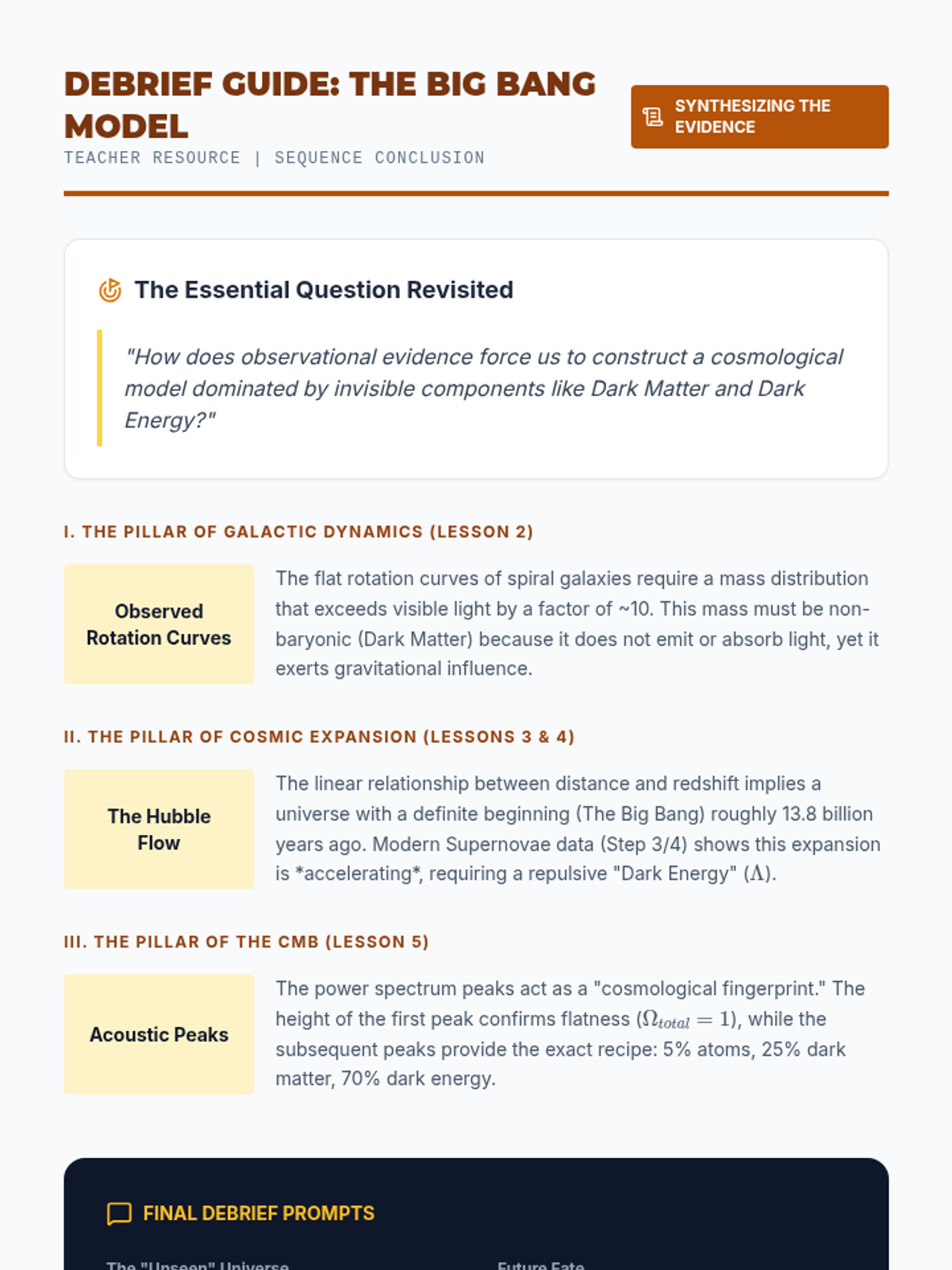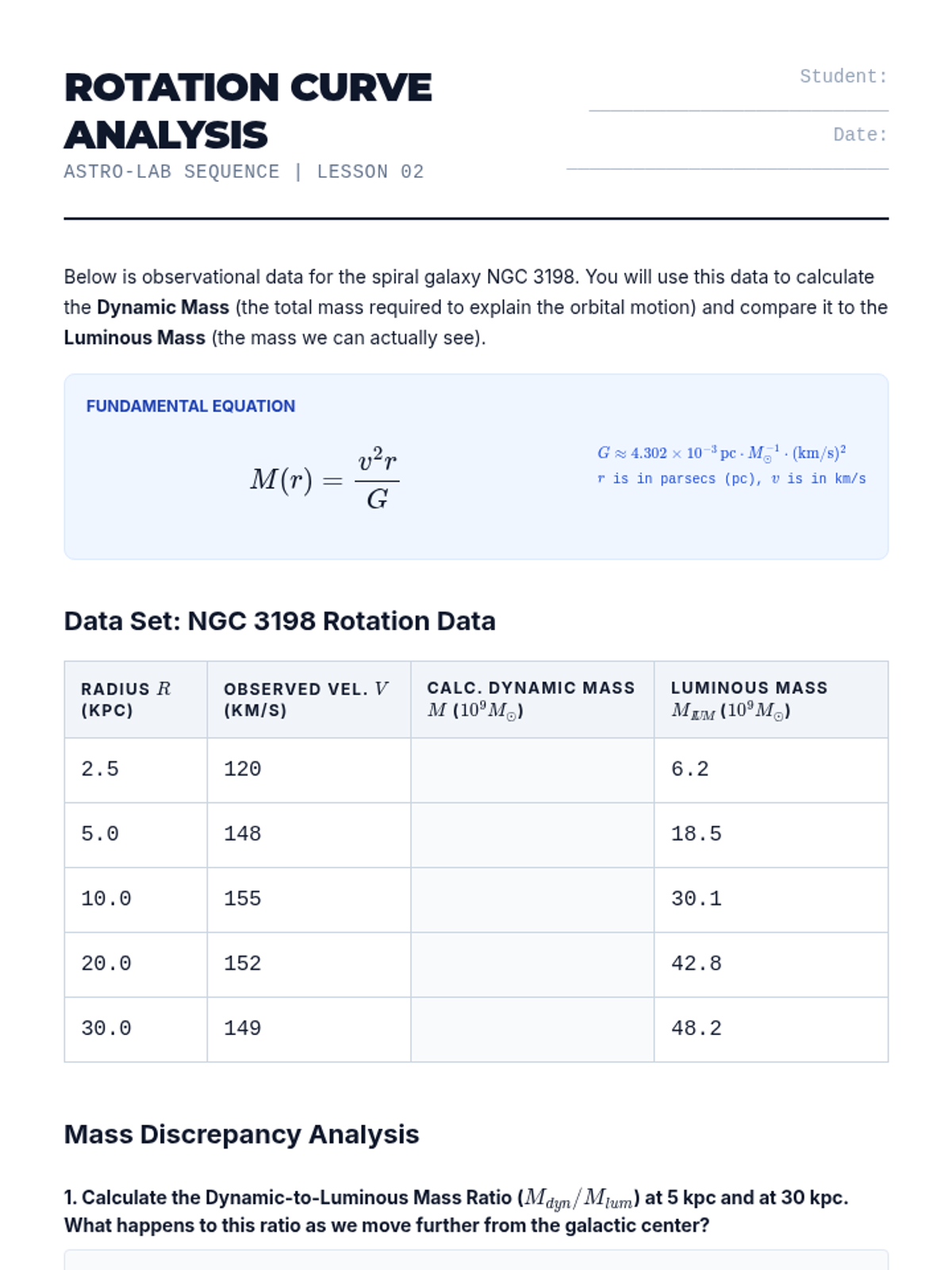 An undergraduate-level investigation into the large-scale structure of the universe, from galactic dynamics to cosmic expansion and the Big Bang. Students use real astrophysical data to model dark matter distributions, calibrate the cosmic distance ladder, and calculate the Hubble constant.