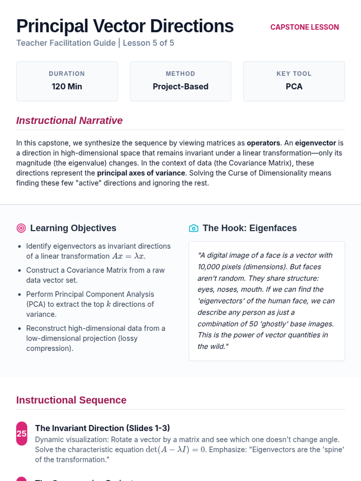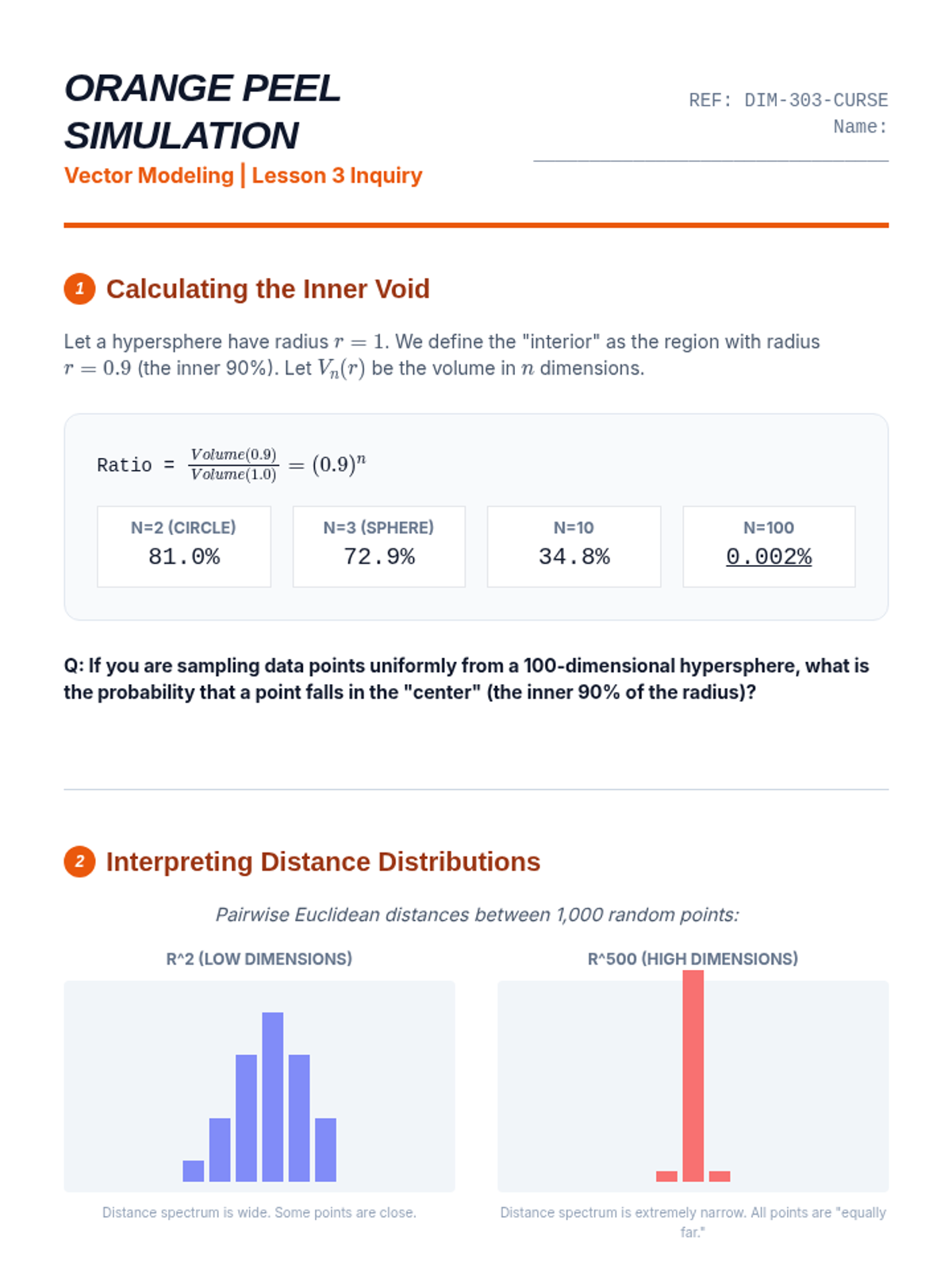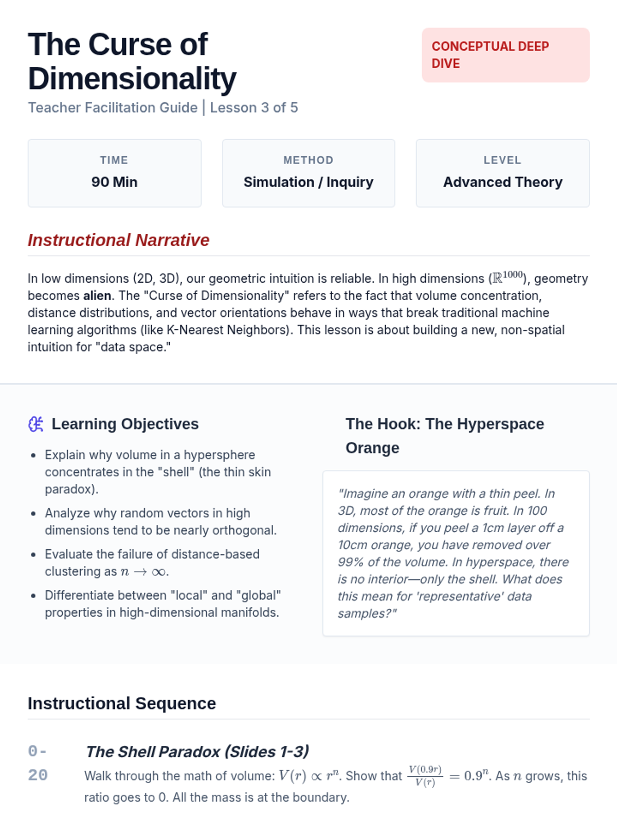 A graduate-level exploration of vector quantities as high-dimensional data points. This sequence bridges linear algebra and data science, examining how geometric intuitions like magnitude, direction, and distance evolve and paradoxically degrade in high-dimensional spaces.