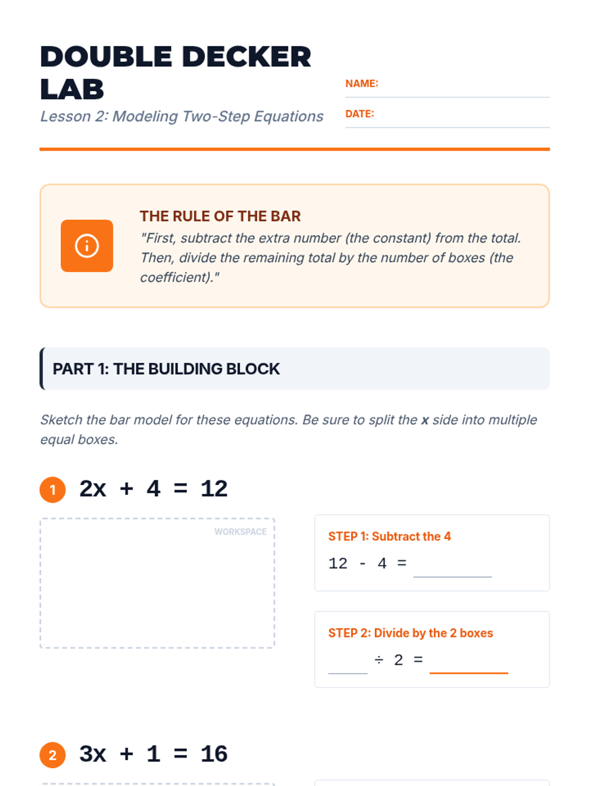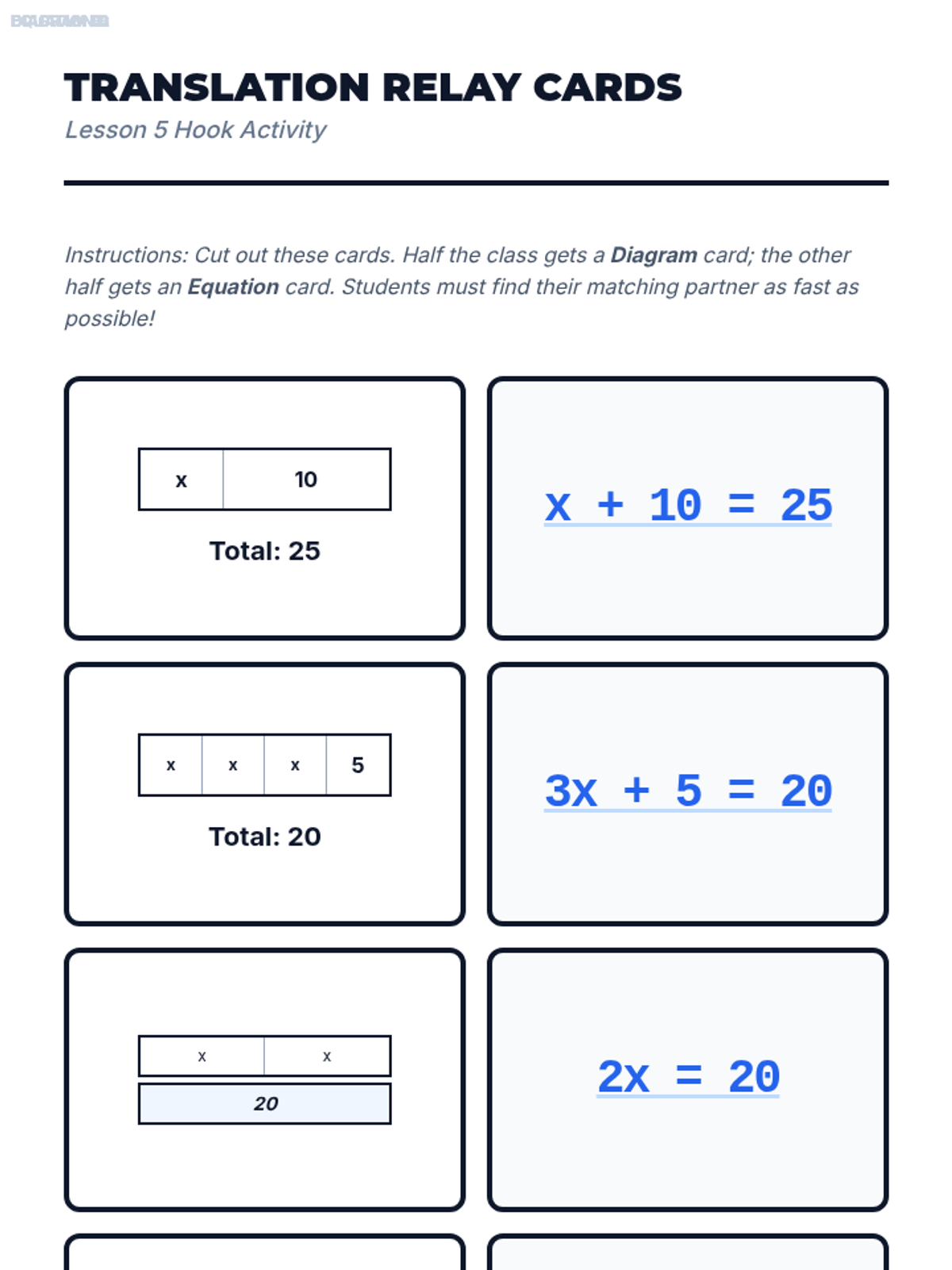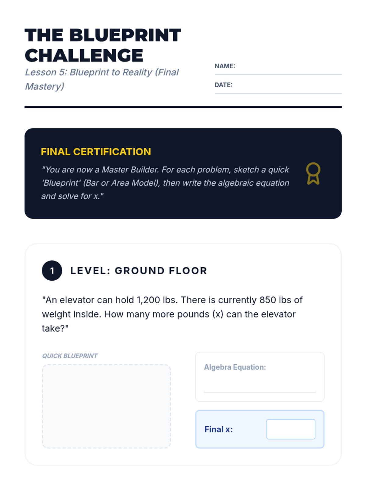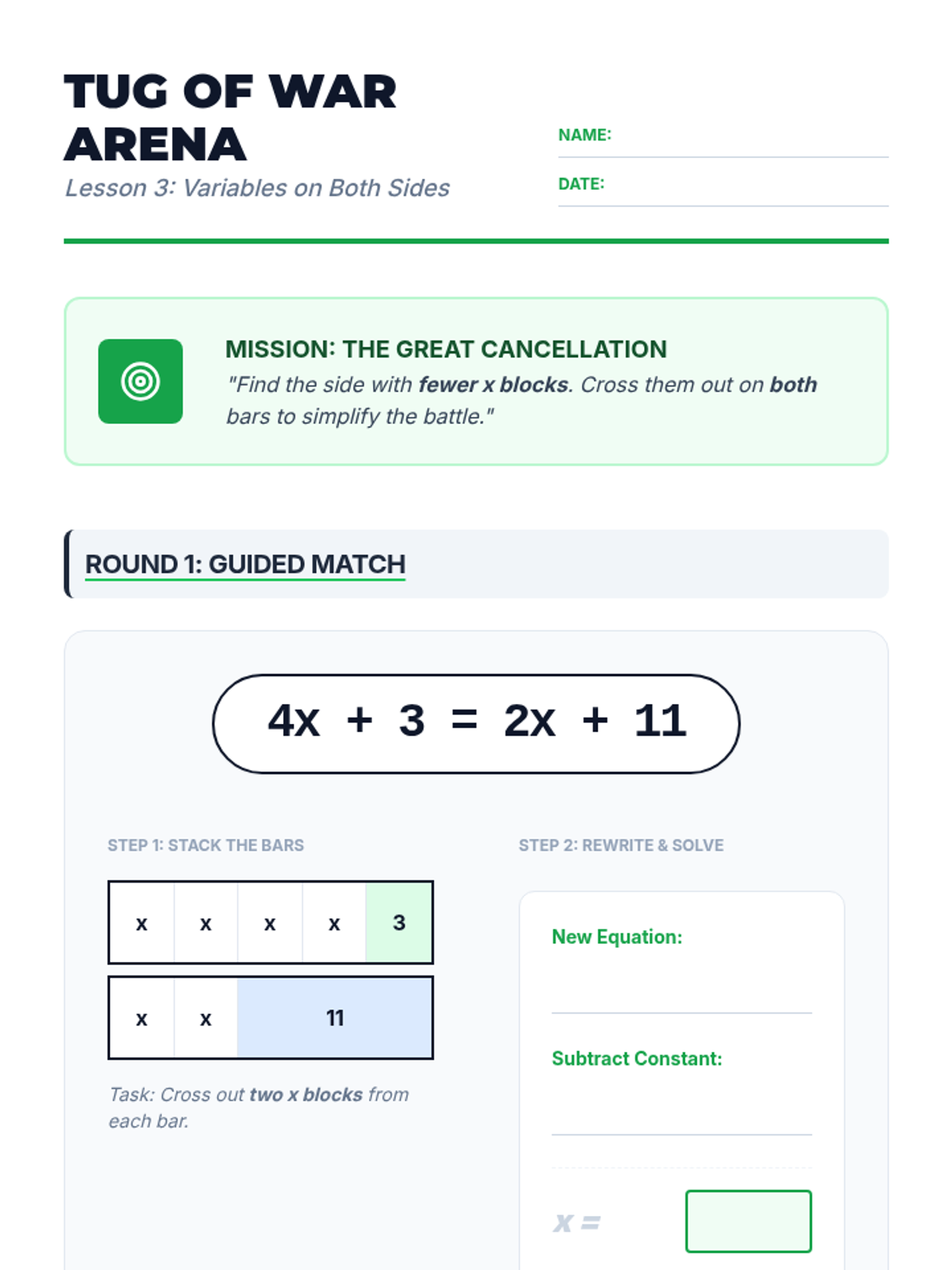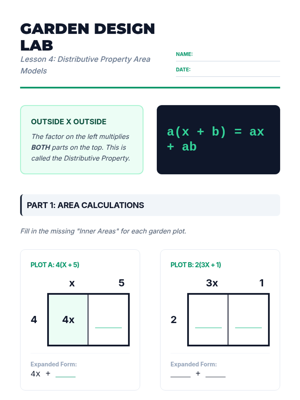A 5-lesson sequence for 9th-grade special education students transitioning from arithmetic to algebra using tape diagrams and area models to visualize linear relationships.