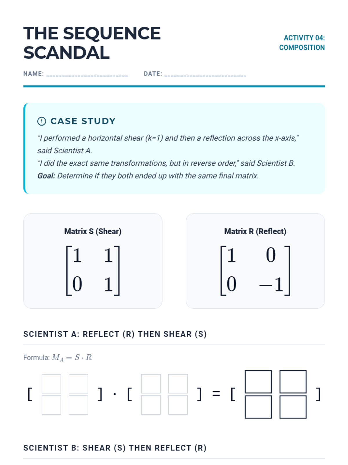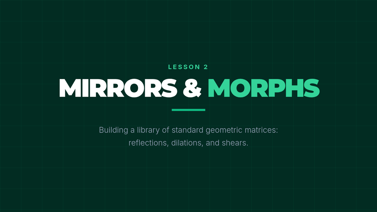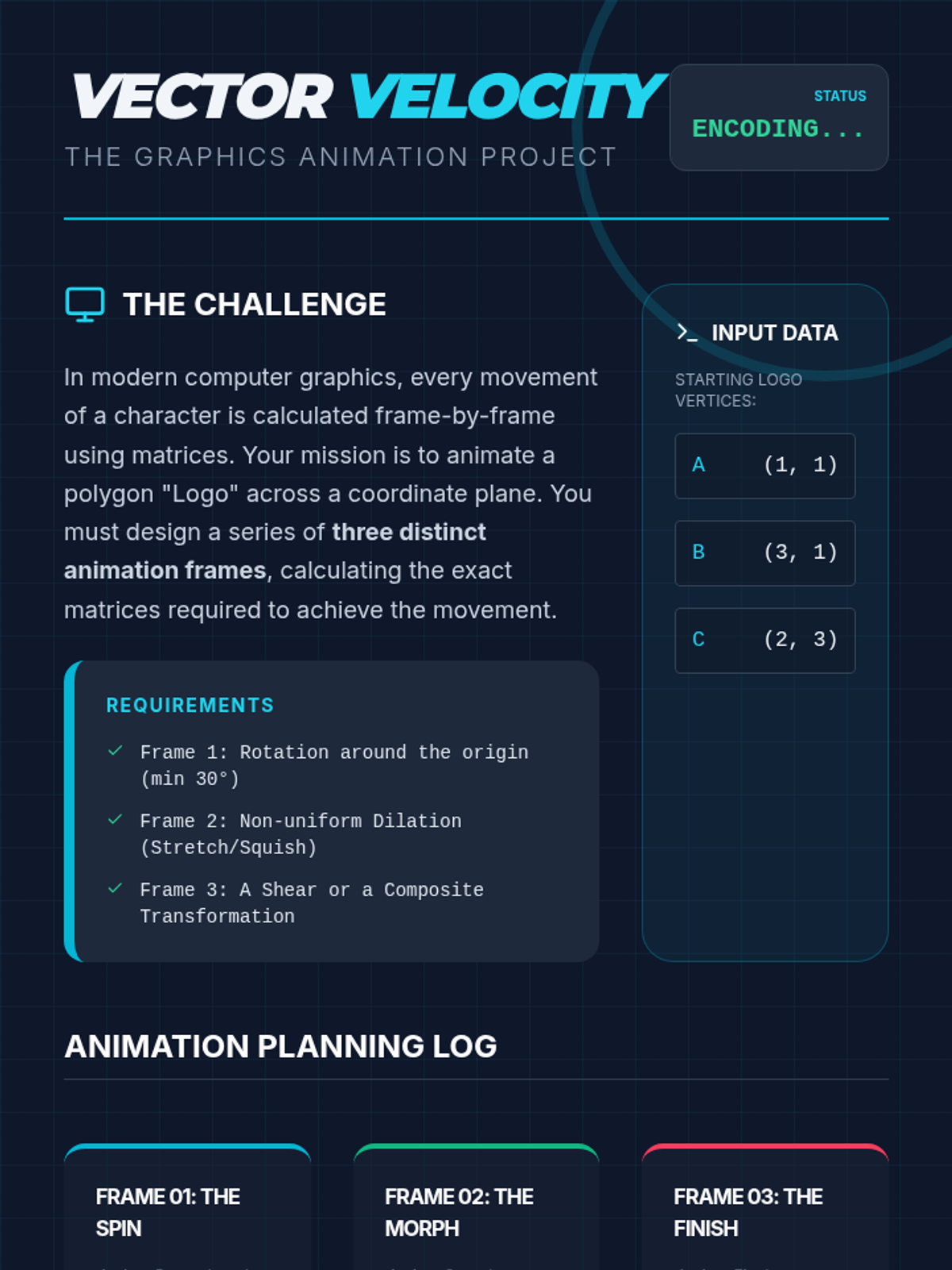 This sequence explores matrices as geometric transformations of vectors. Students learn to visualize and calculate how matrices stretch, rotate, reflect, and shear space, culminating in a project where they design a computer graphics animation sequence.