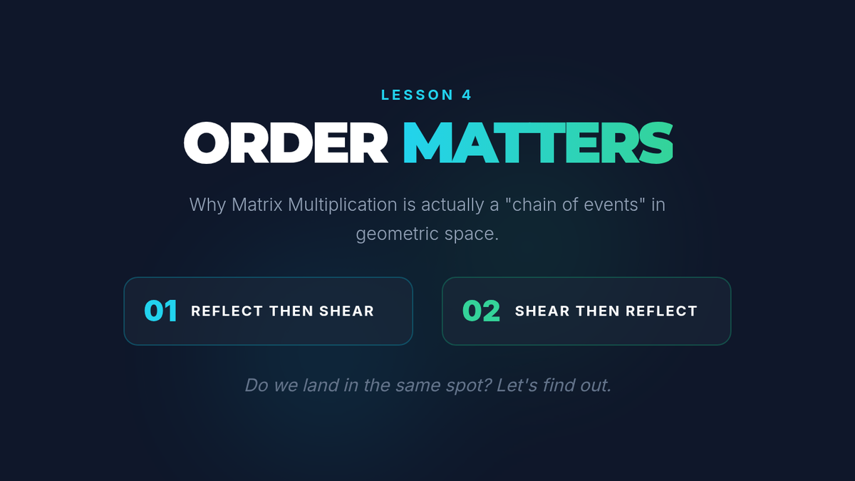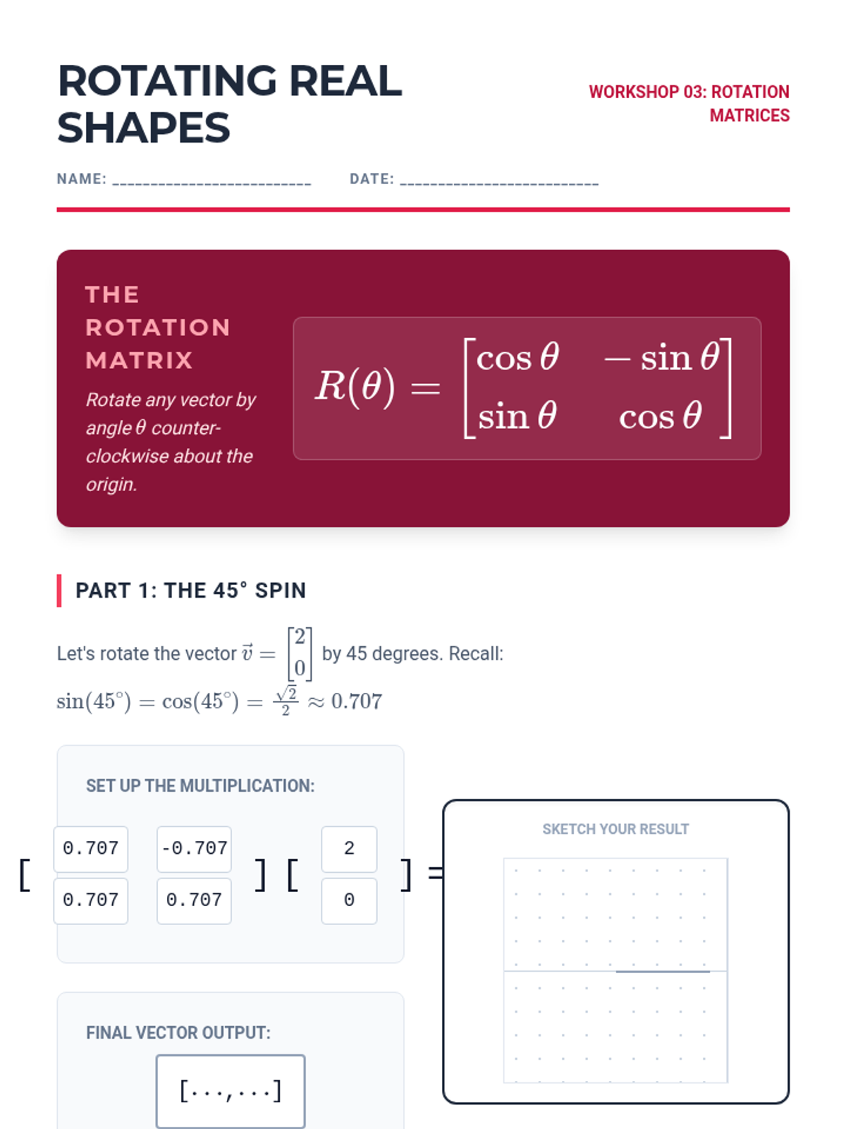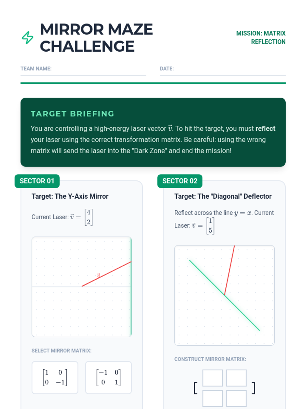 This sequence explores matrices as geometric transformations of vectors. Students learn to visualize and calculate how matrices stretch, rotate, reflect, and shear space, culminating in a project where they design a computer graphics animation sequence.