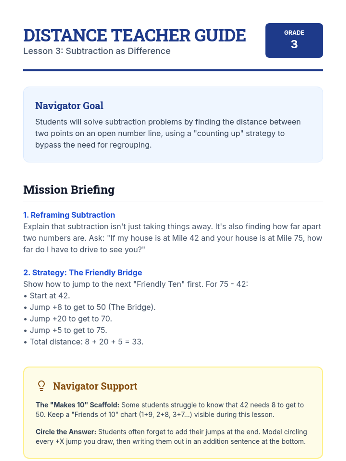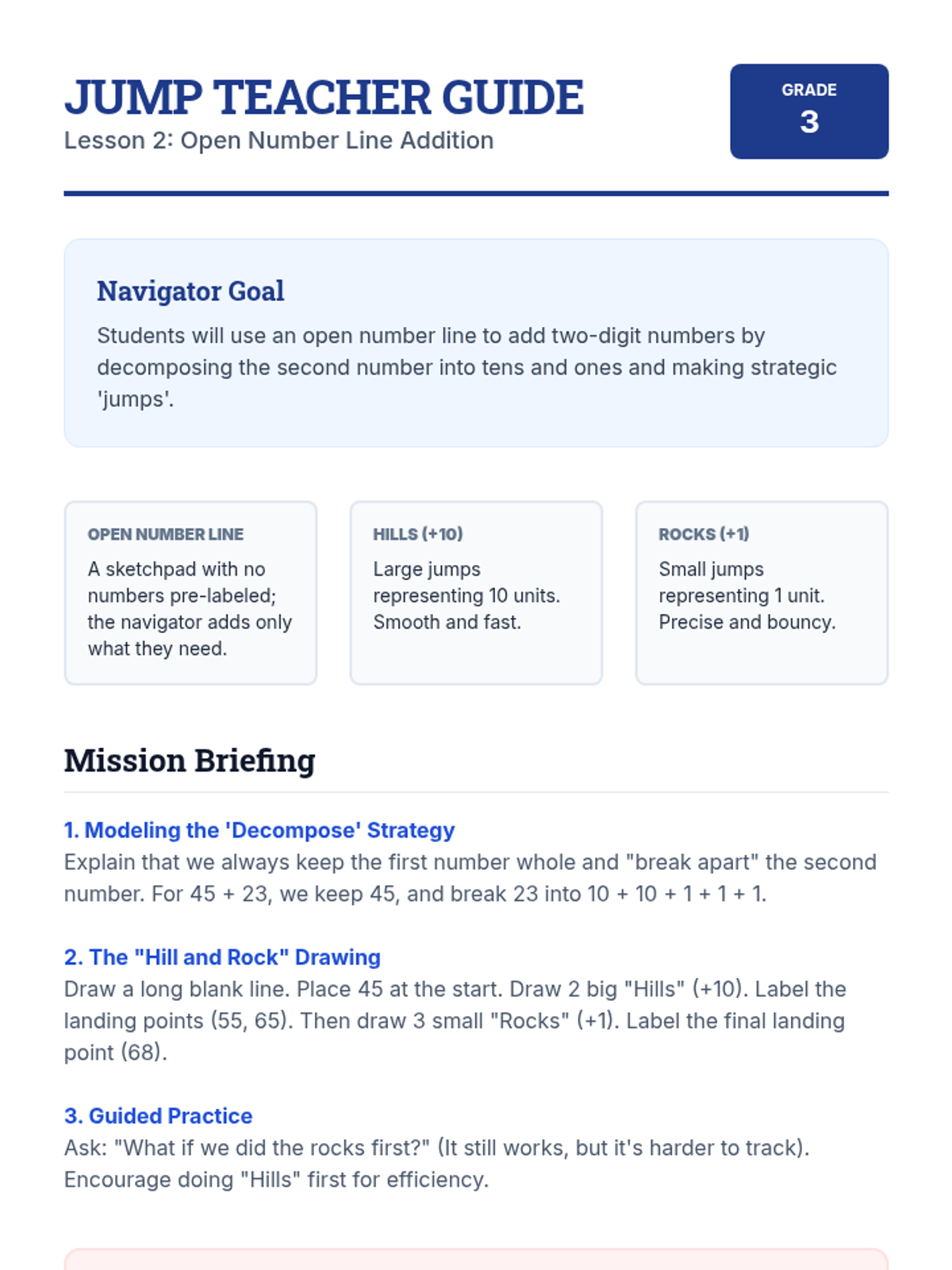 A specialized sequence for 3rd-grade students focusing on using number lines as visual cognitive scaffolds. Students progress from physical movement on a floor-sized line to using 'open' number lines for addition, subtraction, elapsed time, and fractions, providing a consistent strategy for solving complex problems.