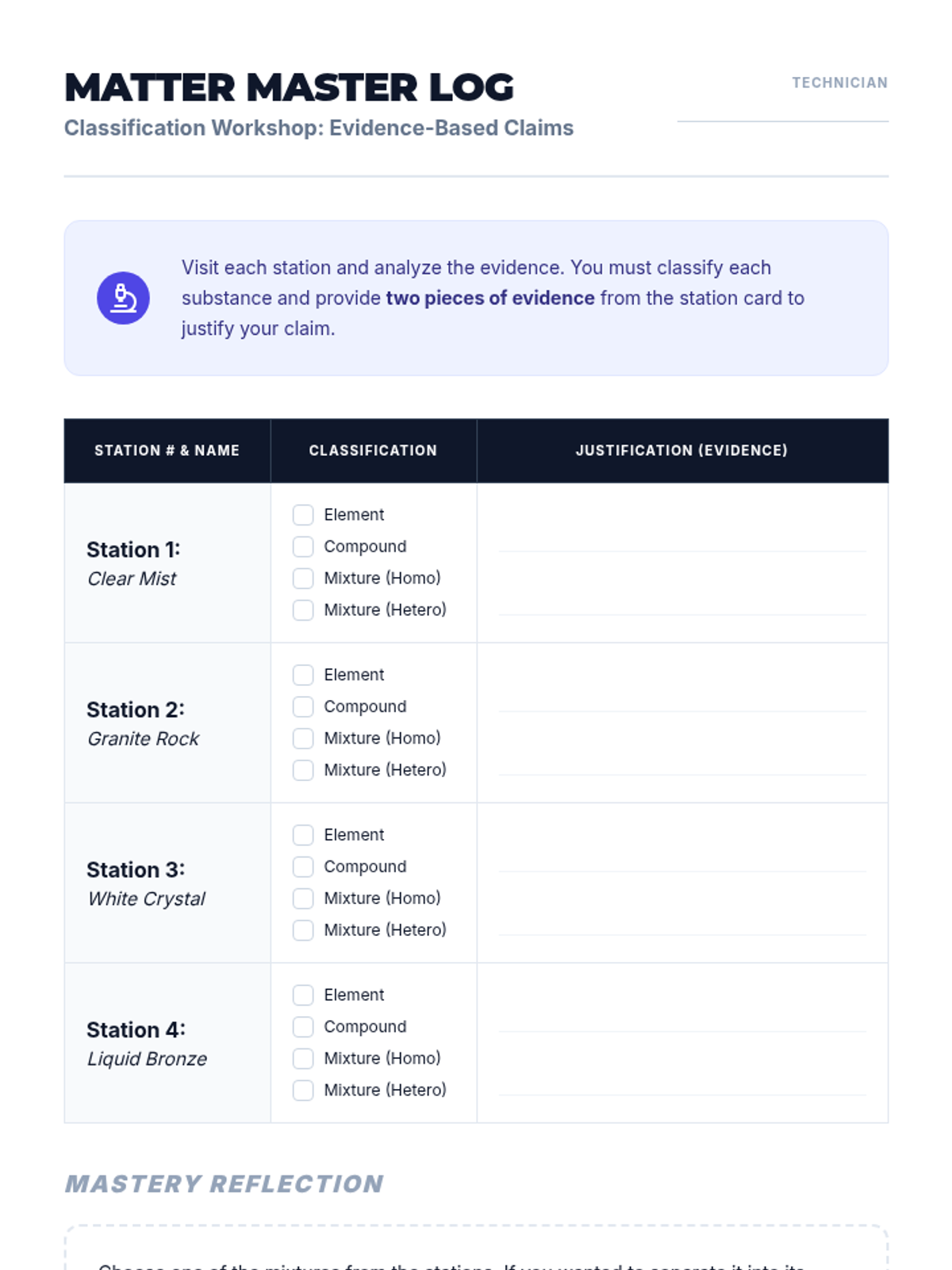 This 8th-grade sequence explores the particle-level interactions within mixtures, focusing on modeling the differences between pure substances and mixtures. Students use physical manipulatives, digital simulations, and classification workshops to master the concepts of concentration, saturation, and the microscopic structure of heterogeneous and homogeneous matter.