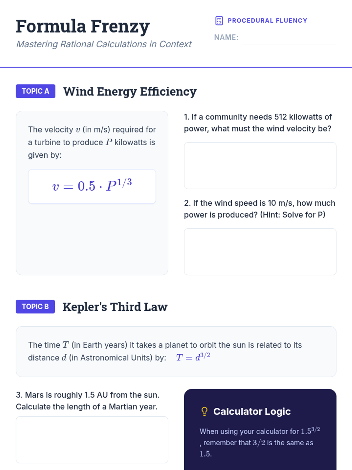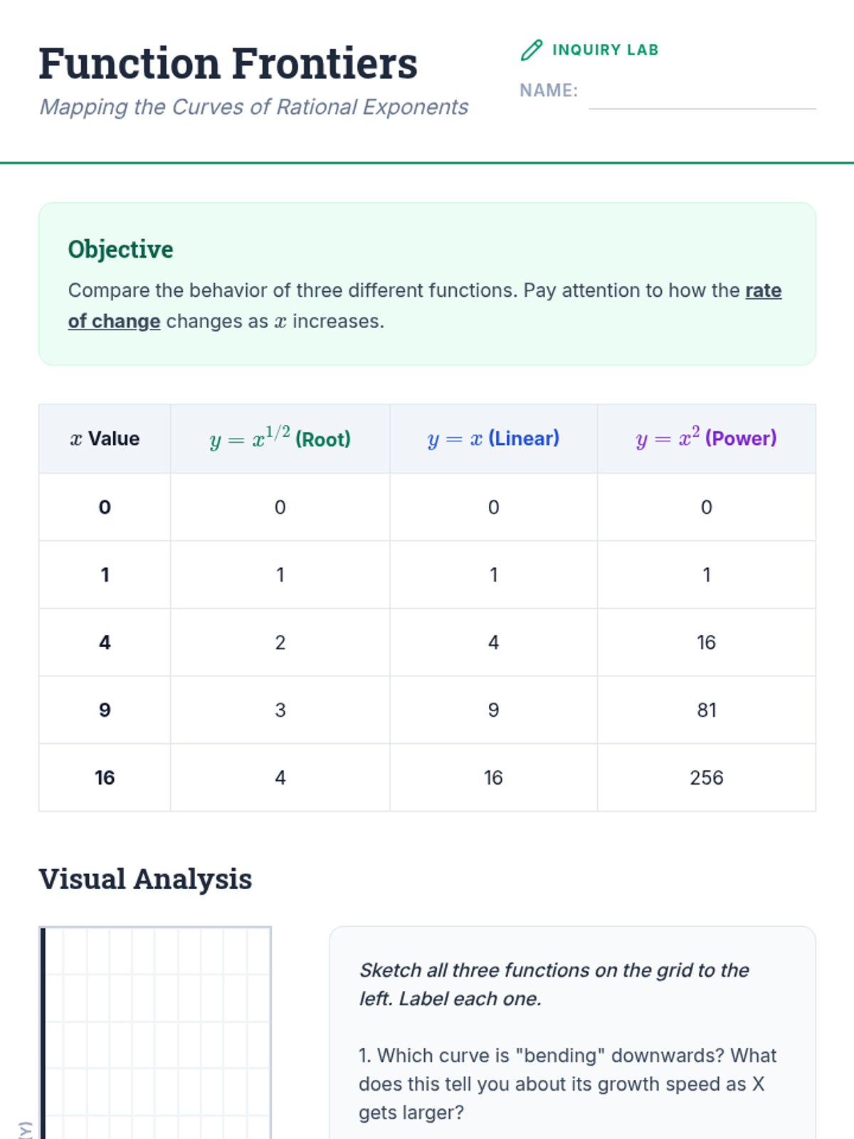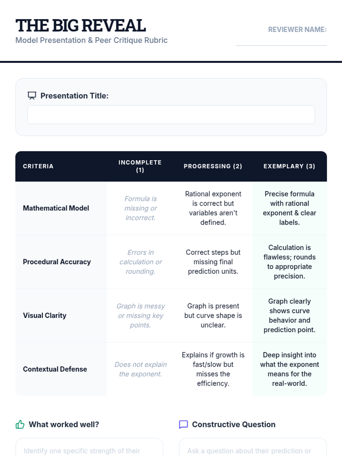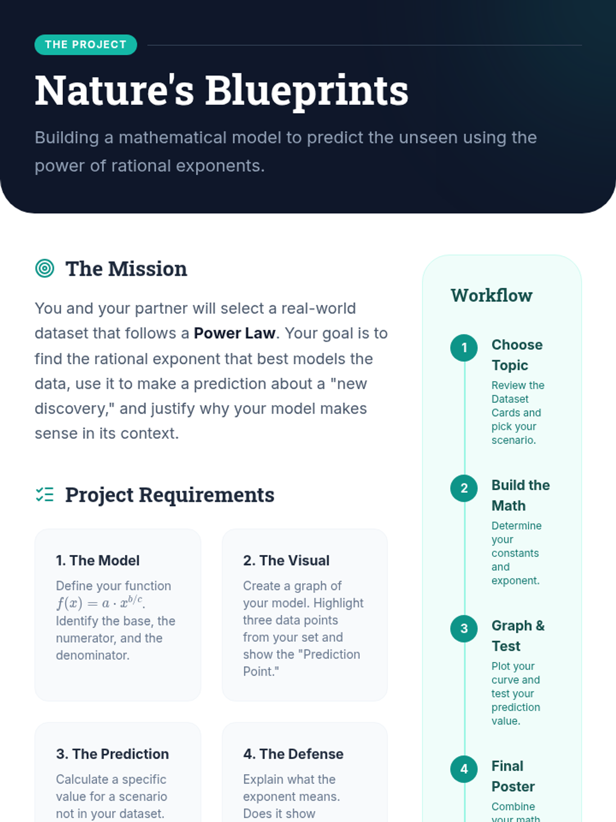 A 9th-grade algebra project-based sequence exploring rational exponents through real-world biological scaling (allometry) and physical laws. Students transition from evaluating fractional powers in Kleiber's Law to creating and presenting their own mathematical models.