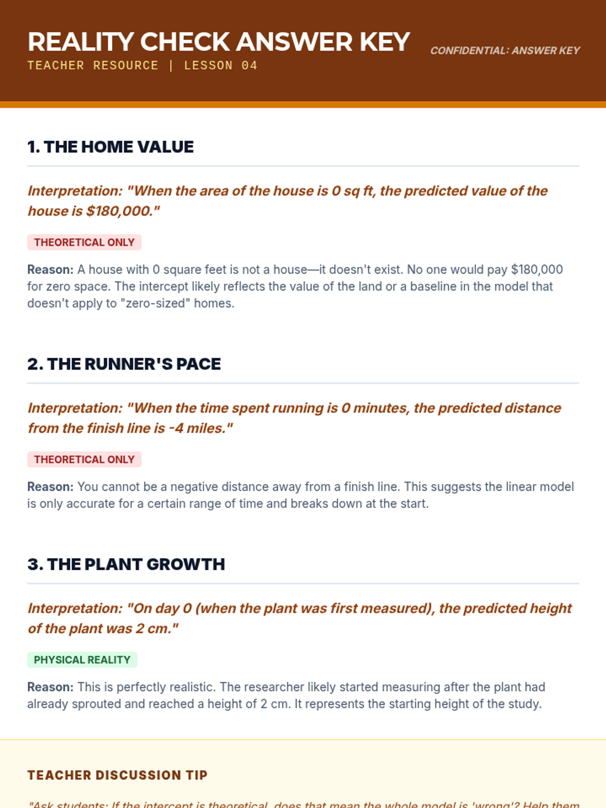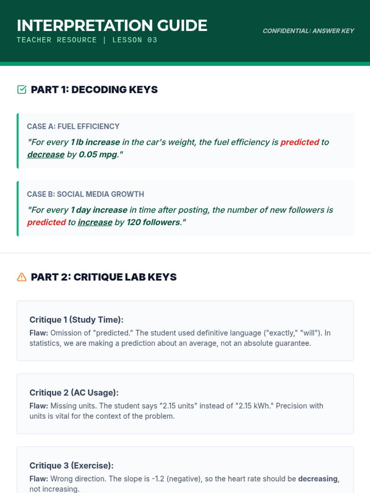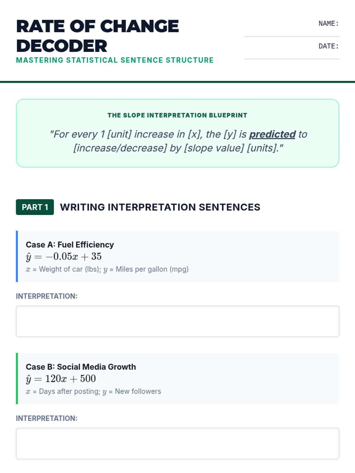 A comprehensive sequence for 11th-grade students on interpreting linear models. Students will progress from visualizing bivariate data to calculating regression lines and rigorously interpreting slope, y-intercepts, and the reliability of predictions.