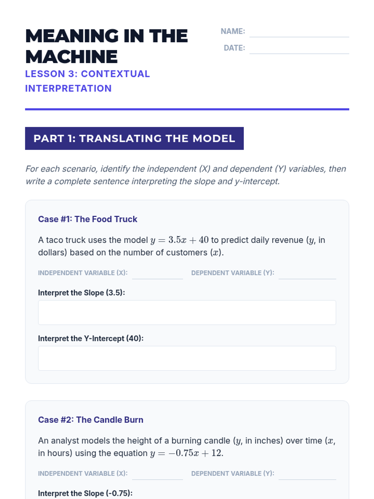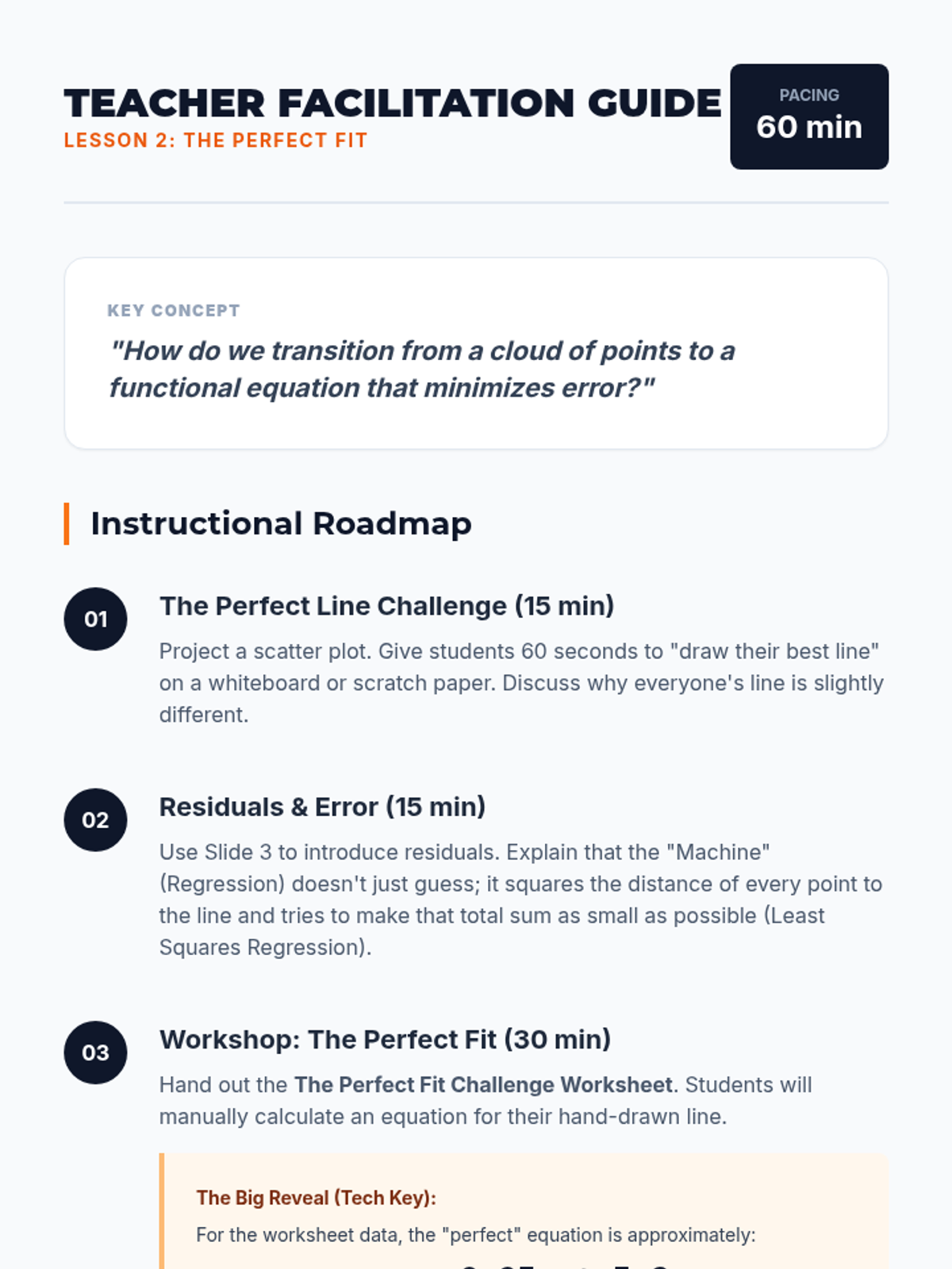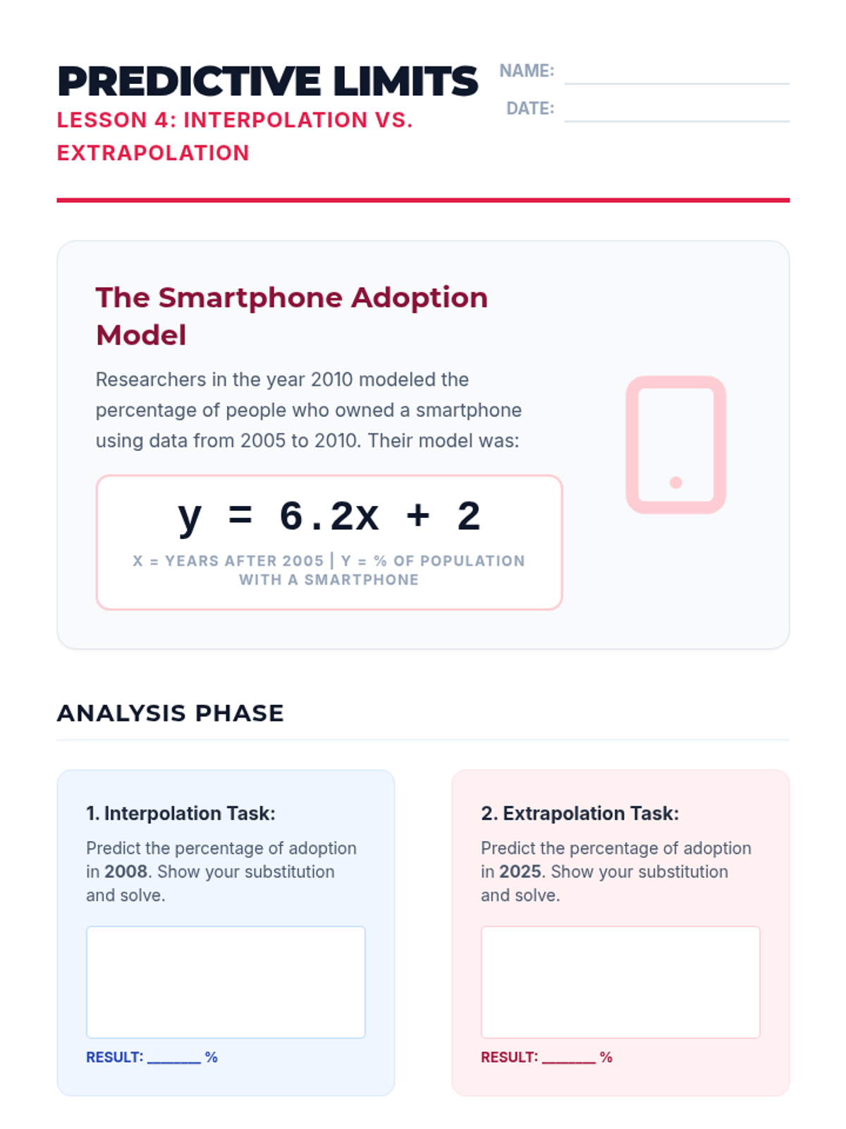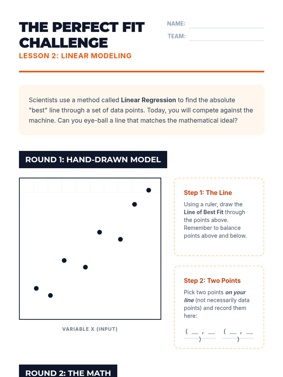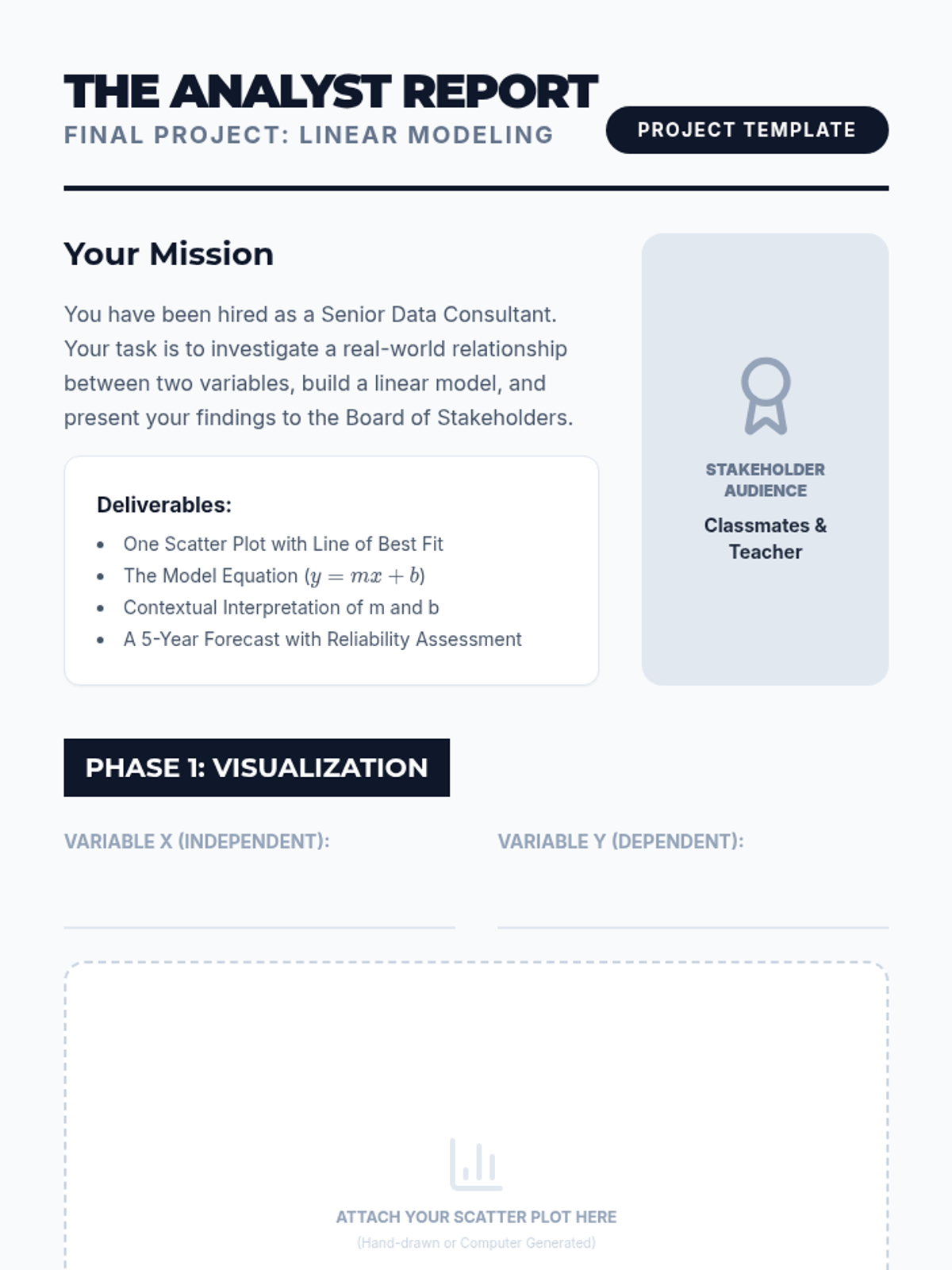 A project-based unit where 10th-grade students act as data analysts to investigate real-world relationships through linear modeling. Students collect bivariate data, construct scatter plots, calculate regression lines, and interpret slope and y-intercept within specific contexts while exploring the boundaries of predictive modeling.