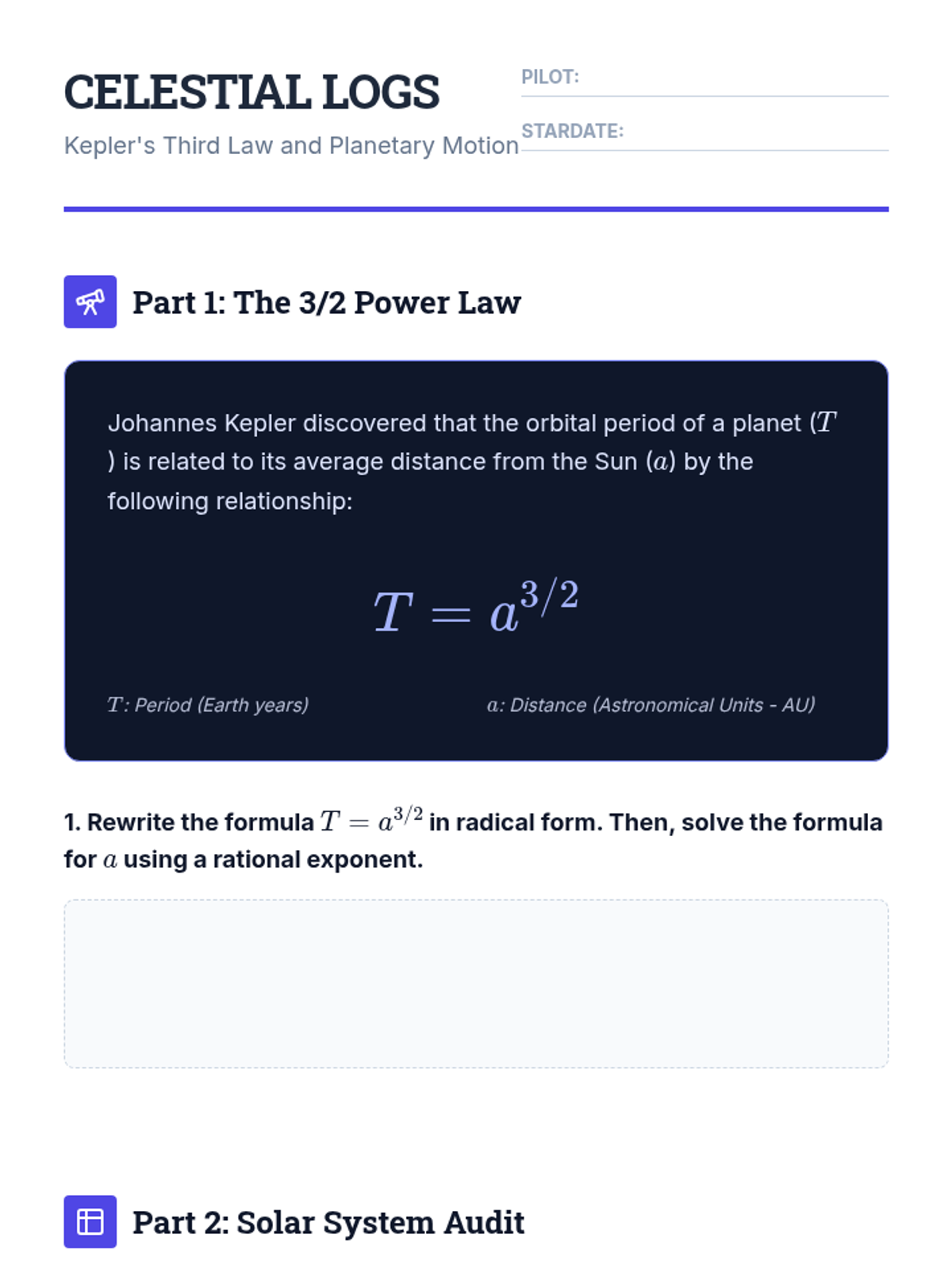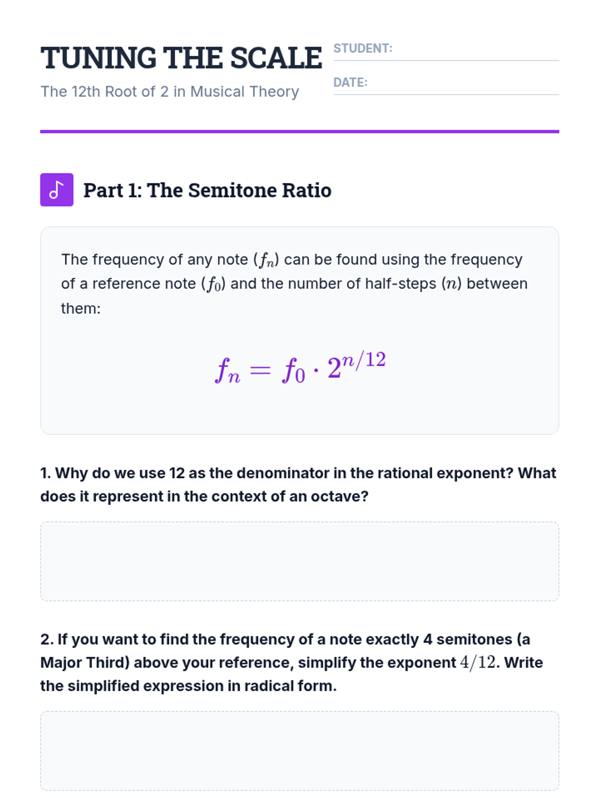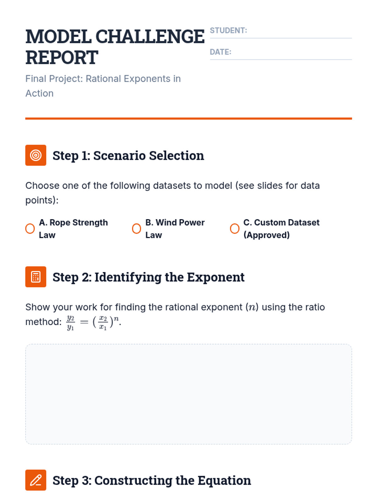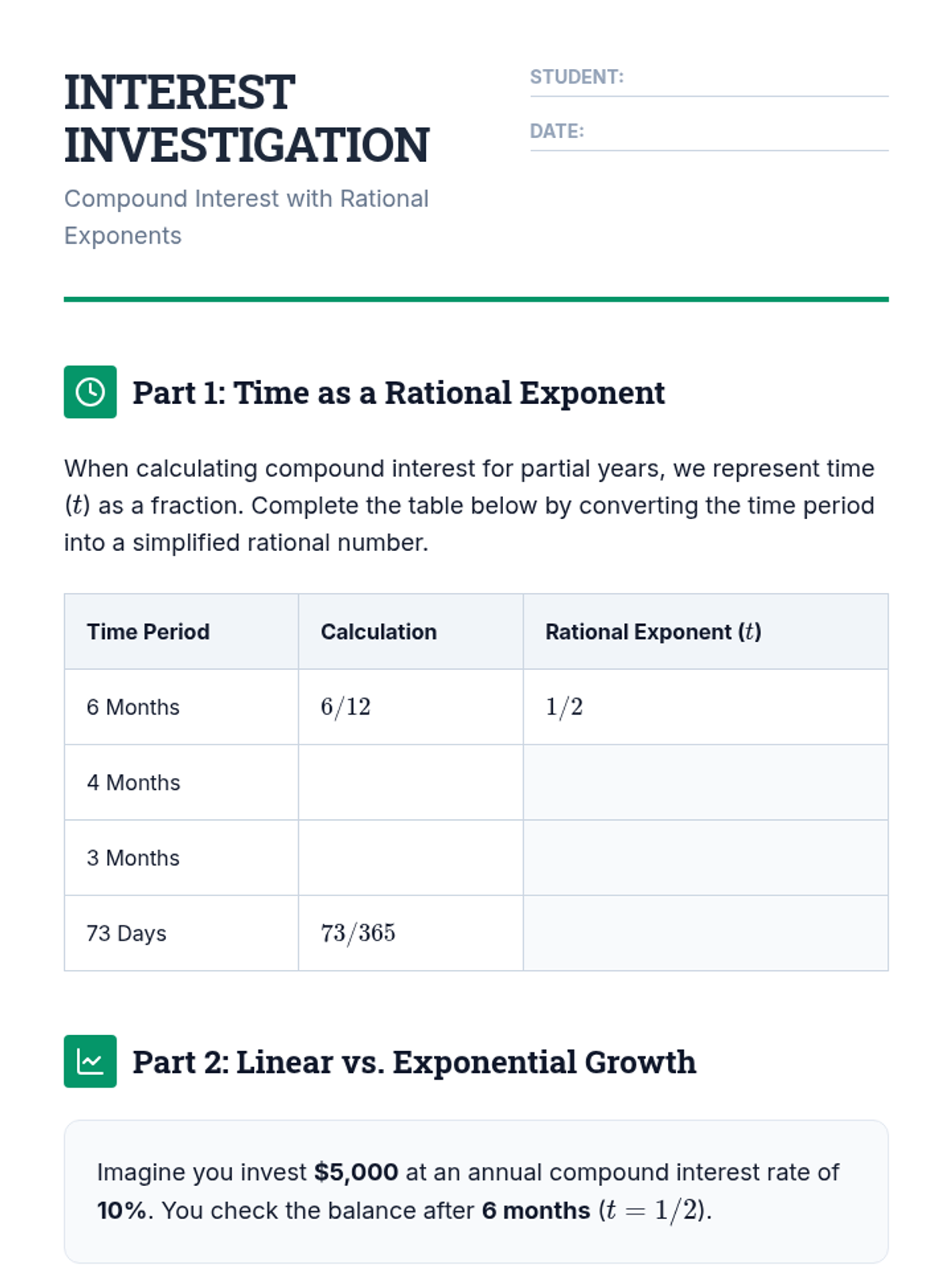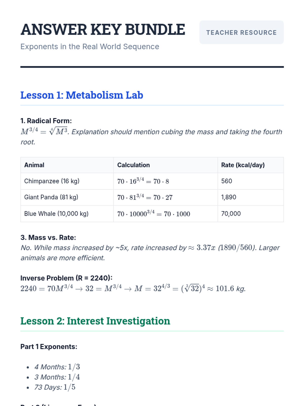 This sequence investigates real-world applications of rational exponents in biology, finance, music, and physics. Students explore how fractional powers model growth, scaling, and harmonic relationships, culminating in a data-modeling project.