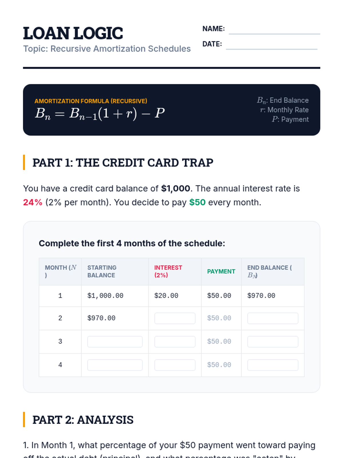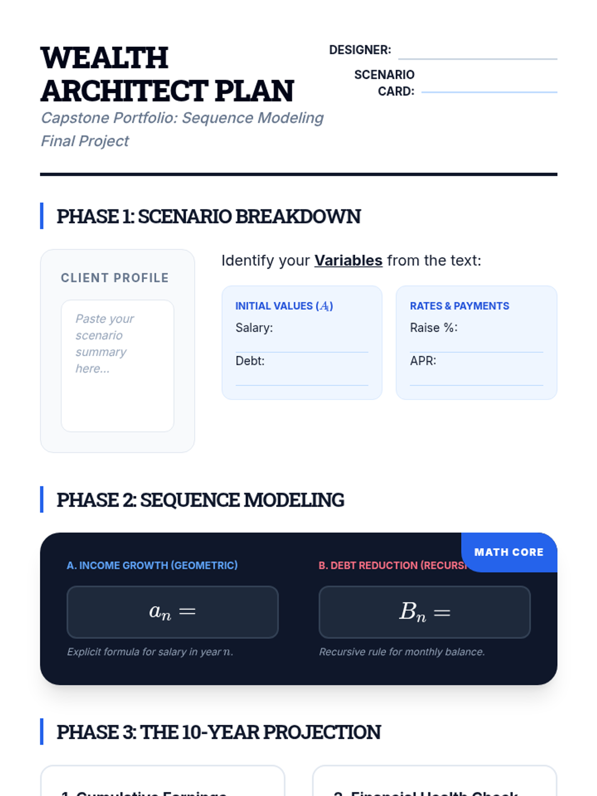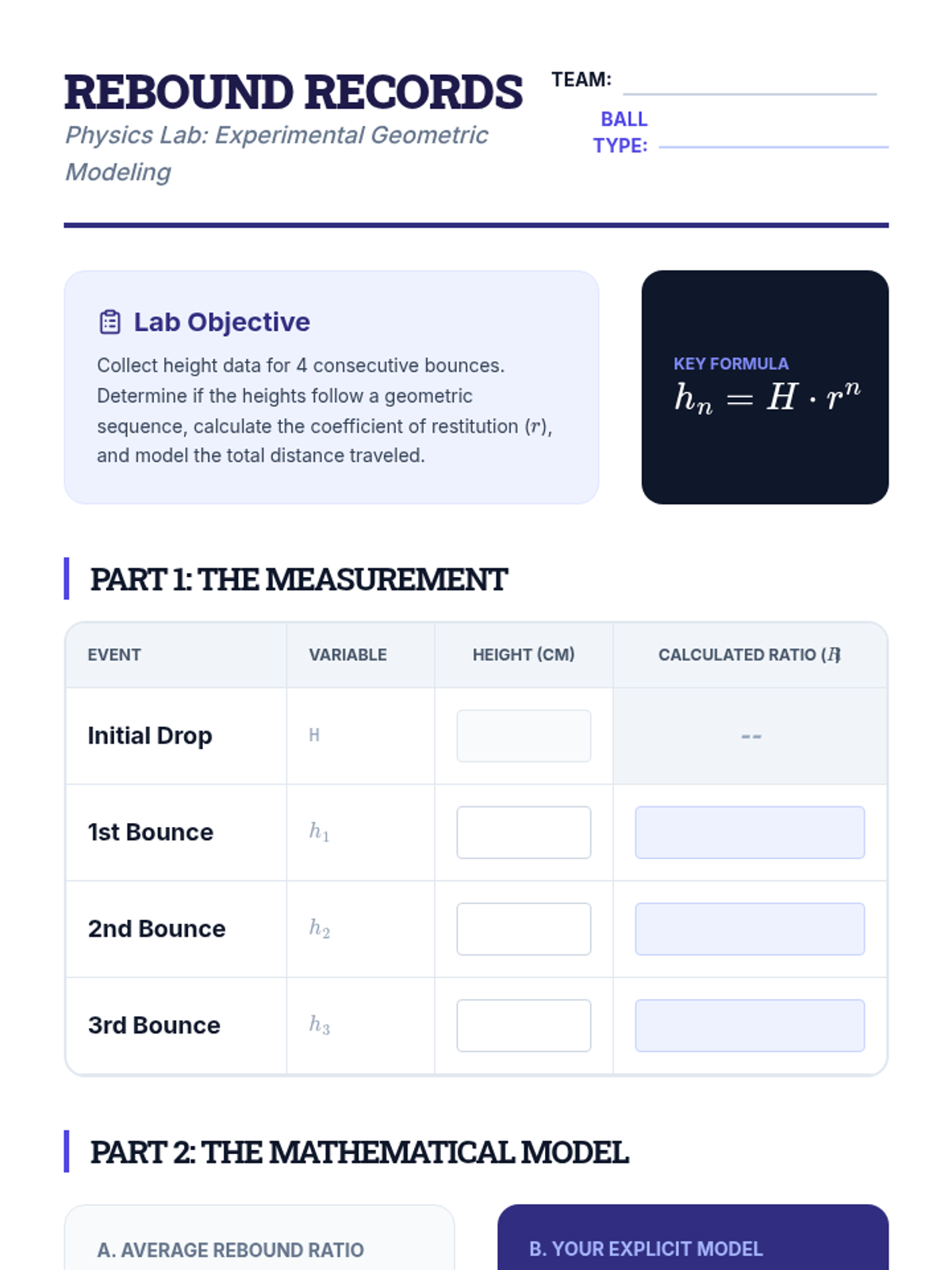 An 11th-grade mathematics sequence that bridges the gap between abstract sequences and real-world applications in finance and physics. Students explore arithmetic and geometric models through interest, depreciation, projectile rebounds, and loan amortization.