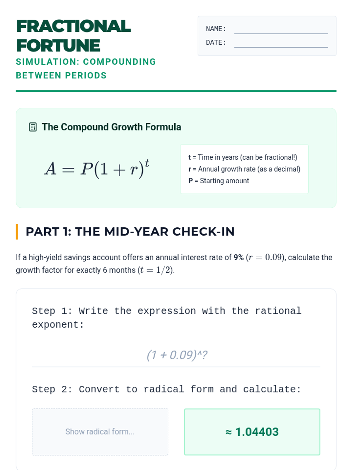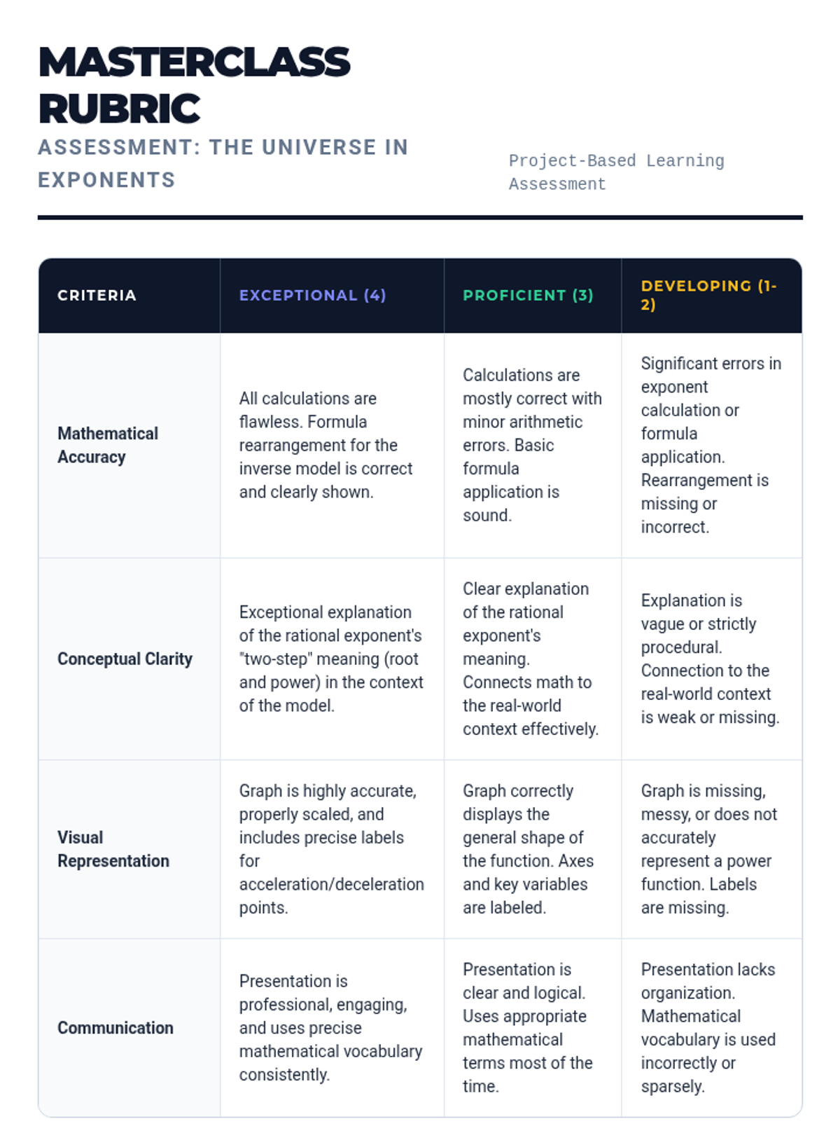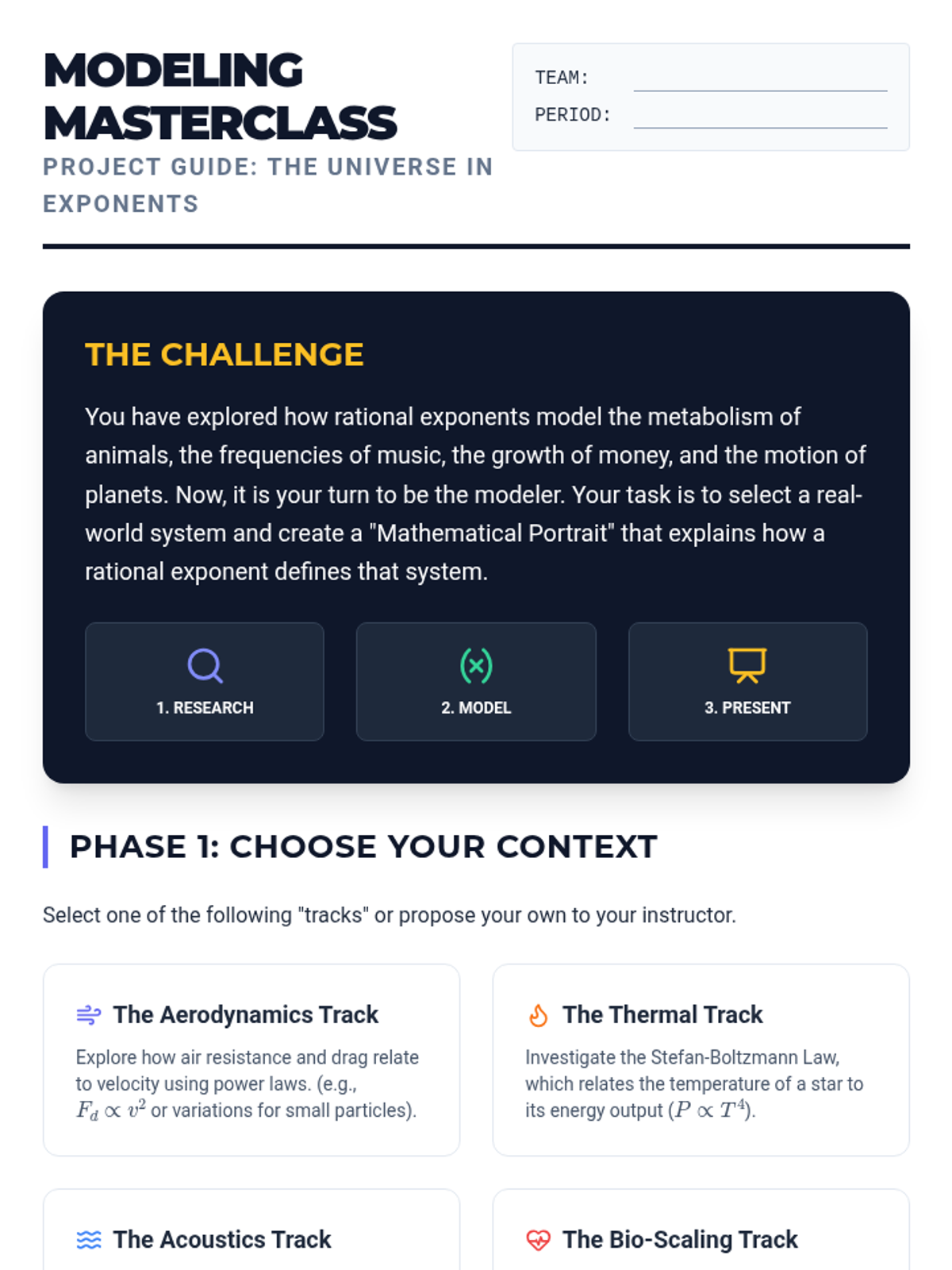 A project-based unit exploring the practical applications of rational exponents in biology, music, finance, and astronomy. Students analyze real-world models and synthesize their understanding through a final modeling project.