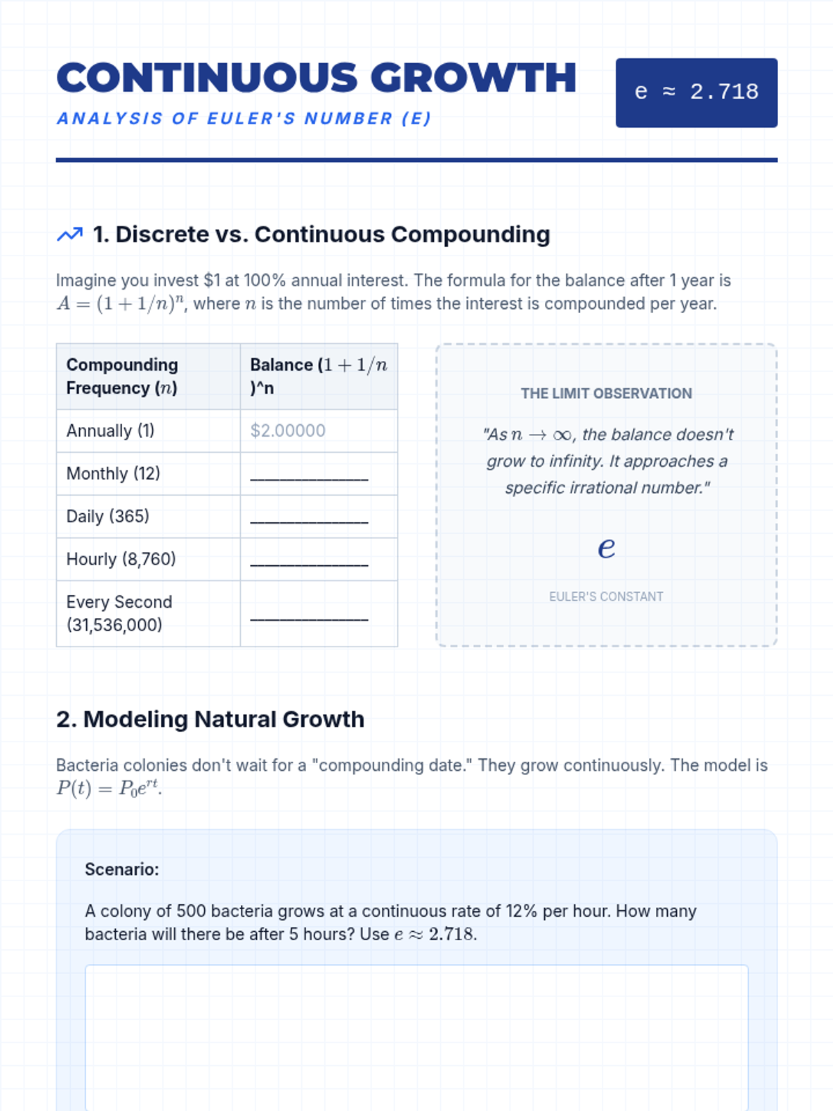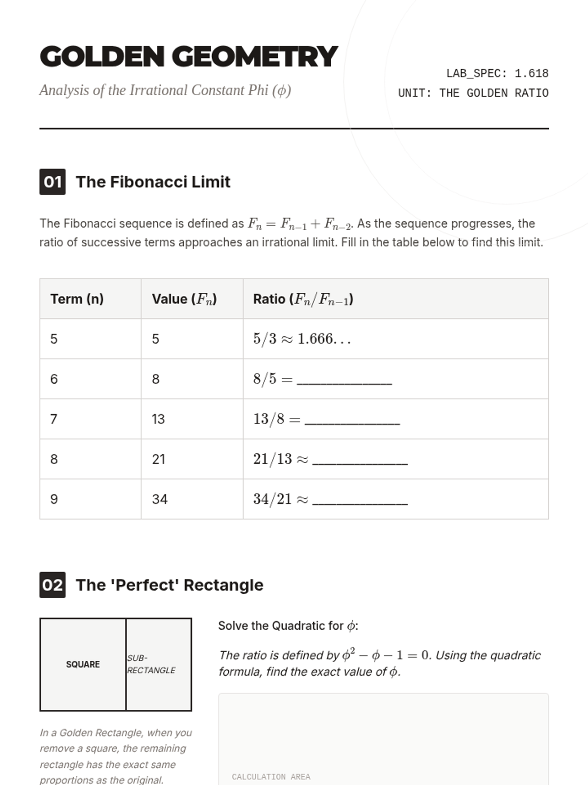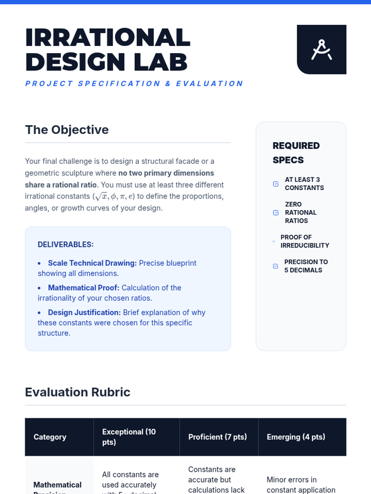 A project-based sequence for 12th-grade students exploring the spatial and structural applications of irrational constants like the Square Roots, Phi, Pi, and Euler's Number. Students connect geometric construction, probability, and continuous growth models to real-world design and natural phenomena.