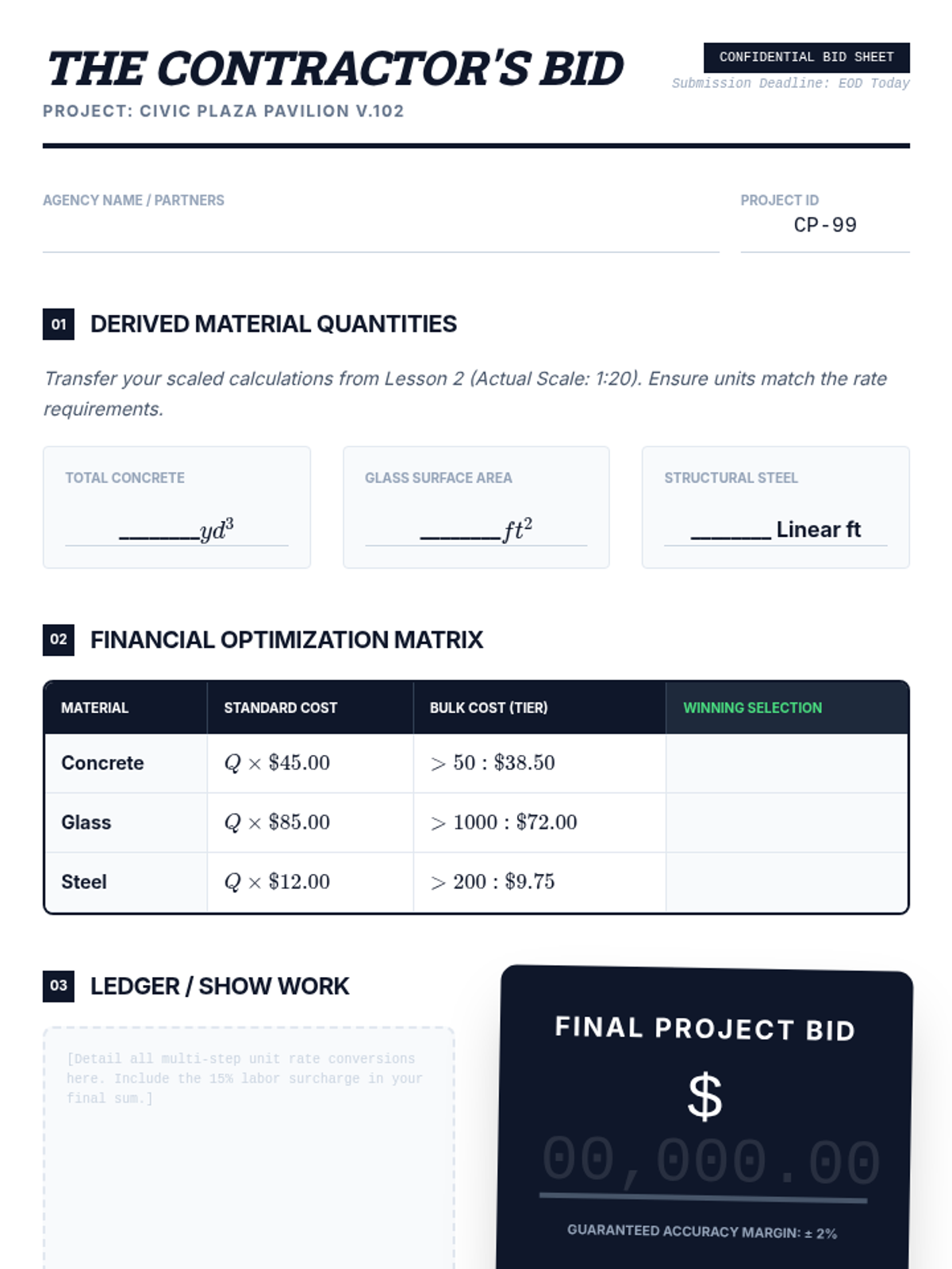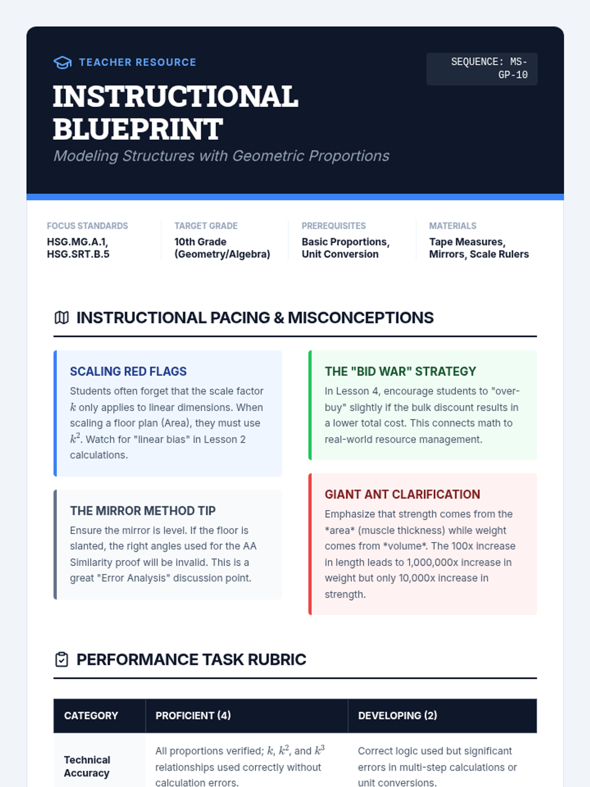 This sequence bridges algebra and geometry by applying proportional reasoning to architectural design and structural analysis. Students master scale factors, the square-cube law, indirect measurement, and unit rate optimization through a series of engineering-themed challenges.