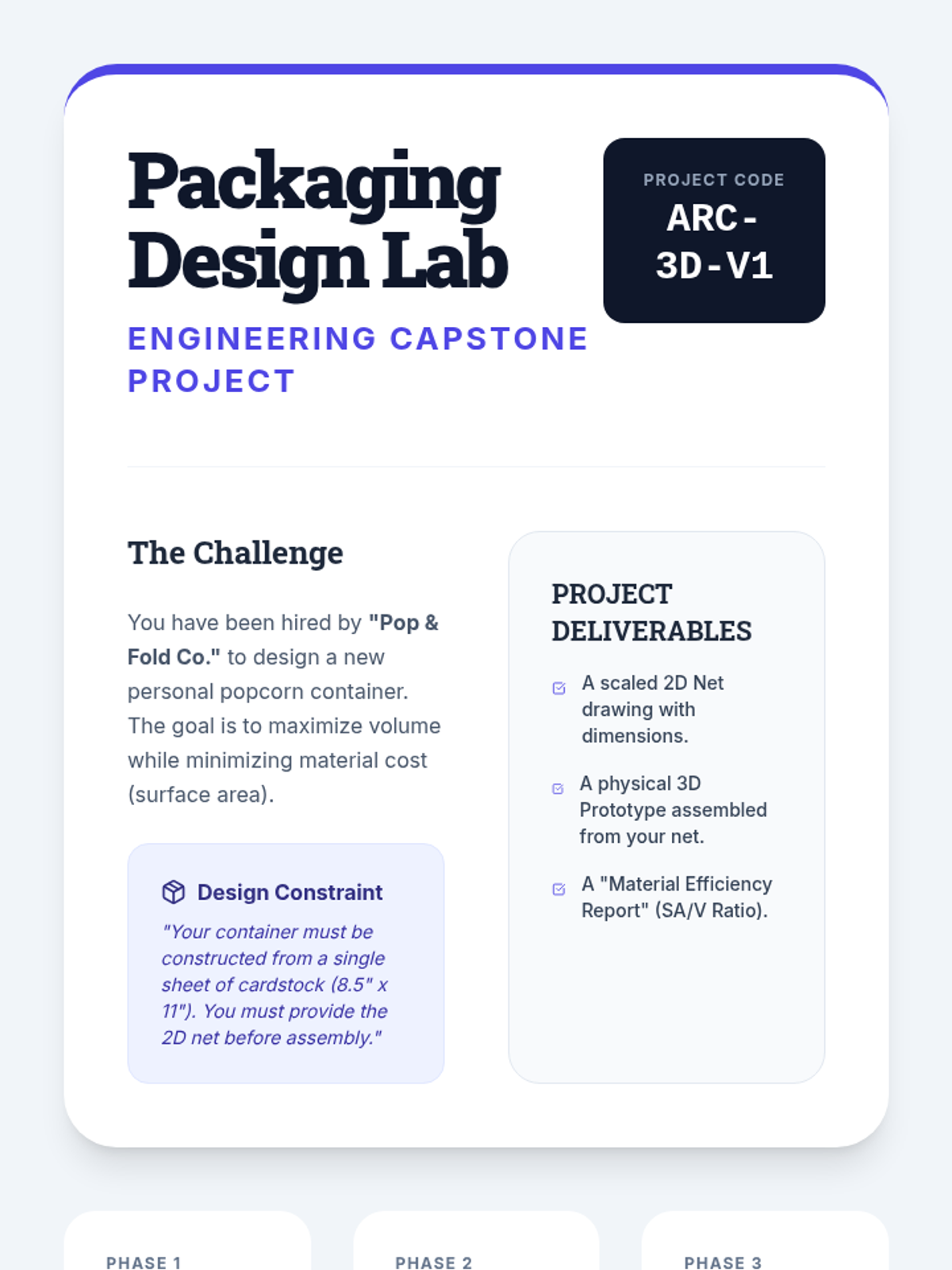 A 10th-grade physics and geometry sequence exploring the transition from 2D planar representations to 3D solids, focusing on polyhedra, curved surfaces, and engineering design through Euler's Formula and net construction.
