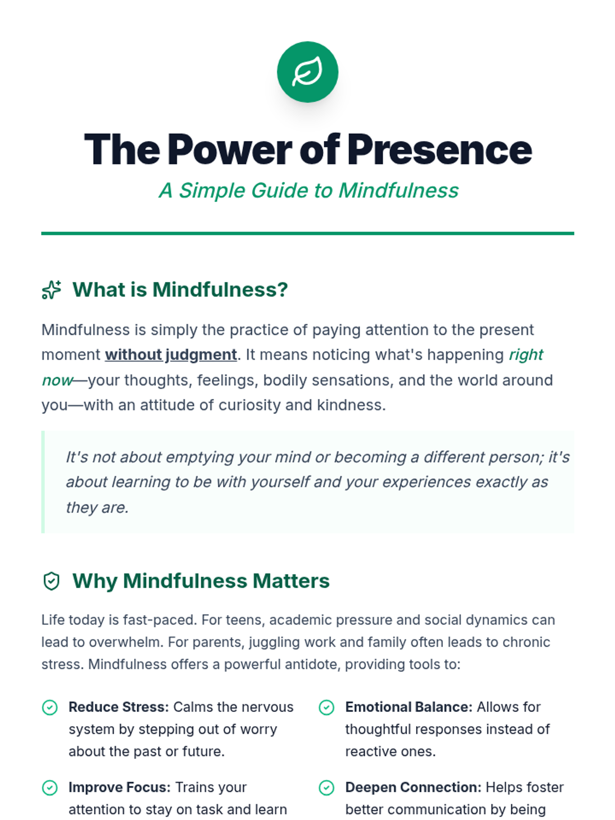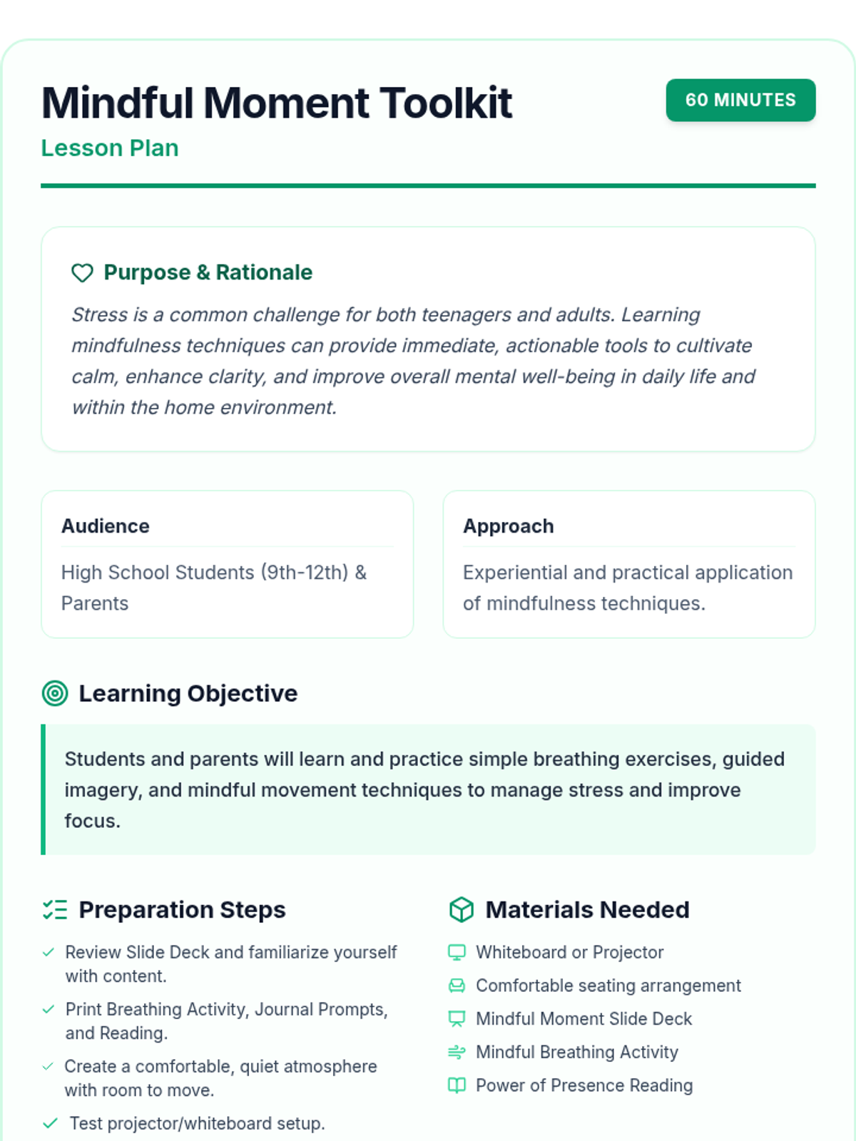 A comprehensive sequence covering digital citizenship and emotional well-being. It includes lessons on managing a digital footprint for middle school students and mindfulness techniques for stress reduction for high schoolers and parents.
