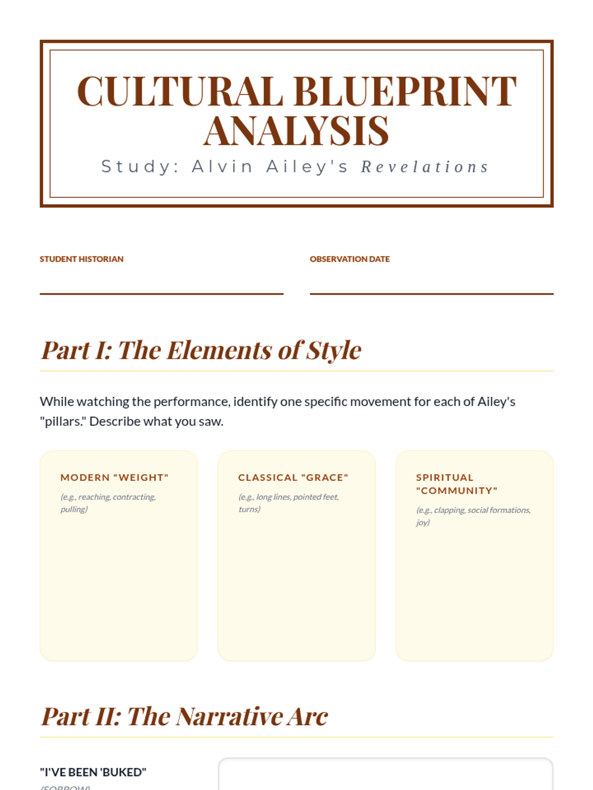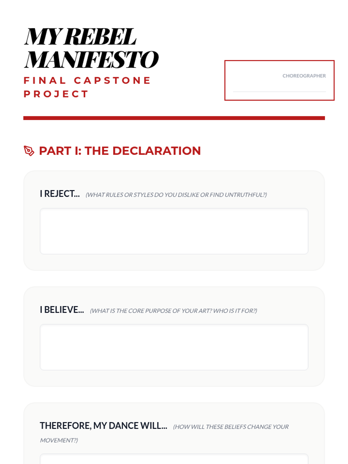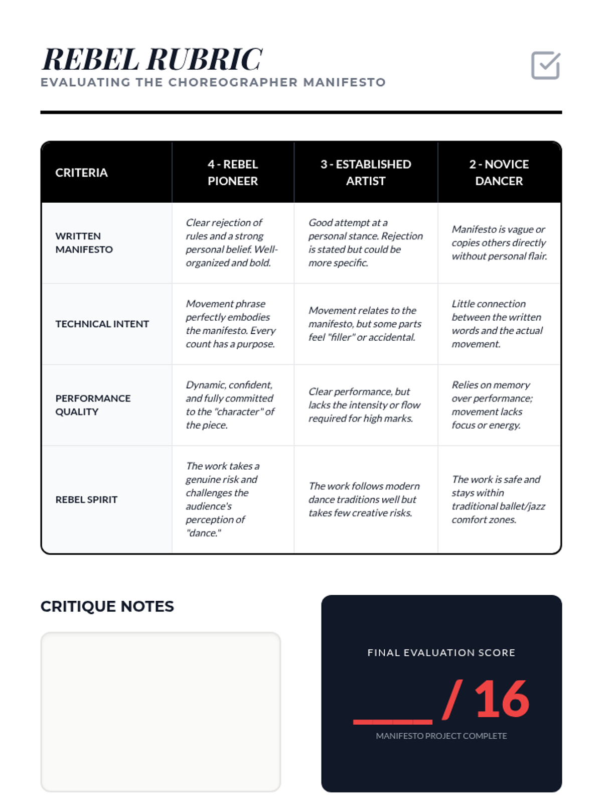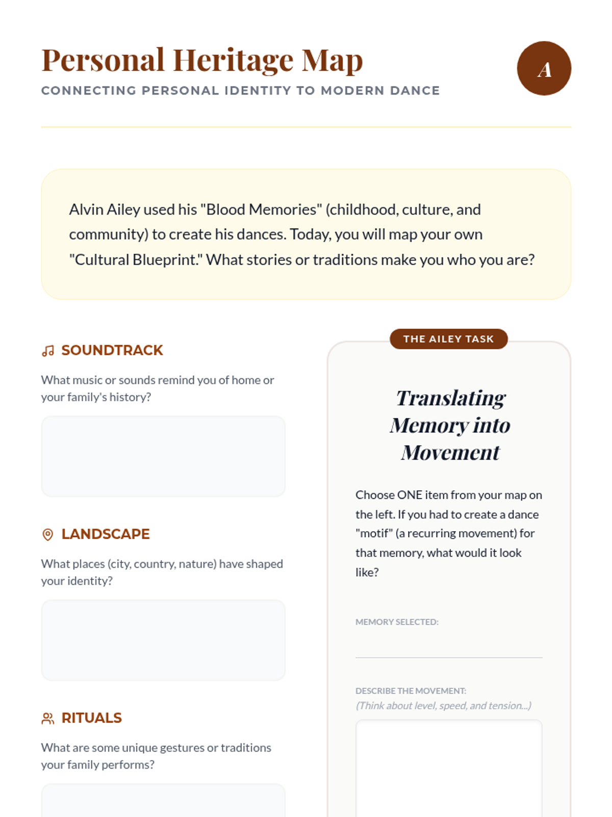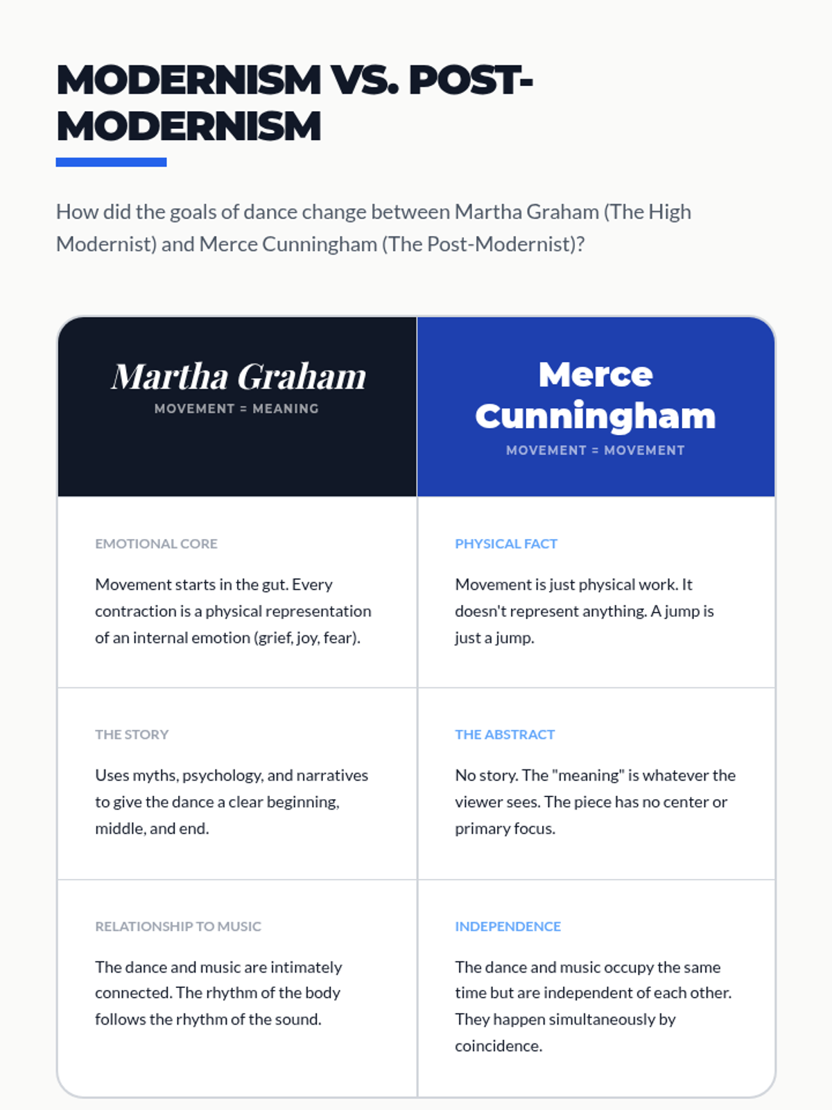 A journey through the history of modern dance, exploring how pioneers like Isadora Duncan, Martha Graham, Alvin Ailey, and Merce Cunningham broke traditional rules to express raw emotion, cultural identity, and abstract concepts. Students investigate the 'why' behind artistic rebellion and create their own choreographic manifesto.