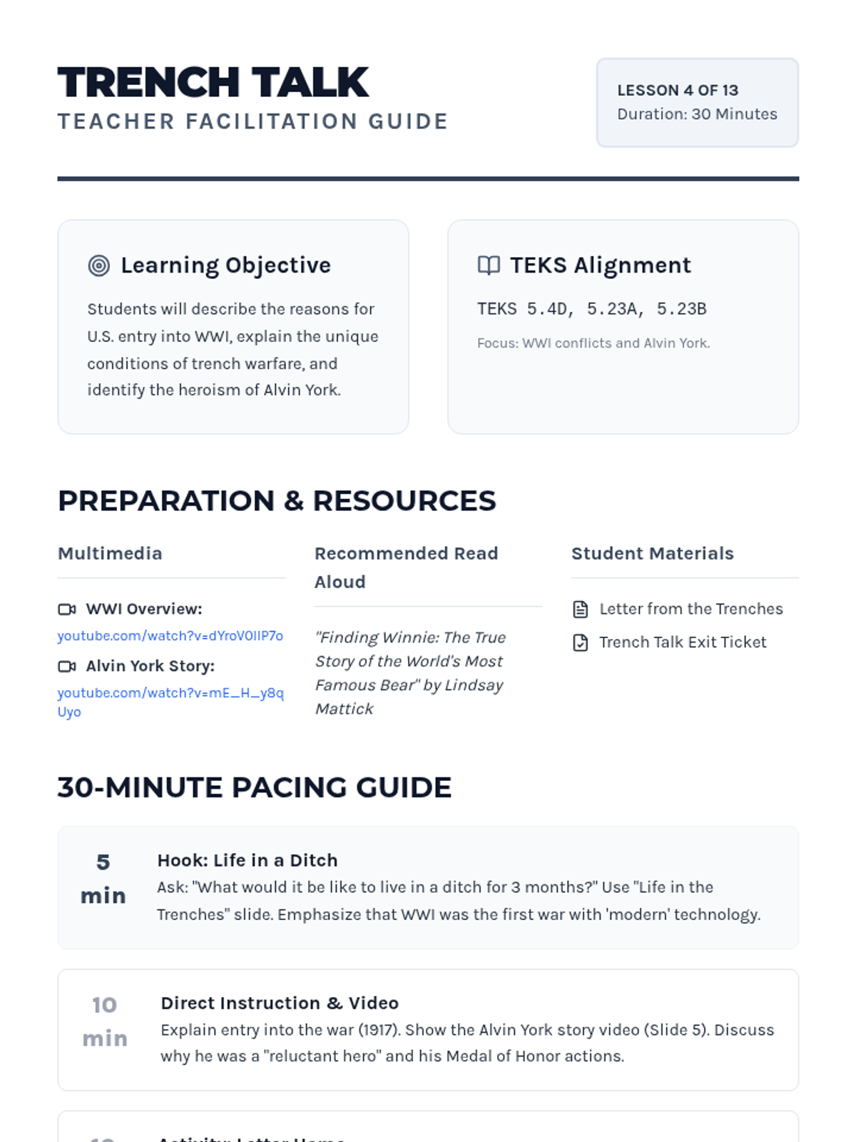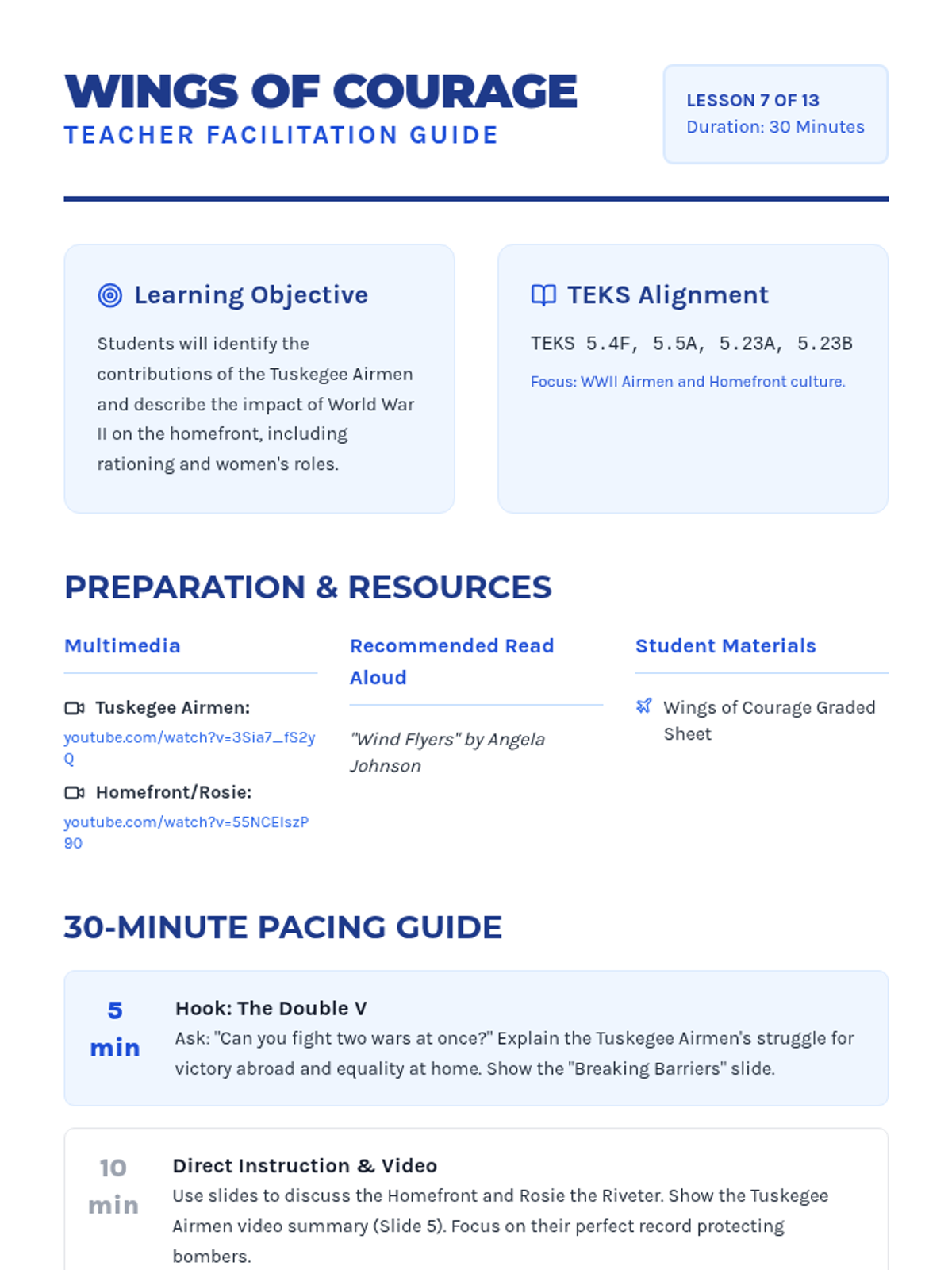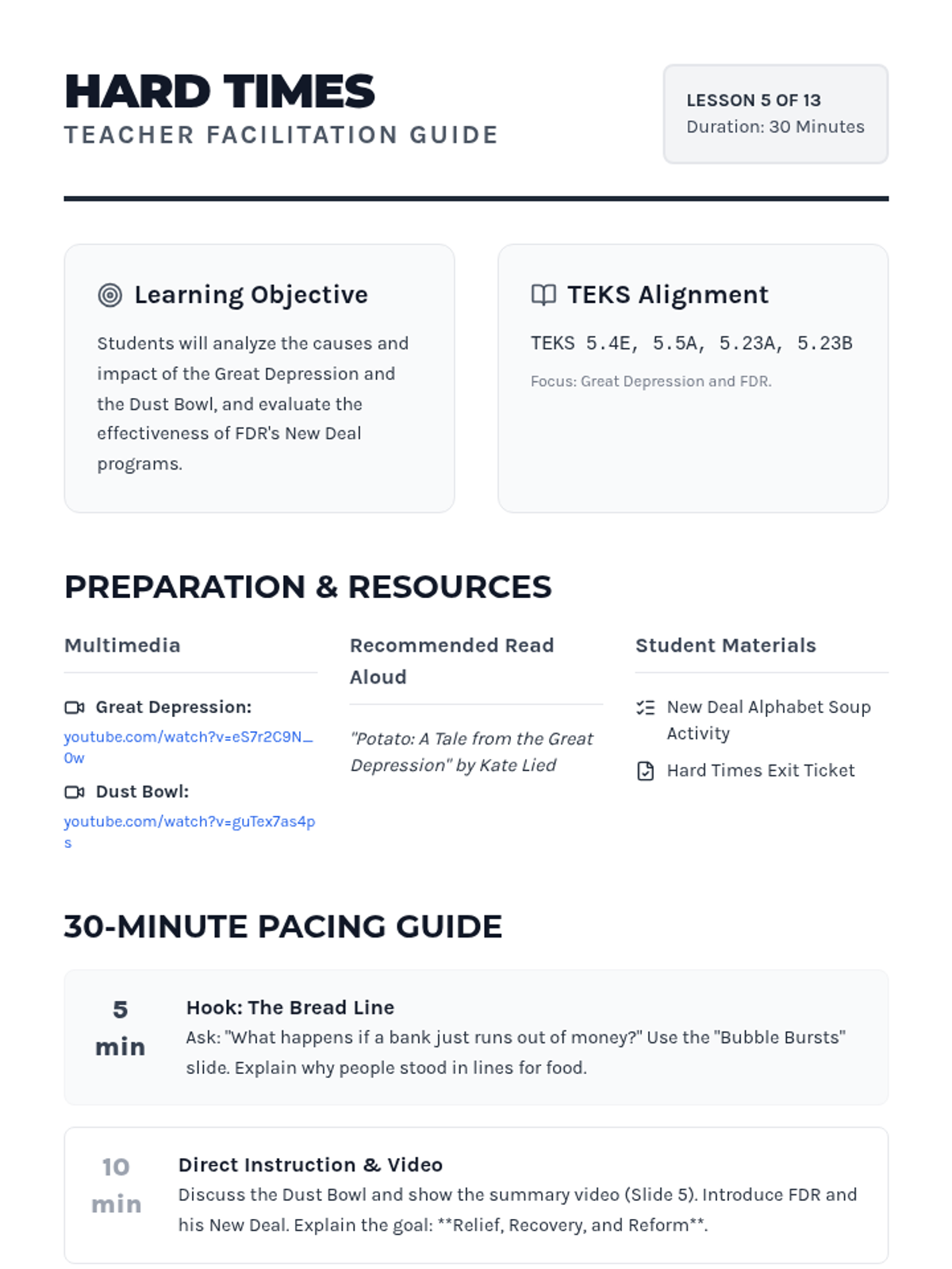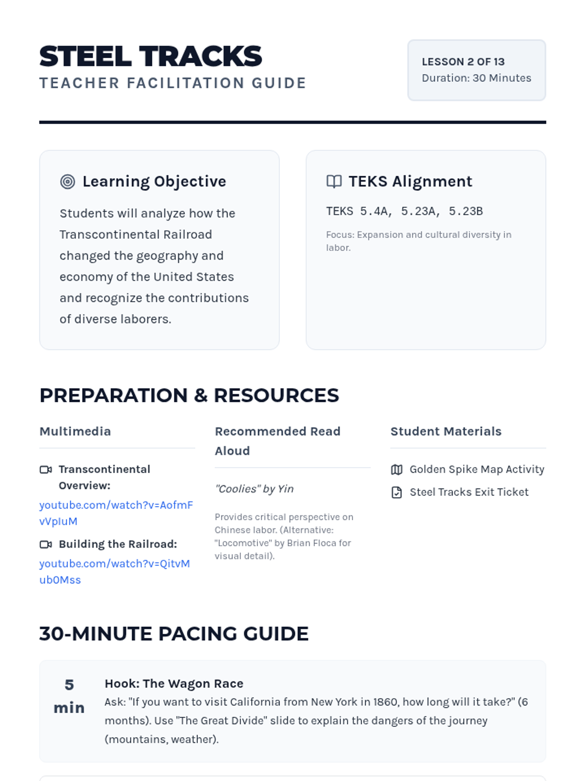 A 13-day journey through modern American history, from the Industrial Revolution to the present day, focusing on key historical figures and major conflicts as outlined in the 5th Grade TEKS. Each lesson is designed for a quick 30-minute block, integrating multimedia and primary source analysis.