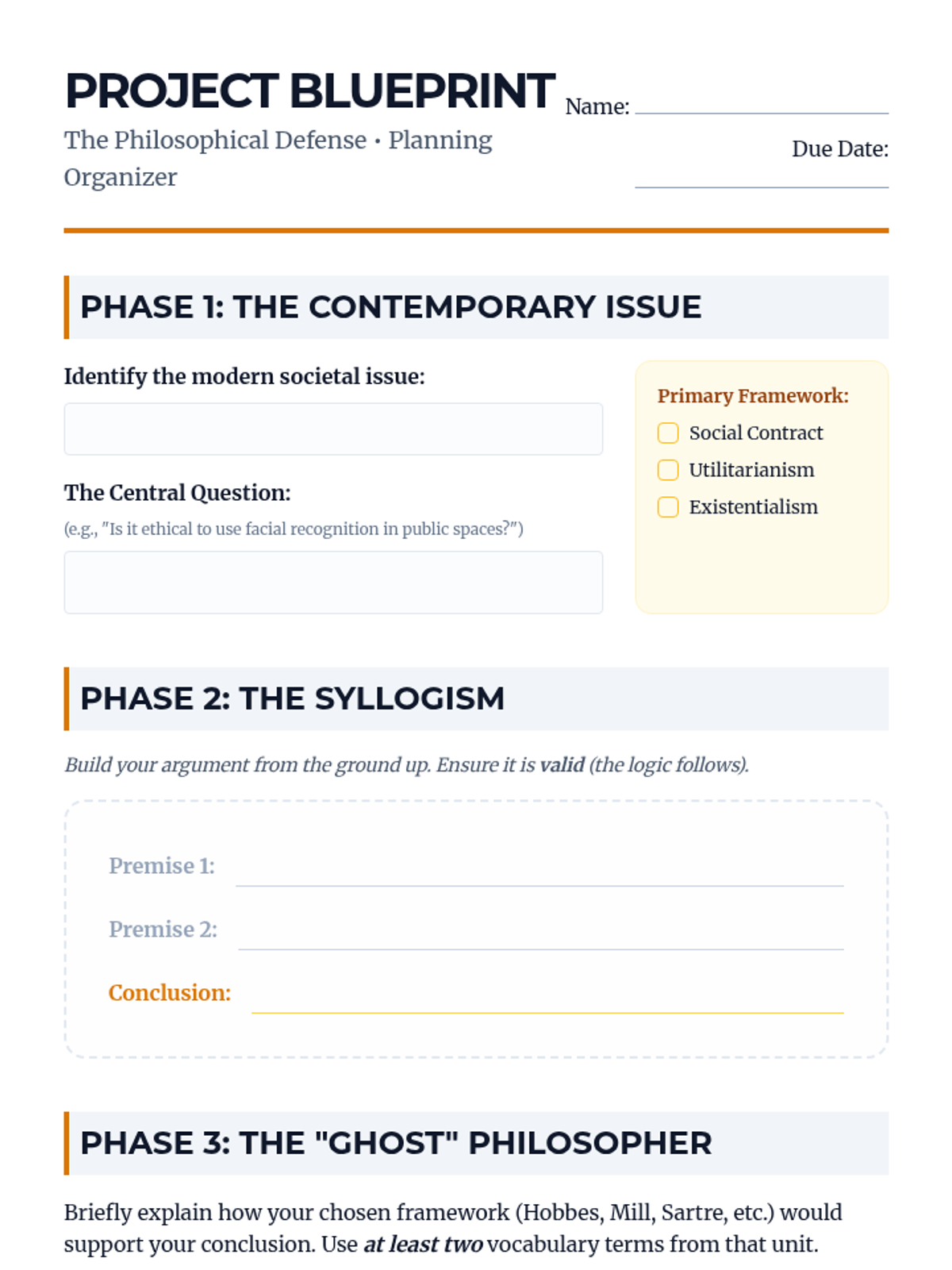 A high school philosophy sequence exploring modern political theory, ethical frameworks like Utilitarianism, the existentialist search for meaning, and the practical application of logic in contemporary society. Students move from theoretical statecraft to personal responsibility and logical rigor.