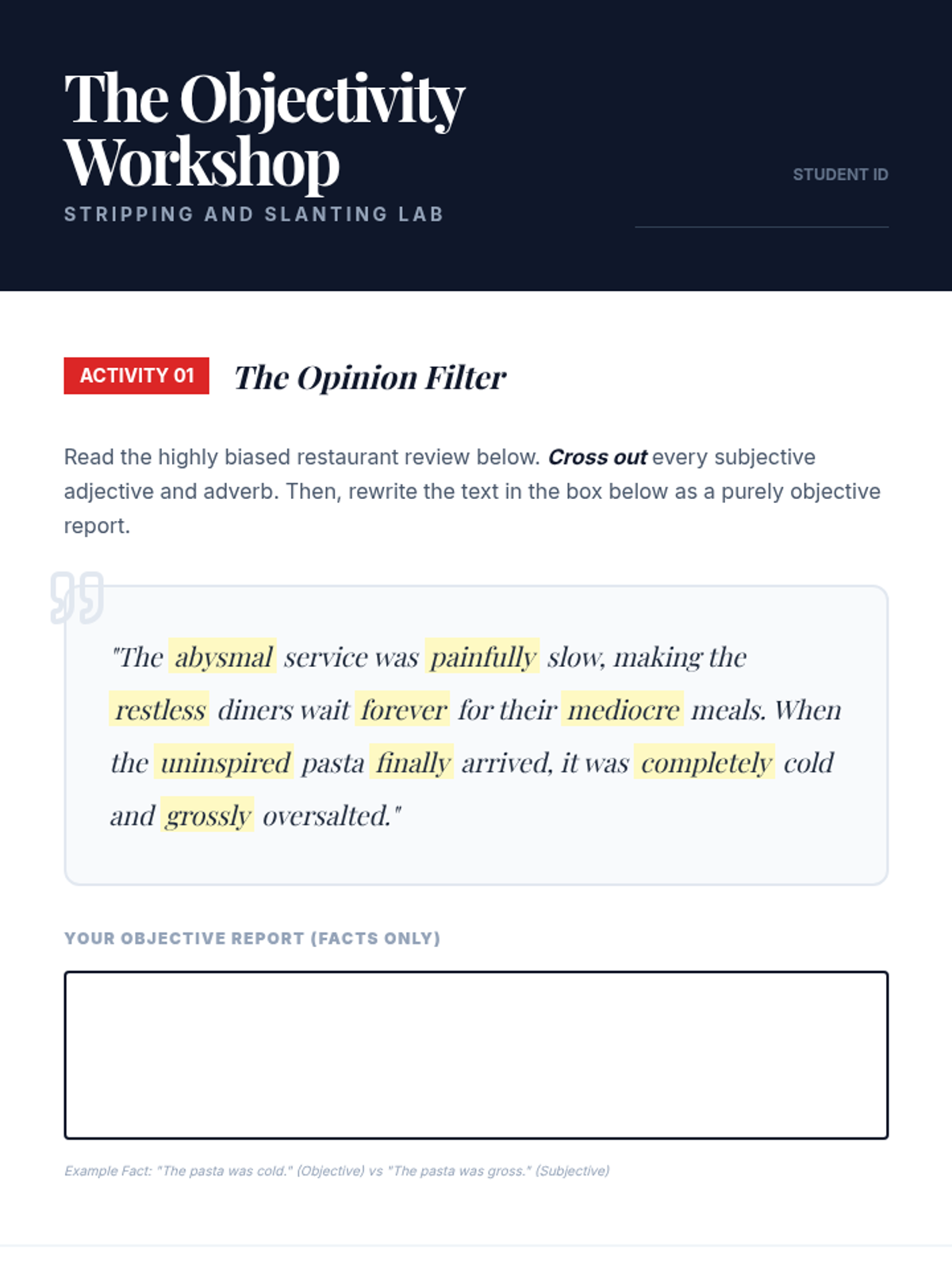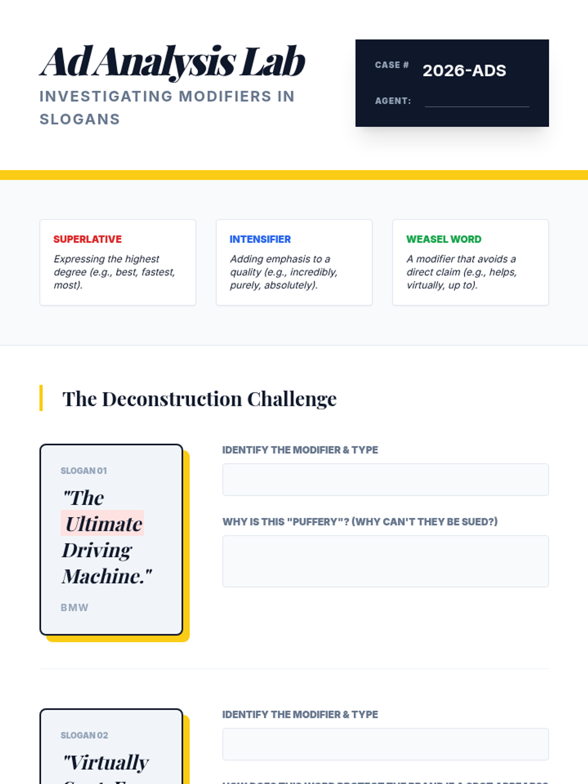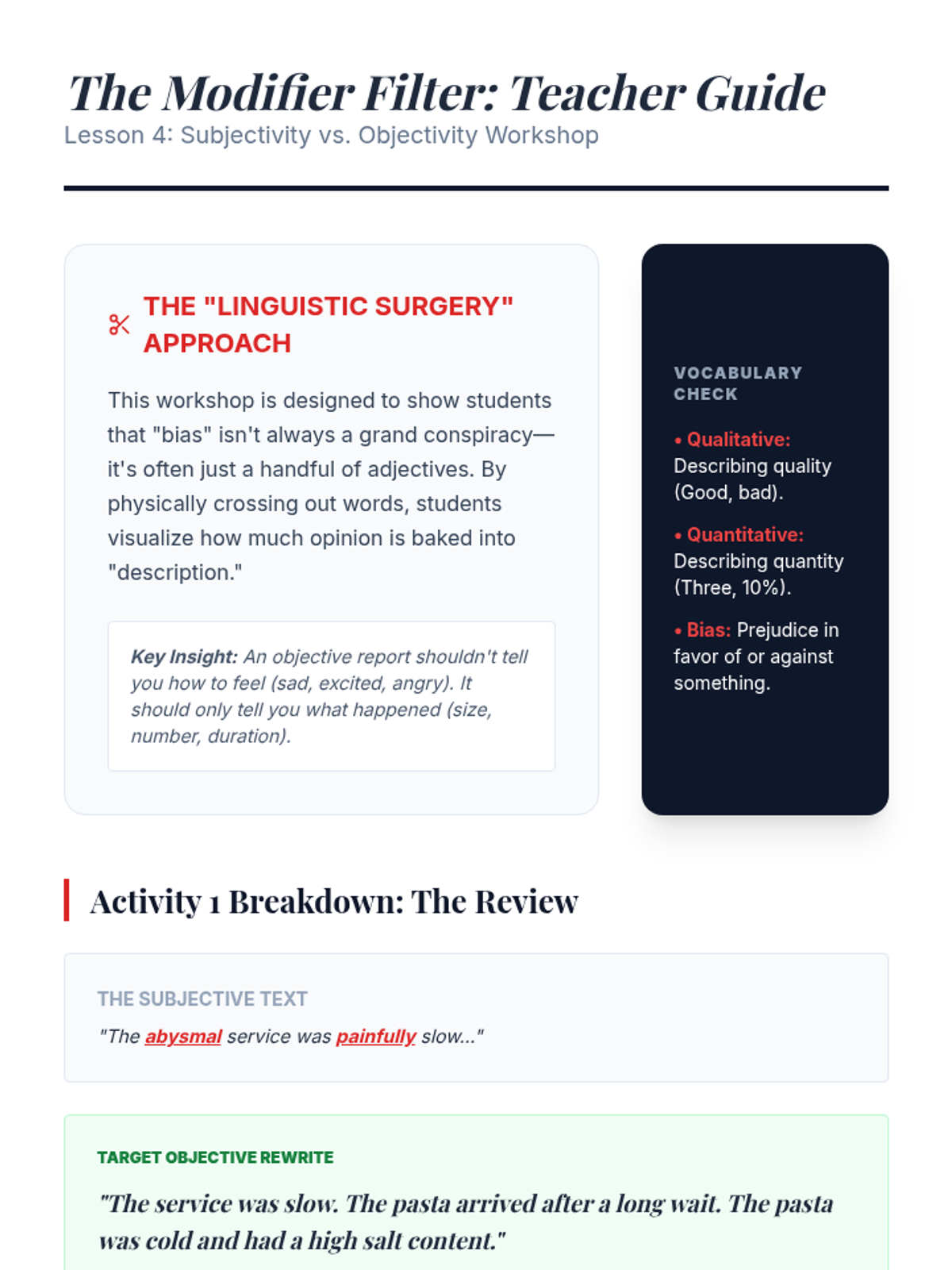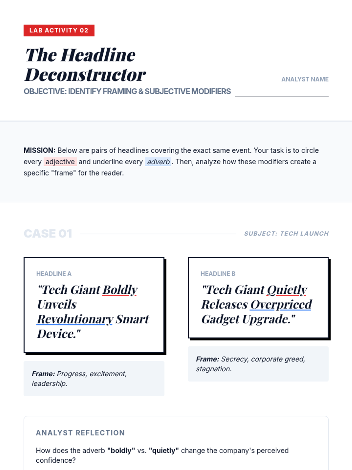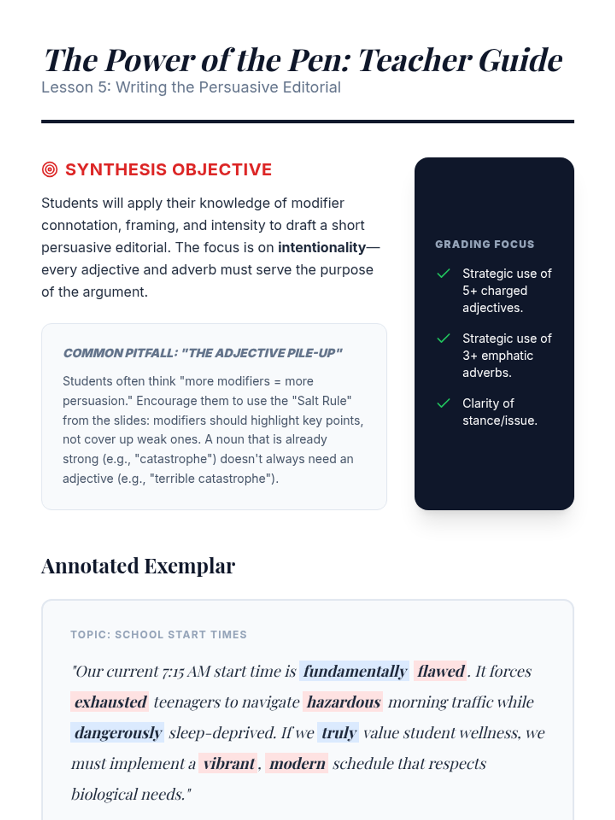 A 9th-grade grammar and rhetoric unit focused on how adjectives and adverbs influence bias, connotation, and persuasion in media and non-fiction. Students move from understanding word nuance to analyzing news and advertising, culminating in writing a persuasive editorial.
