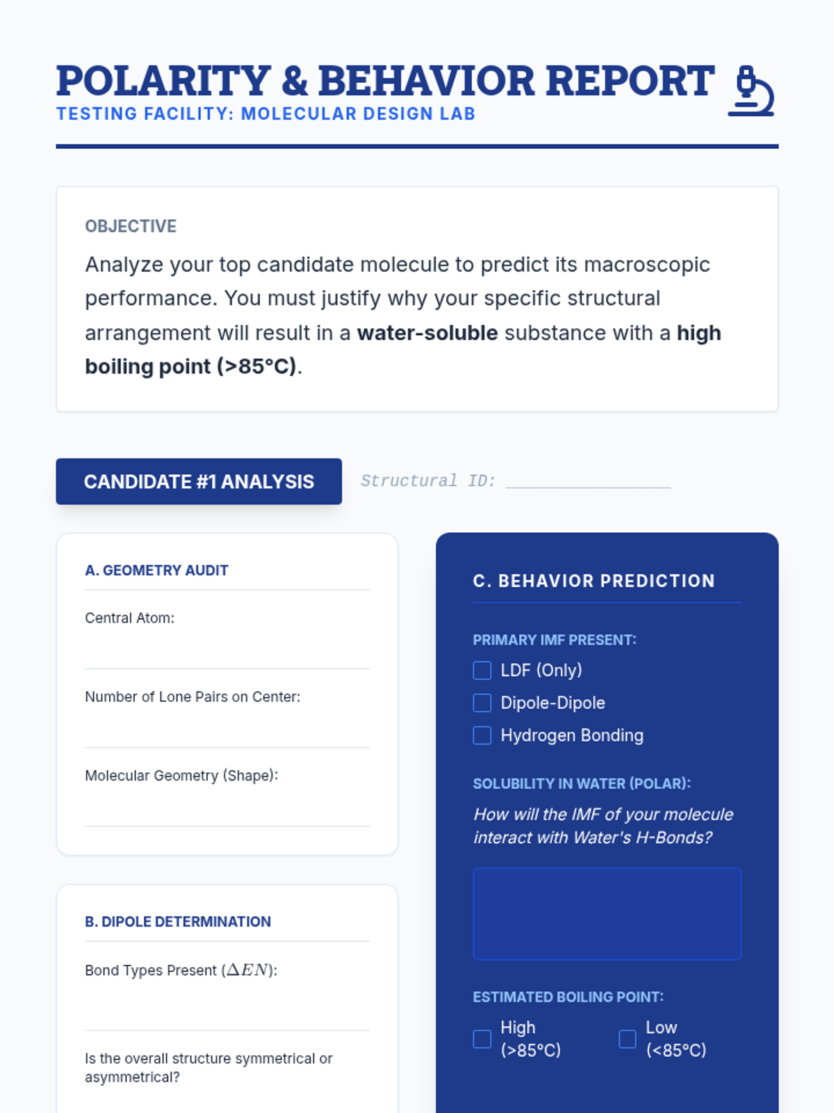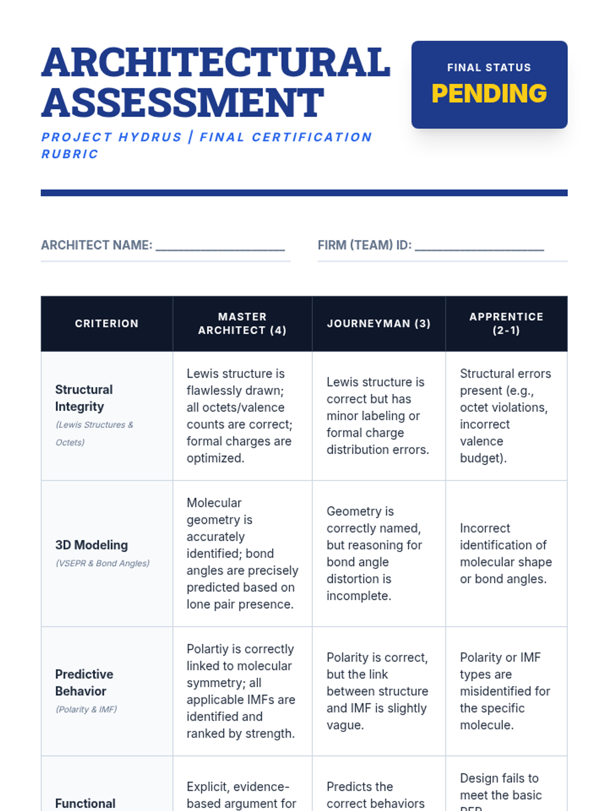 A project-based chemistry sequence where 11th-grade students act as molecular architects, designing new chemical substances by applying principles of Lewis structures, VSEPR theory, and intermolecular forces.
